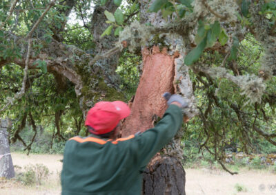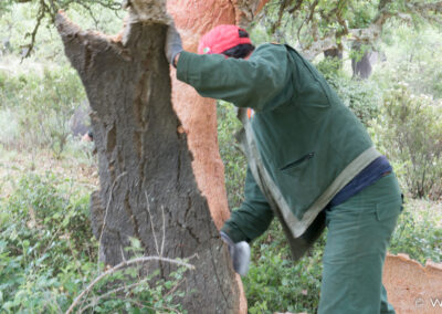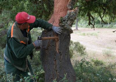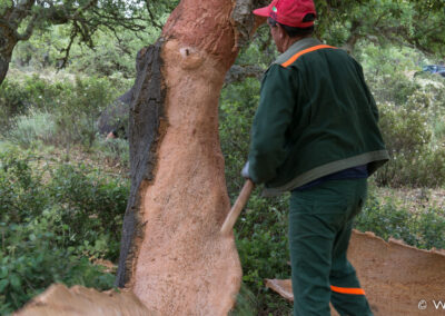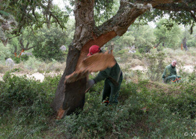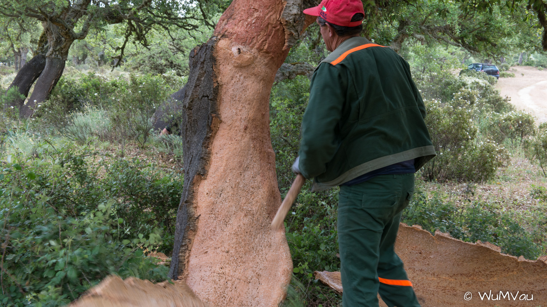 Am Ende der Tour können wir noch ein paar Arbeiter bei der Ernte der Korkrinde zusehen. Einer arbeitete, zwei lagen am Boden und rasteten sich aus und die Frau trug die Korkstücke auf einen Haufen zusammen….