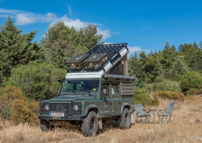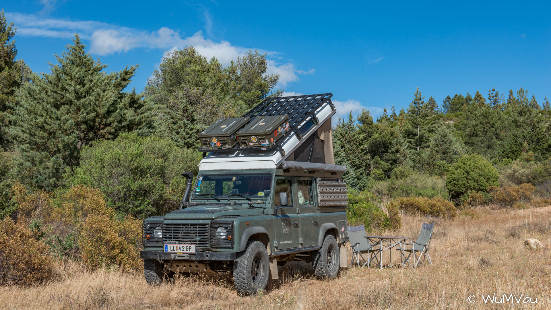 Wir sitzen nun bei der untergehenden Sonne vor dem Landy auf einer Lichtung. Richtung Süden und Osten Berge und Felsformationen, Richtung Westen und Norden Büsche und Wald. Man hört nur den Wind.