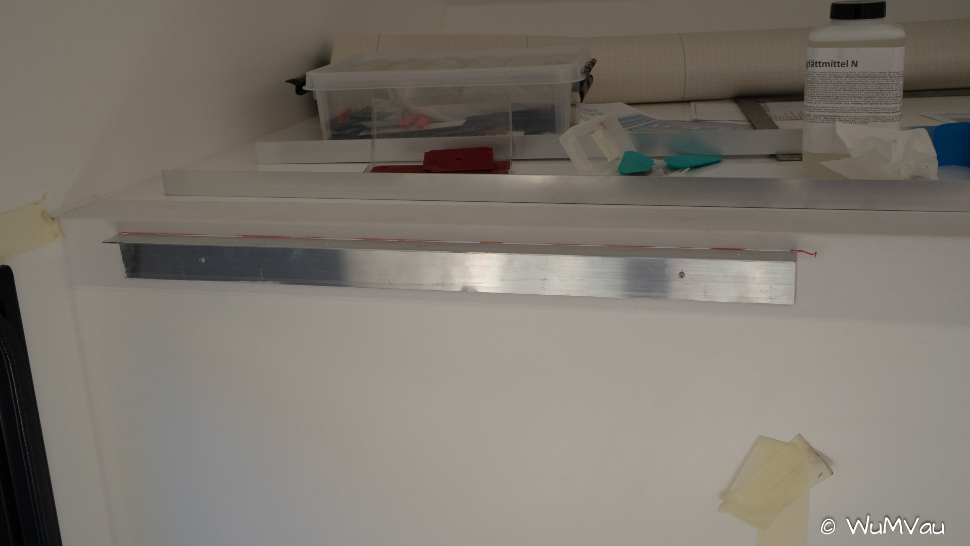 Die Innenwände sind Rigips – wo wir vermuten dass wir einmaletwas befestigen haben wir Verstärkungen eingebaut (hier für Handgriffe oder Reling) – Fotos mit Maßstab zum späteren auffinden