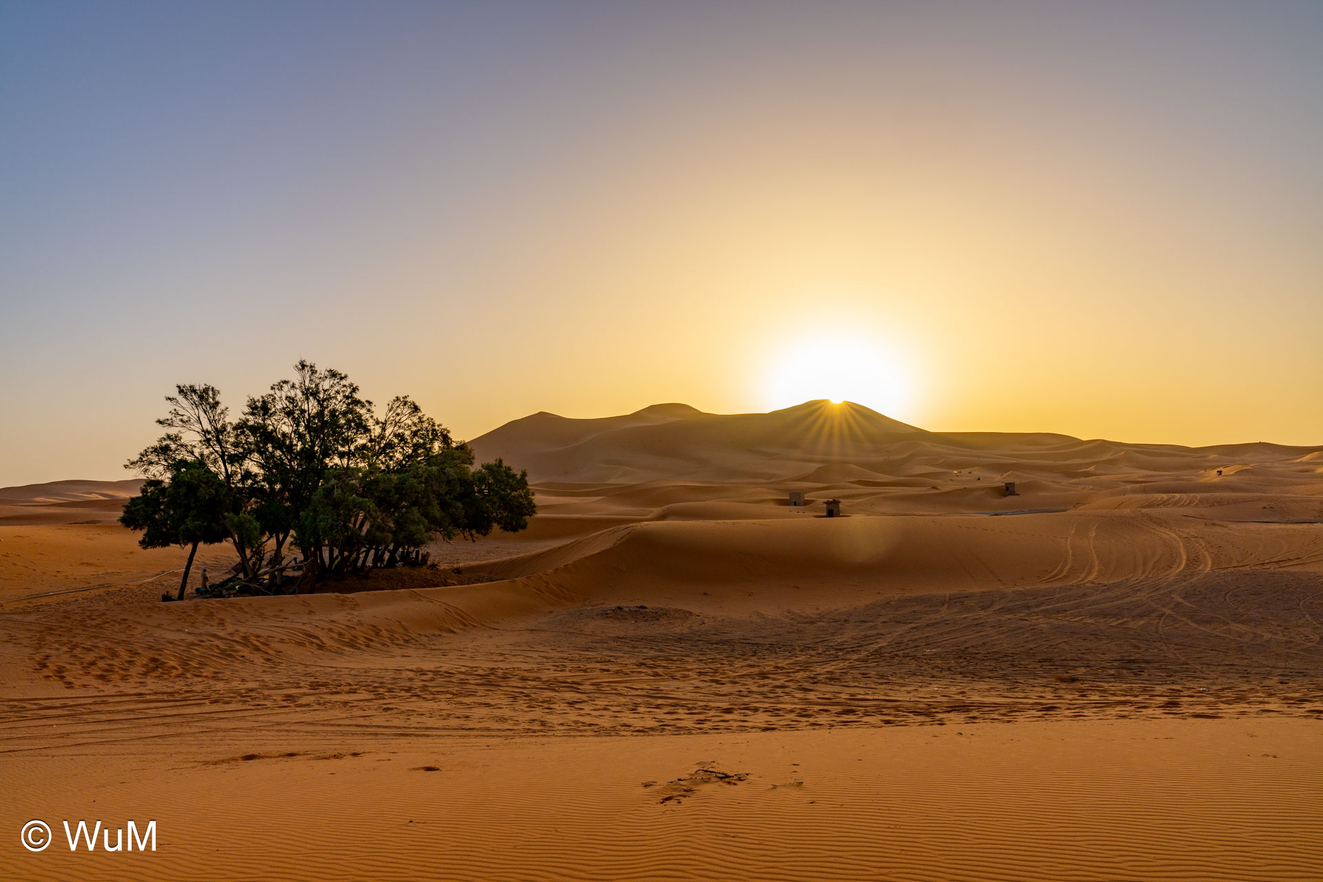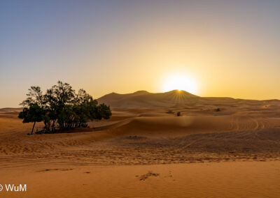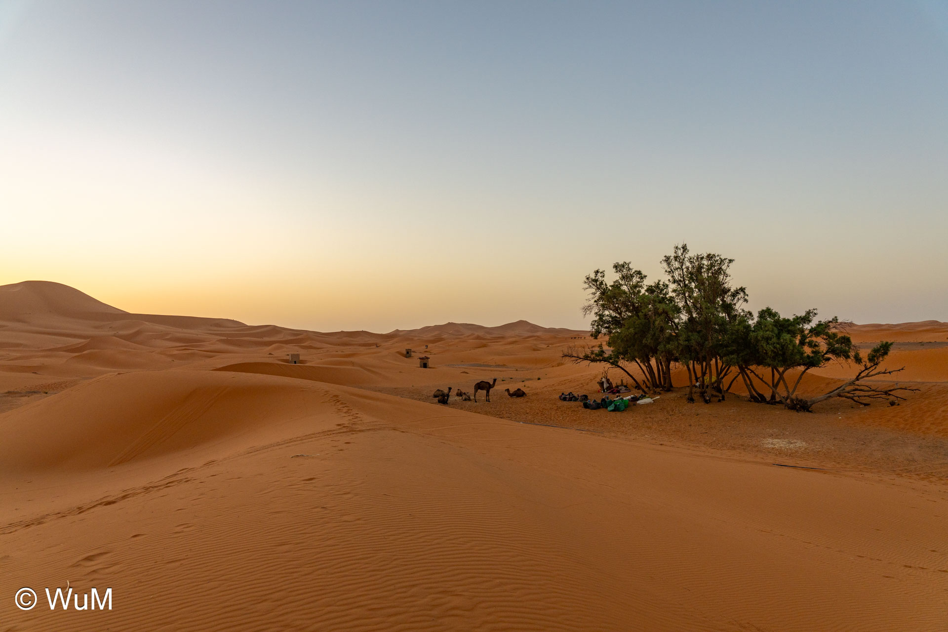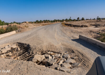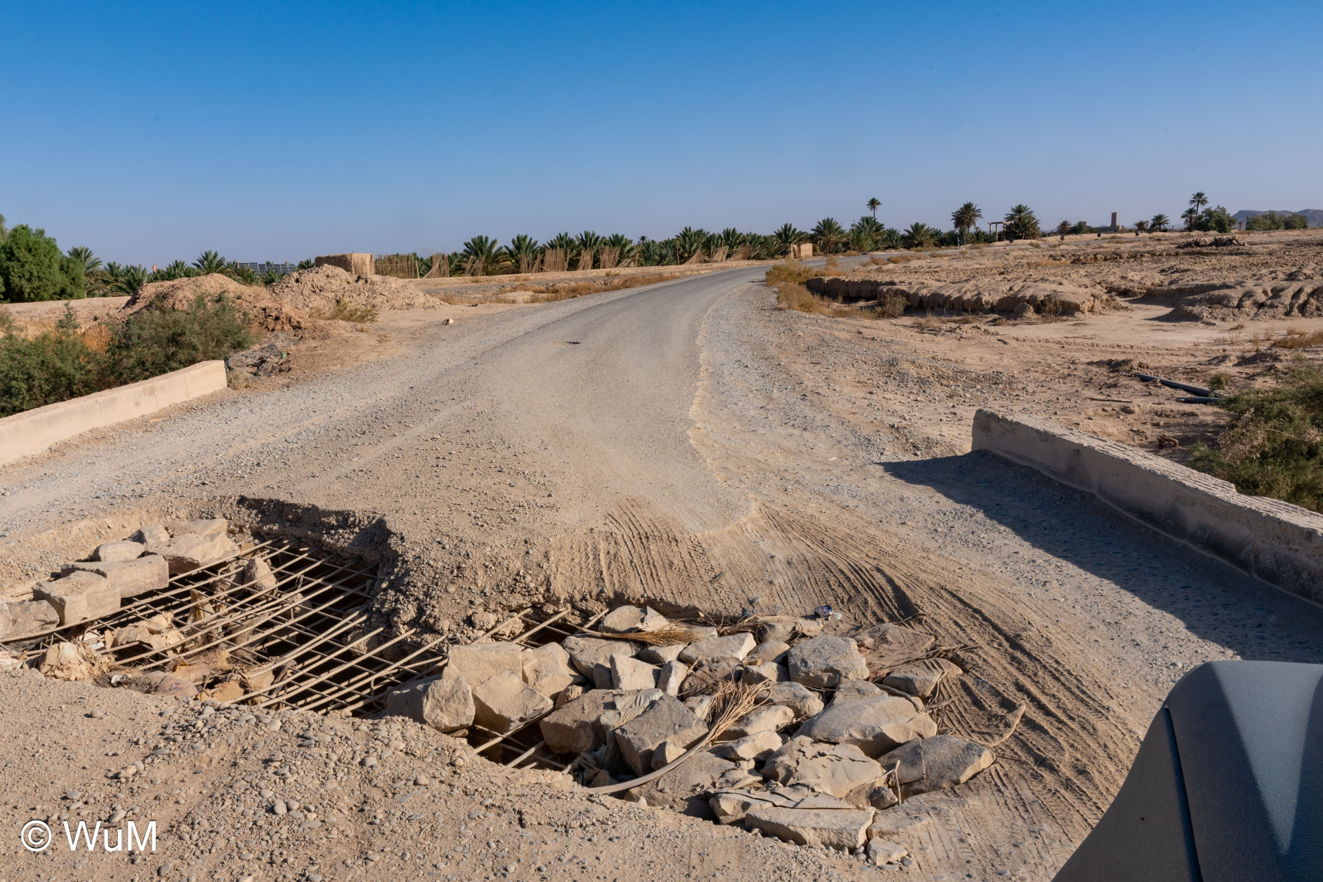 Noch vor Sonnenaufgang wandern wir ein wenig in den Dünen. Es ist noch angenehm kühl. Unter den wenigen Bäumen lagern Nomaden mit ihren Dromedaren. Die Sonne taucht über einer großen Düne auf. Dann gehts zum Frühstücken zurück zum Auto. Wir fahren durch das fruchtbare Tal des Ziz, wo sich Oase an Oase reiht. Die Straße ist nicht sehr breit und wir kommen zu einer Brücke, über die man eigentlich nicht mehr fahren möchte. Der Beton ist herausgebrochen und auf die Armierung wurden einfach ein paar Steine gelegt, damit man darüber fahren kann.