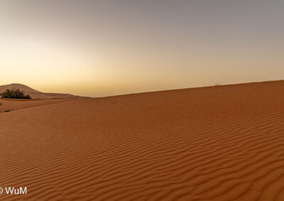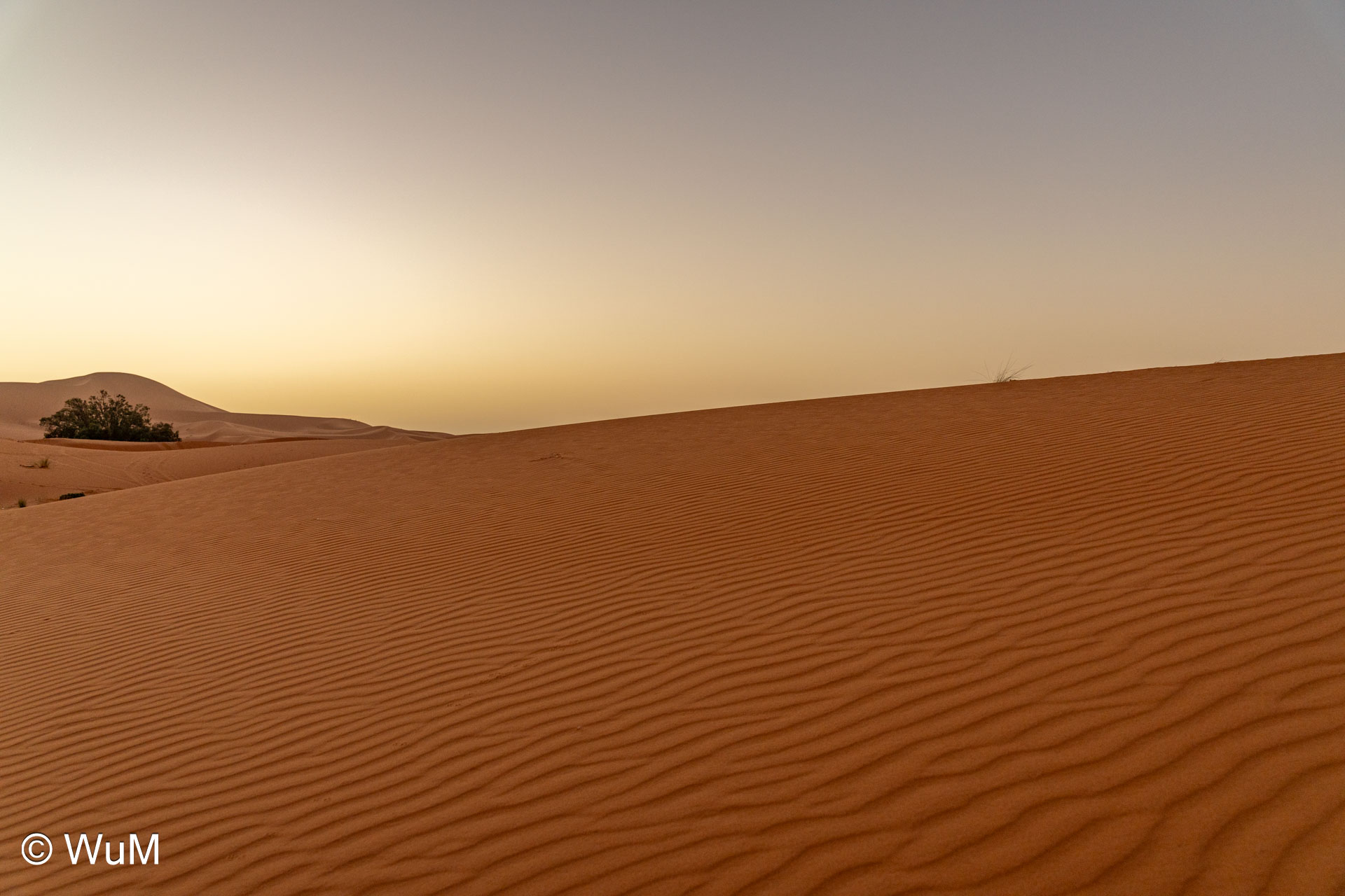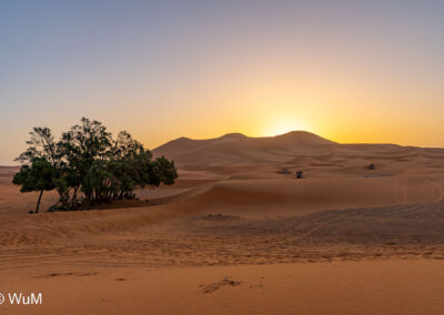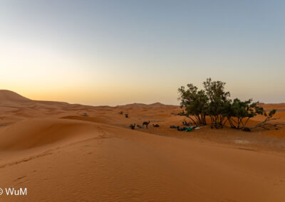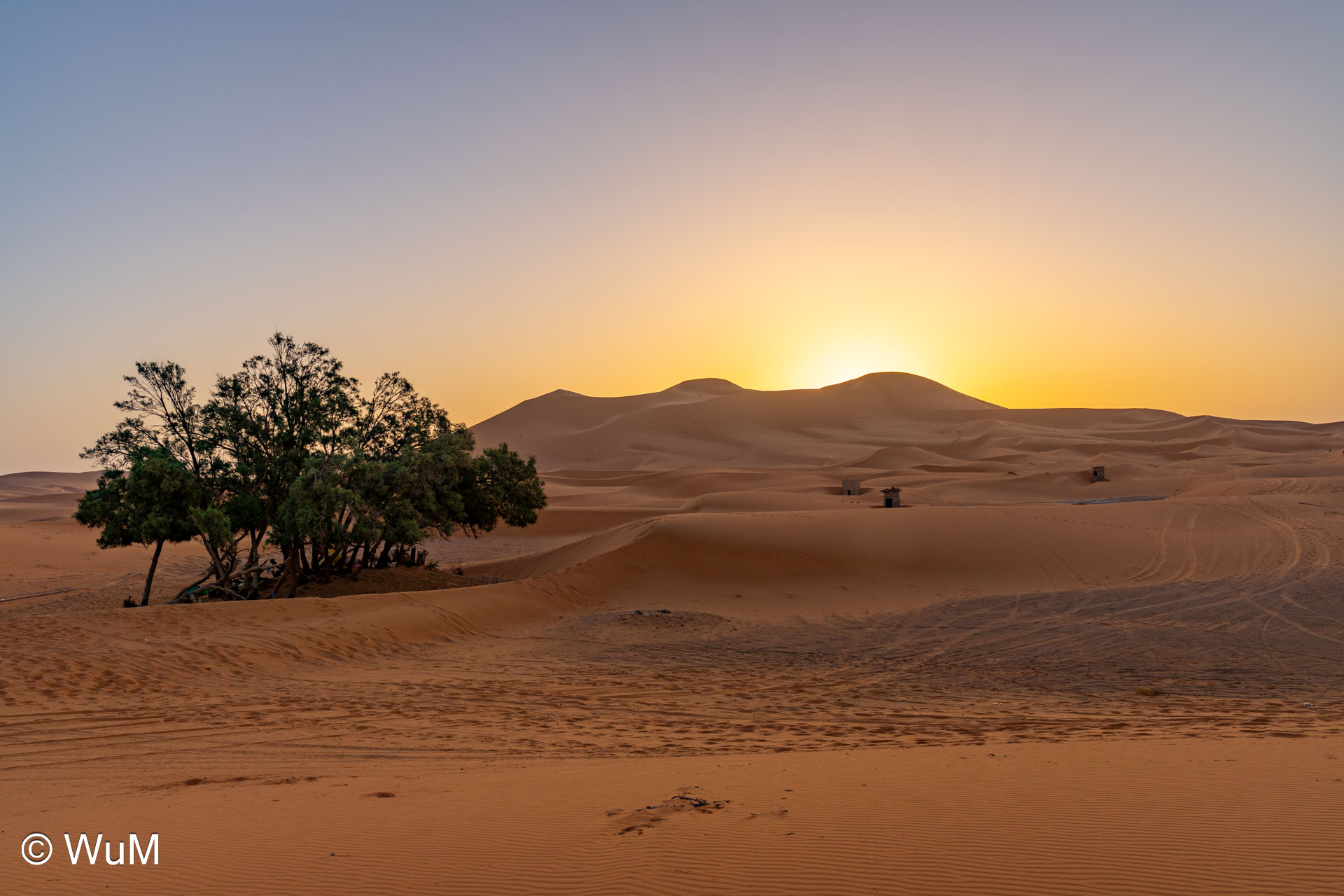 Noch vor Sonnenaufgang wandern wir ein wenig in den Dünen. Es ist noch angenehm kühl. Unter den wenigen Bäumen lagern Nomaden mit ihren Dromedaren. Die Sonne taucht über einer großen Düne auf. Dann gehts zum Frühstücken zurück zum Auto. Wir fahren durch das fruchtbare Tal des Ziz, wo sich Oase an Oase reiht. Die Straße ist nicht sehr breit und wir kommen zu einer Brücke, über die man eigentlich nicht mehr fahren möchte. Der Beton ist herausgebrochen und auf die Armierung wurden einfach ein paar Steine gelegt, damit man darüber fahren kann.