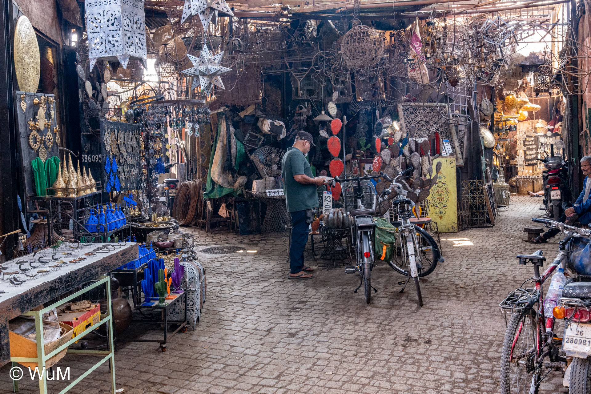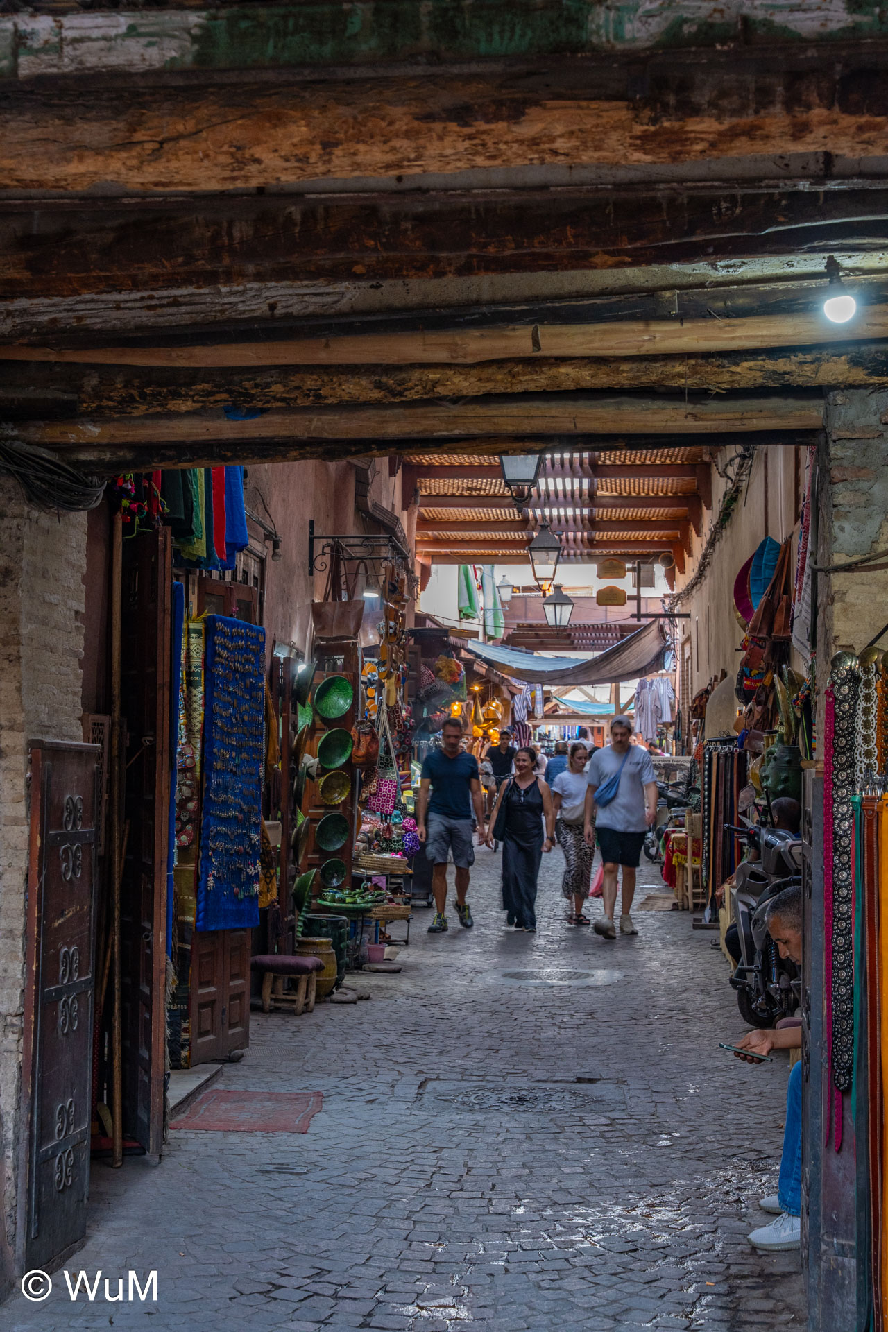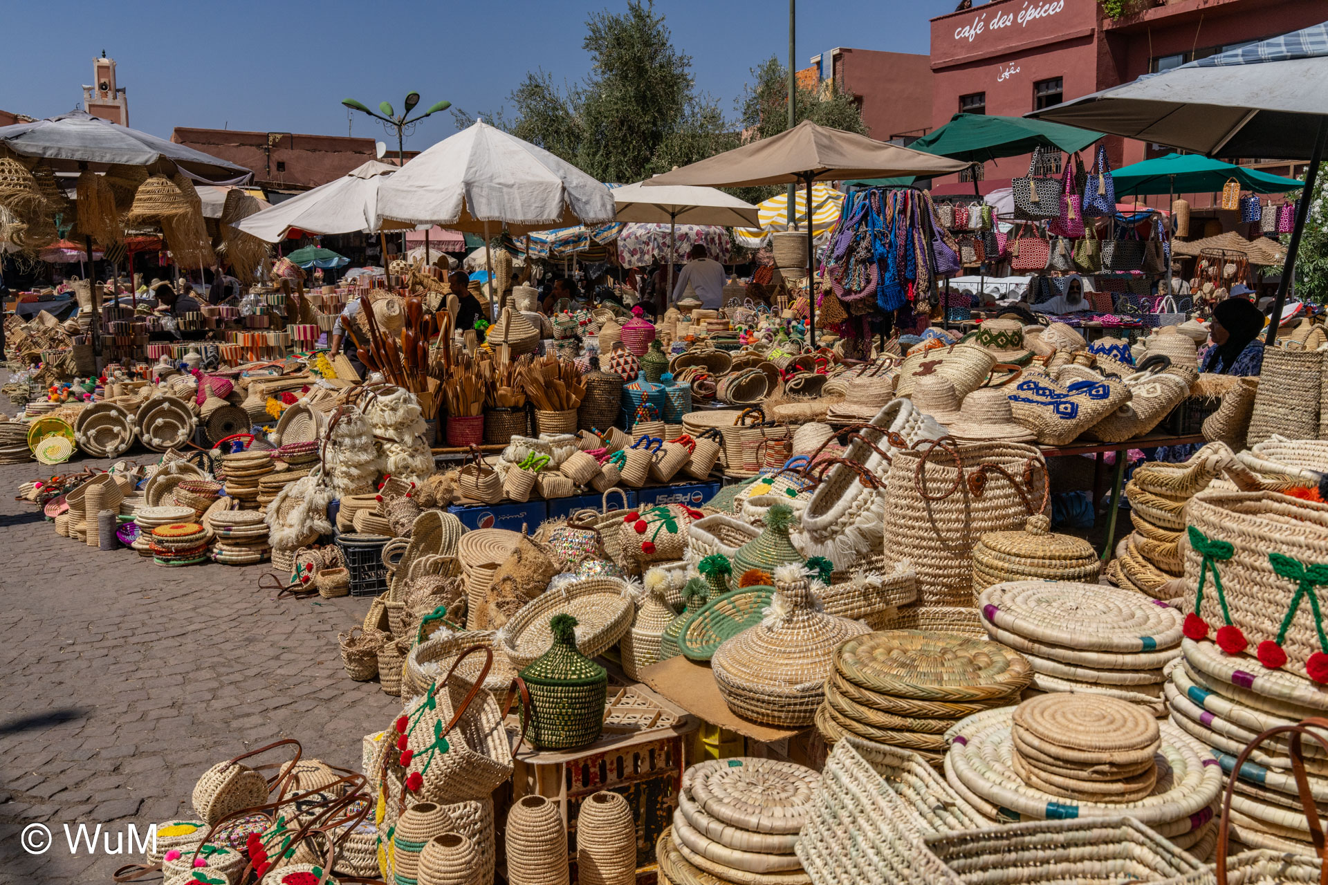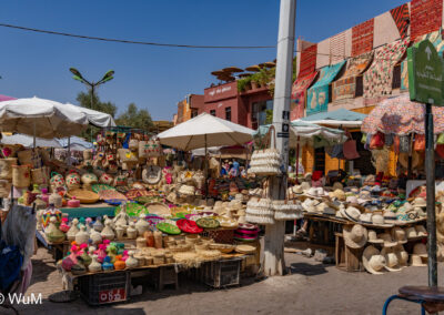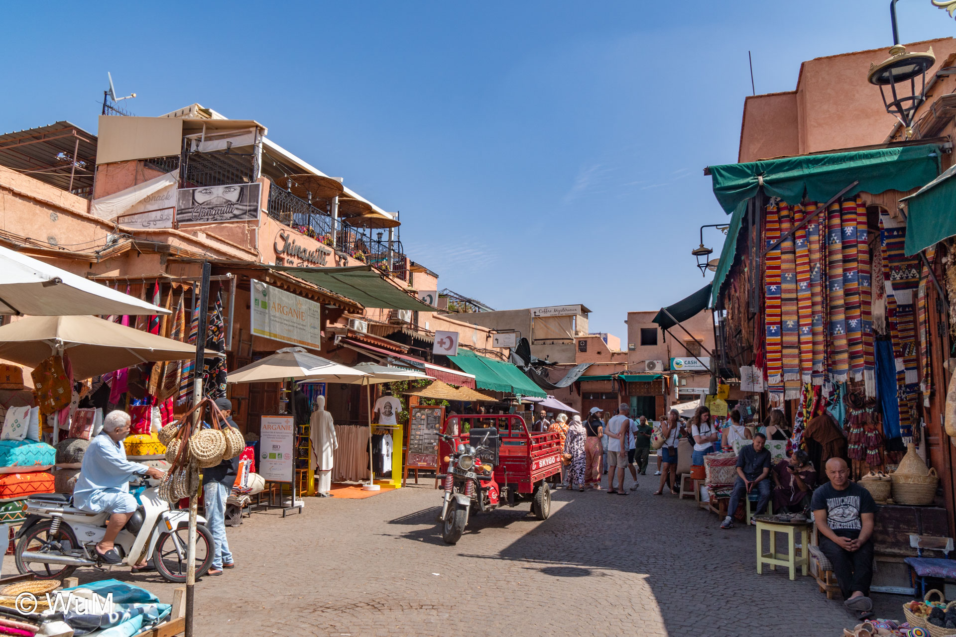Am nächsten Tag wollen wir den Jardin Majorette besuchen. Vor dem Eingang stehen bereits Schlangen und wir müssten für den nächsten freien Slot mehrere Stunden warten. Wir verzichten auf den Besuch und gehen durch die Souks wieder zurück zum Jemaa el Fna. Dabei gehen wir keine einzige Gasse, die wir am Vortag gegangen sind. Die Souks von Marrakech sind die größten Marrokos.