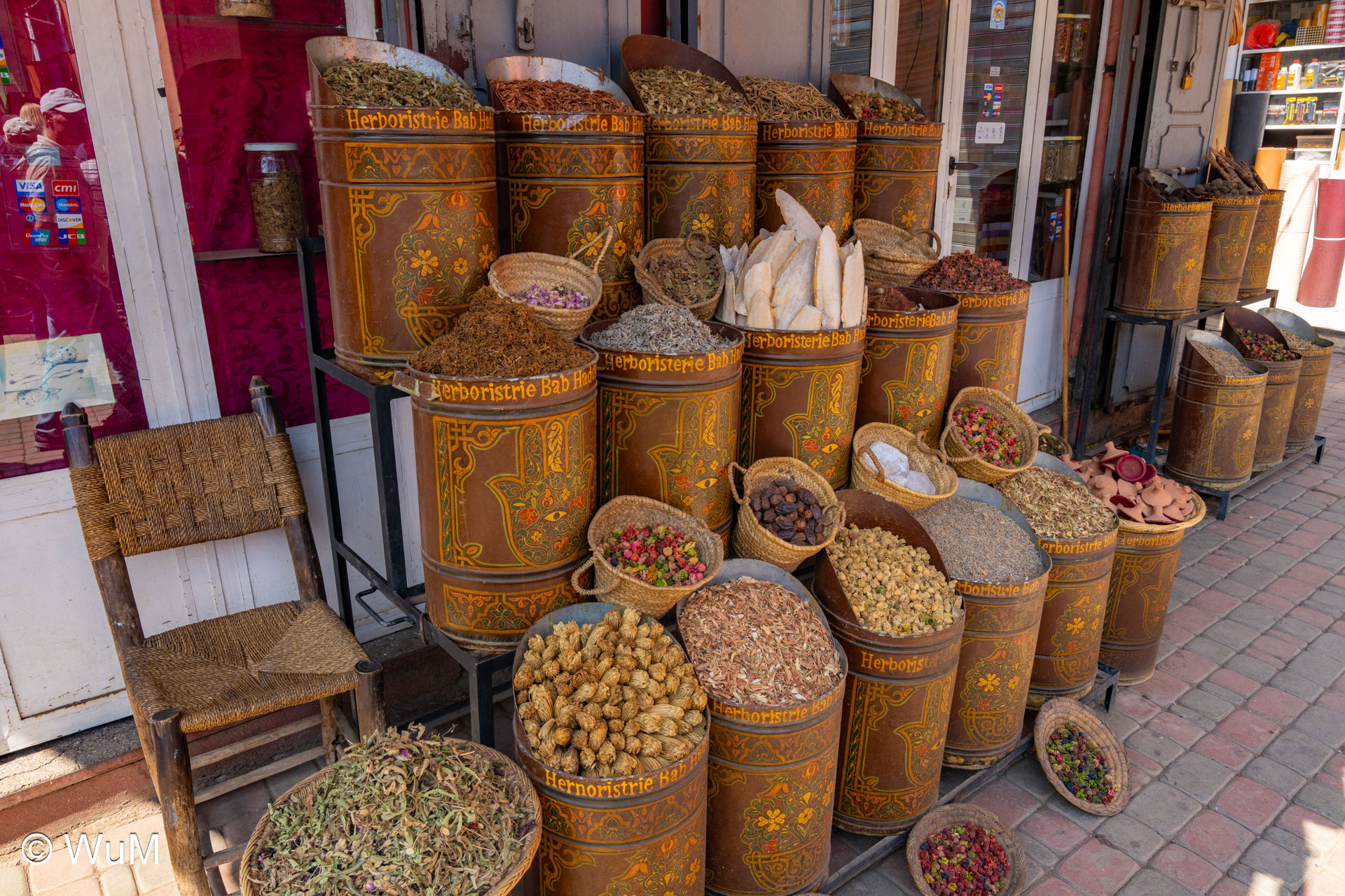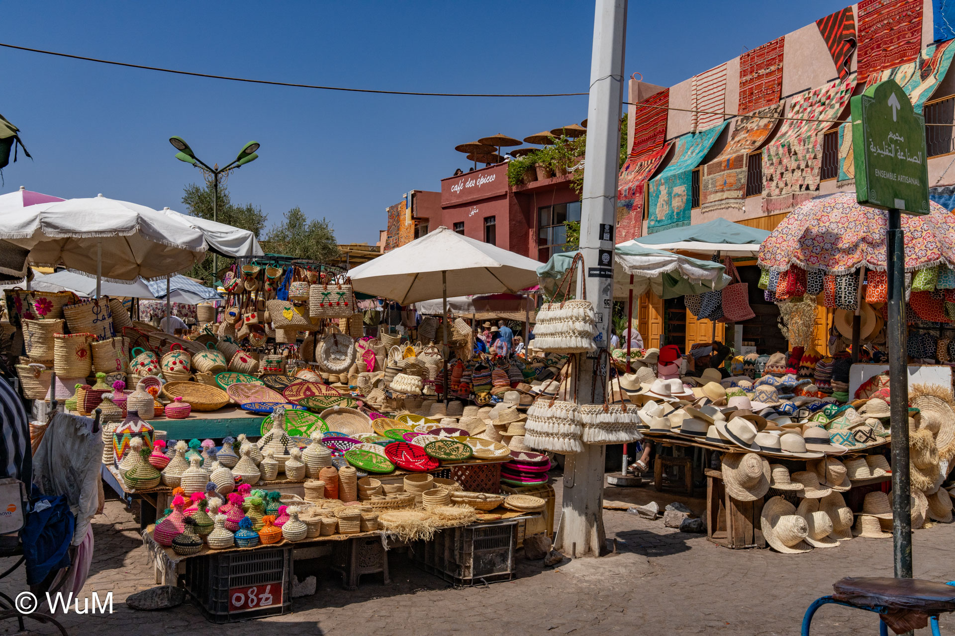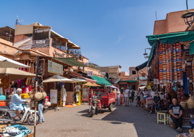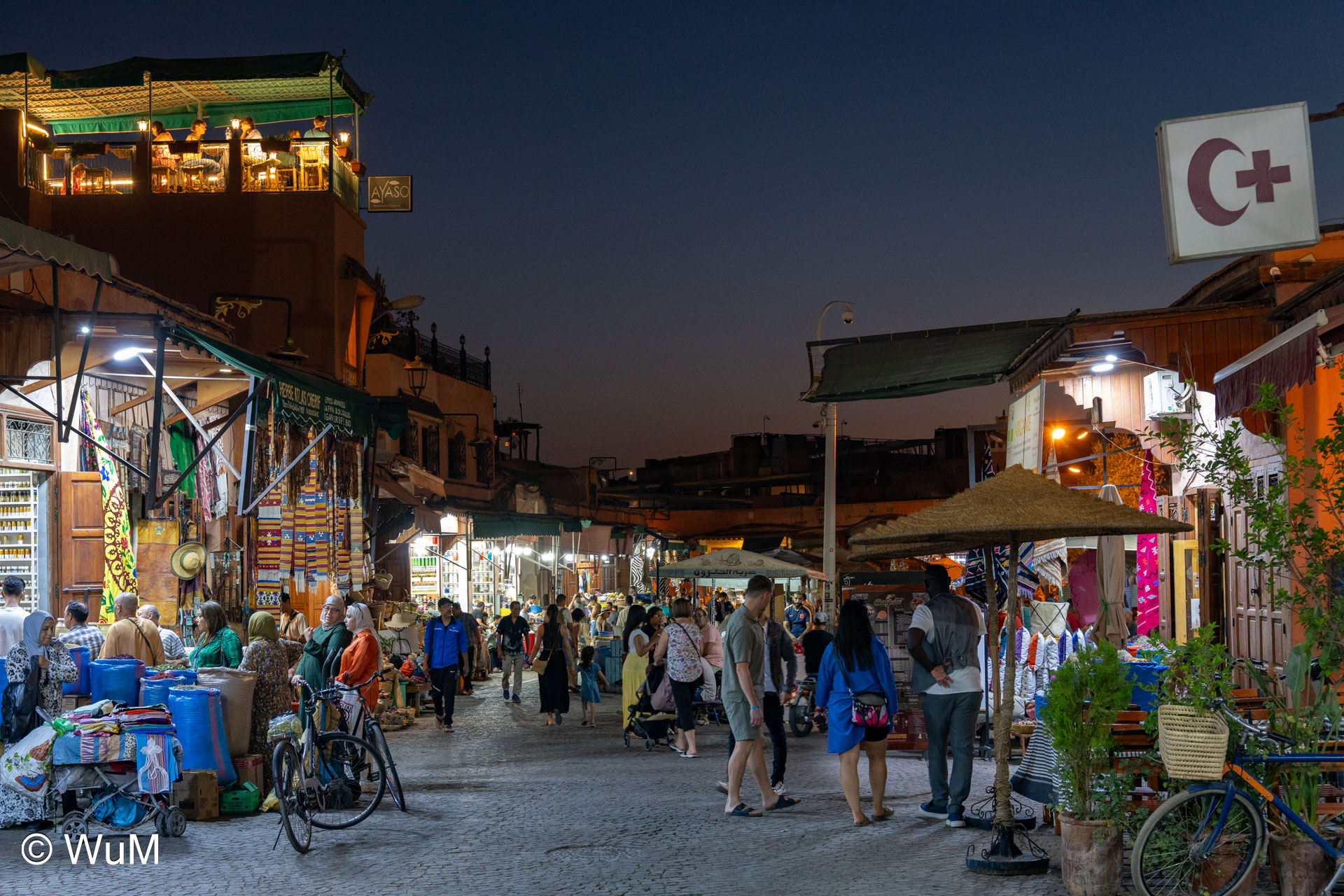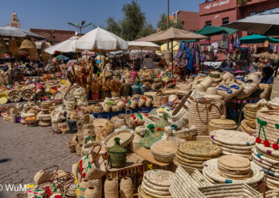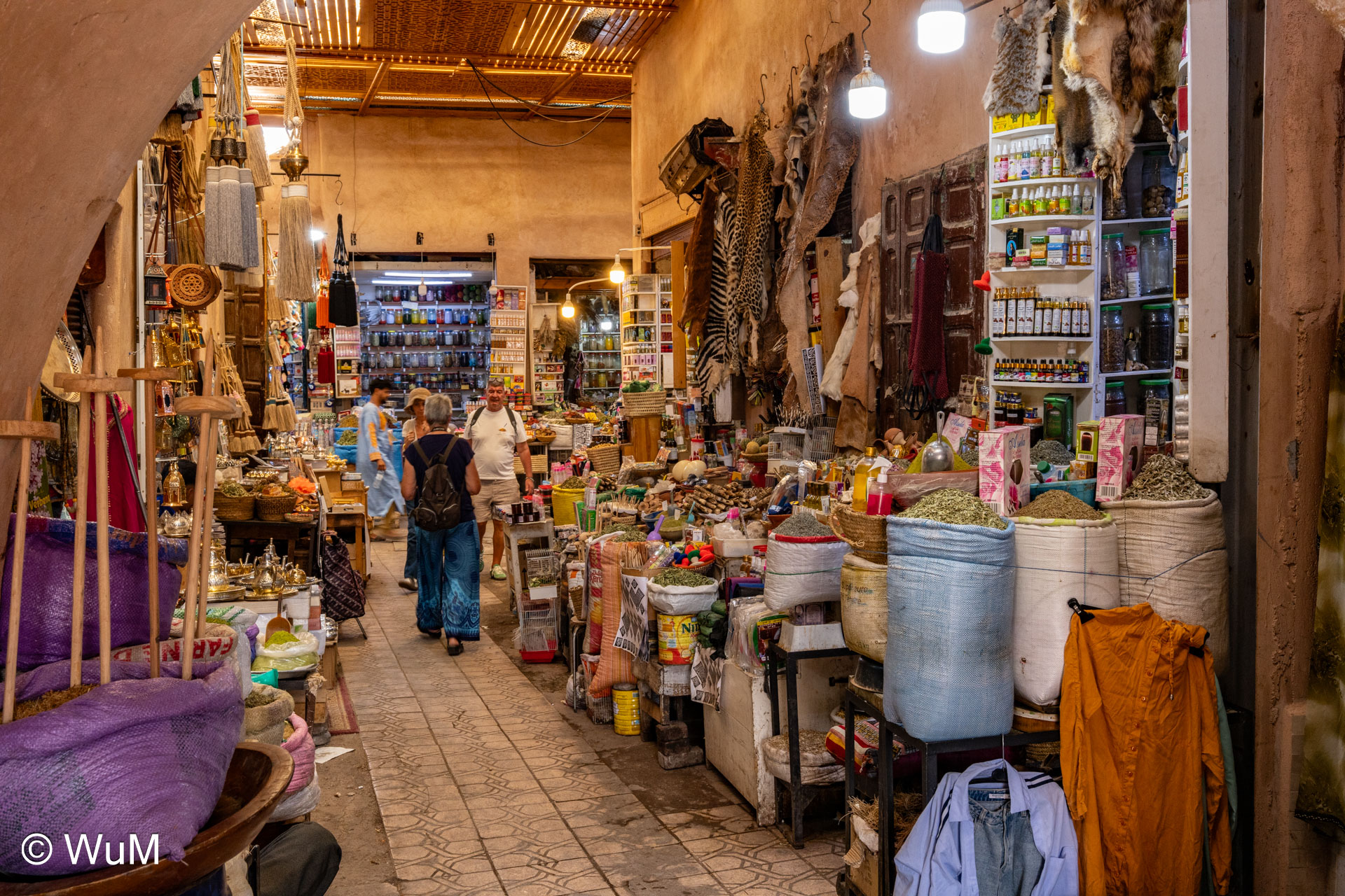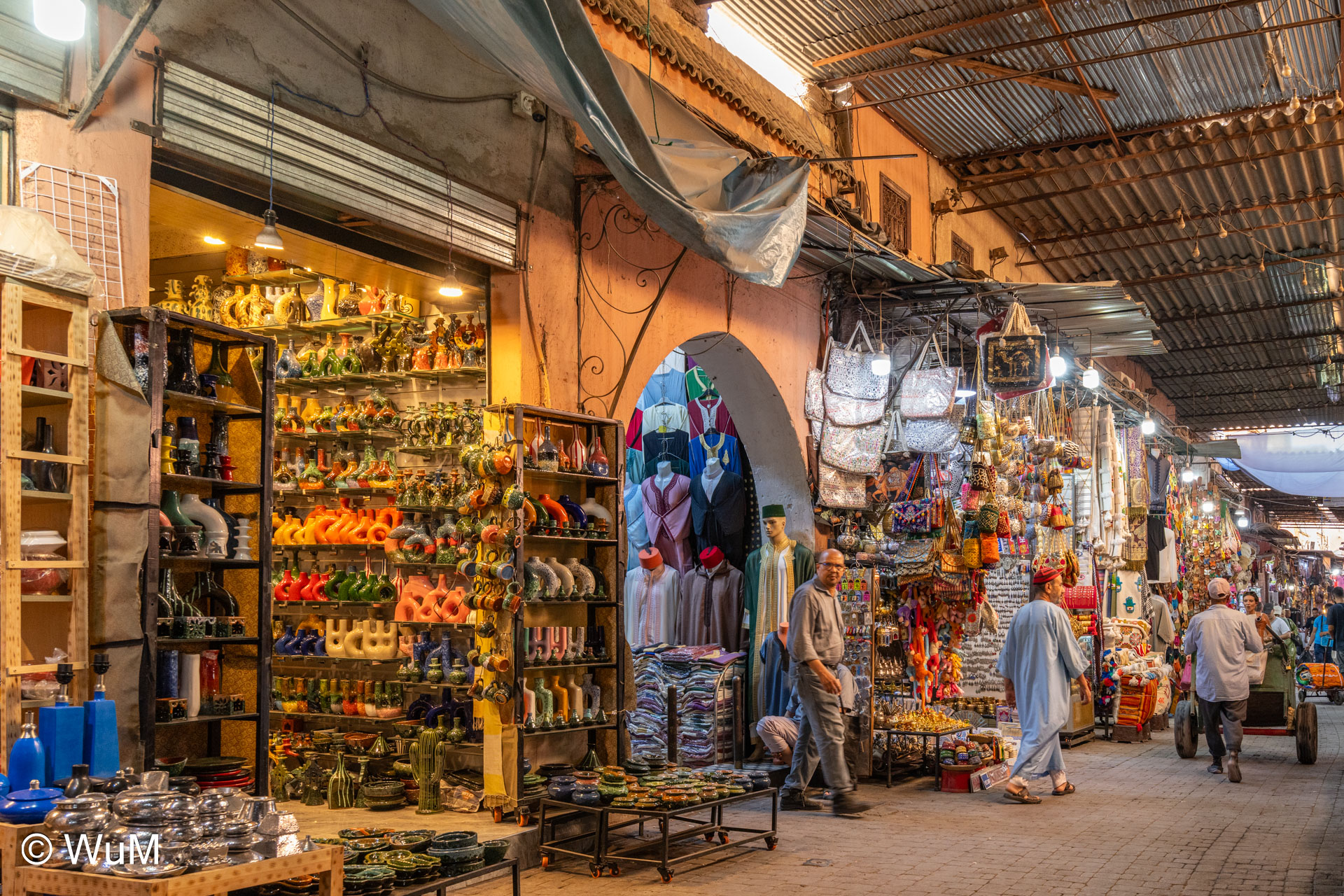 Am nächsten Tag wollen wir den Jardin Majorette besuchen. Vor dem Eingang stehen bereits Schlangen und wir müssten für den nächsten freien Slot mehrere Stunden warten. Wir verzichten auf den Besuch und gehen durch die Souks wieder zurück zum Jemaa el Fna. Dabei gehen wir keine einzige Gasse, die wir am Vortag gegangen sind. Die Souks von Marrakech sind die größten Marrokos.