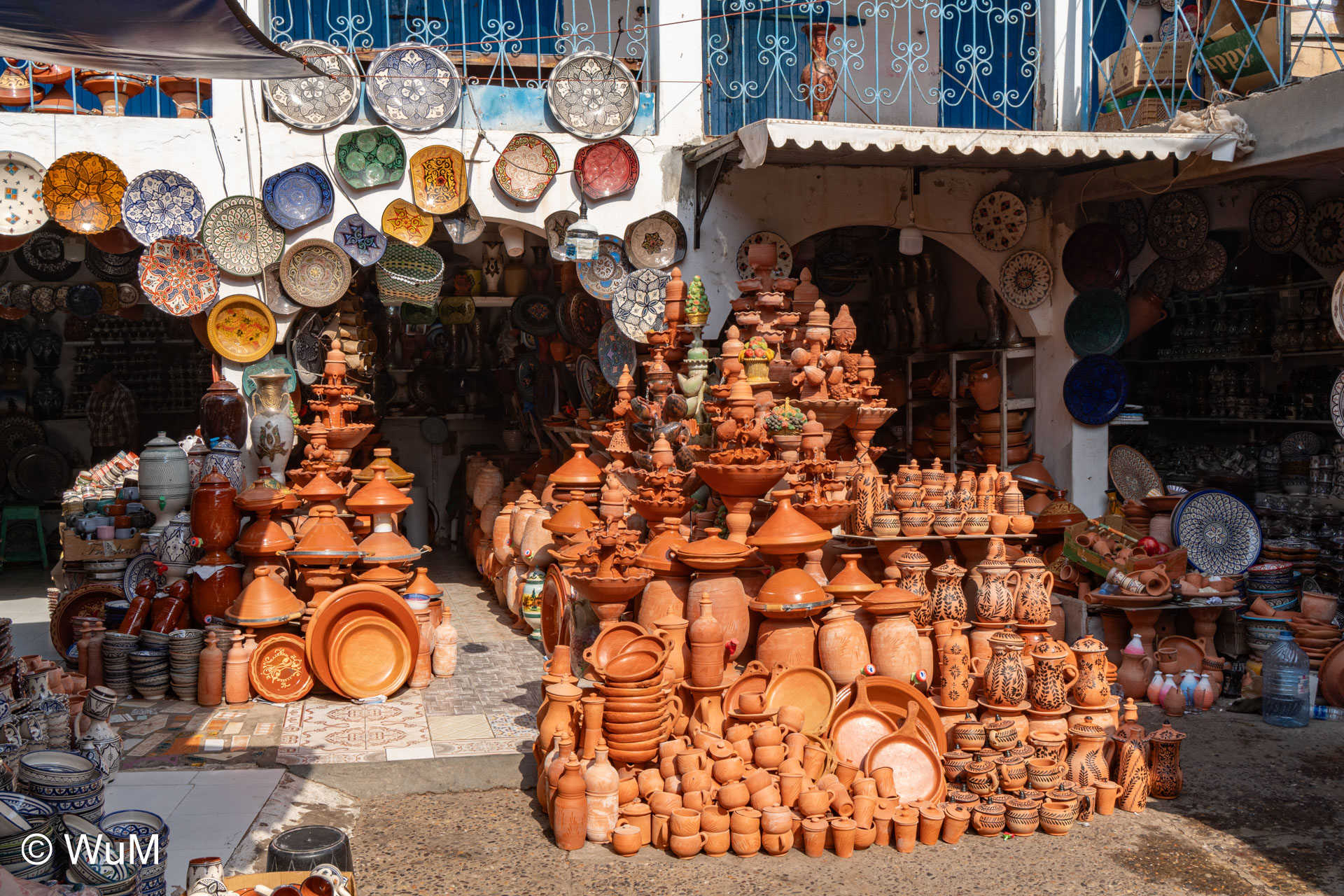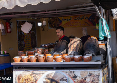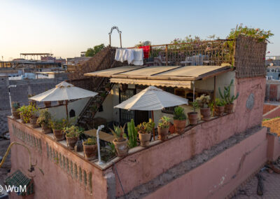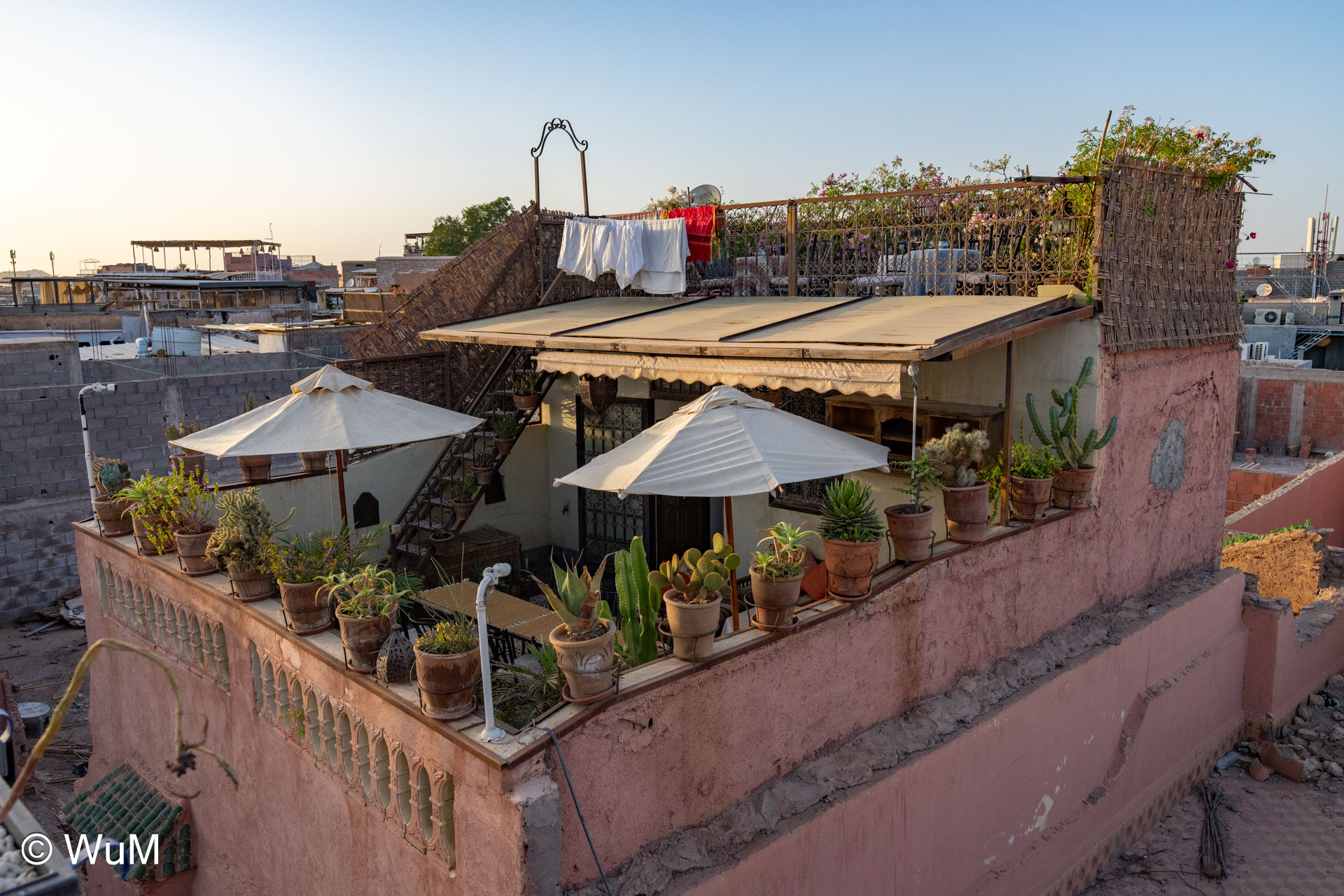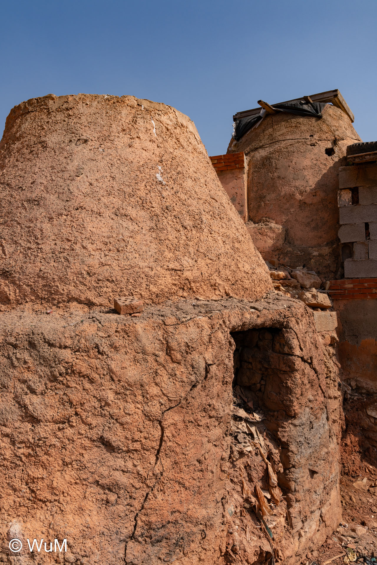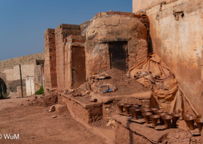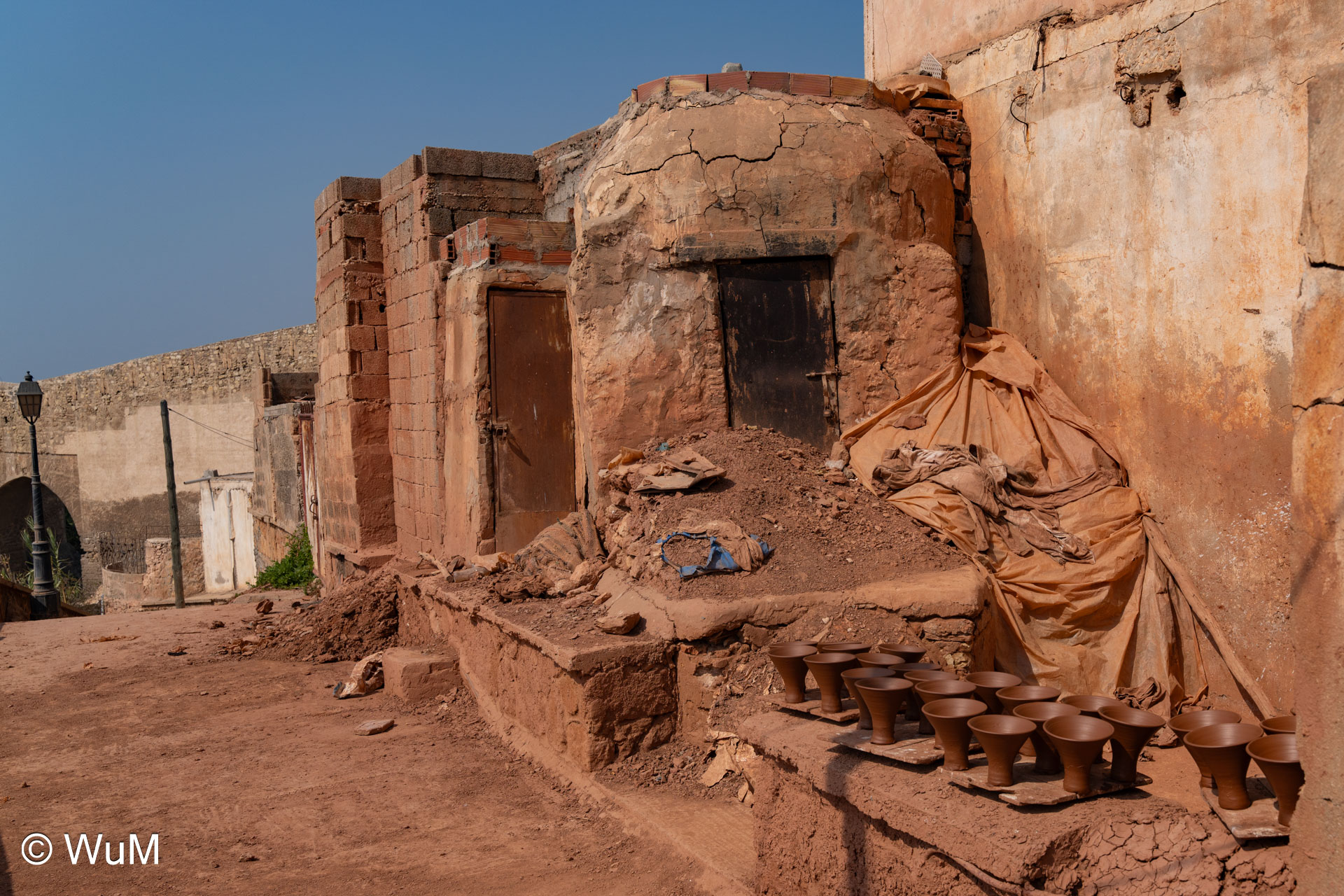 Am nächsten Tag geht es nach Safi. Die Stadt ist als marrokanische Hauptstadt der Töpferei bekannt. Wir wandern von der Medina zu den höher gelegenen Töpferwerkstätten hinauf. Man kann die Töpfer bei der Arbeit beobachten, sehen die aus Ton gefertigten Brennöfen und lassen uns den Arbeitsablauf erklären. Nach einem Kaffee gehts weg von der Küste nach Marrakech. Auf einem netten Campingplatz etwas außerhalb bleiben wir und fahren am späten Nachmittag mit dem Taxi zum Jemaa el Fna (Platz der Geköpften). Für die 20 Minuten Fahrt zahlen wir umgerechnet 10 Euro. Am Platz und in den Gassen der Medina ist viel los. Einheimische, Touristen, Mopeds, Fahrräder und Eselkarren sind in den Souks unterwegs. Auf der Dachterrasse eines der vielen Restaurants essen wir und genießen den Sonnenuntergang. Der Kellner versucht vergeblich, auf der Dachterrasse das Licht einzuschalten, was ihm aber nicht gelingt.