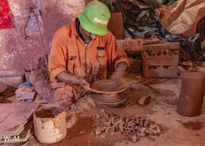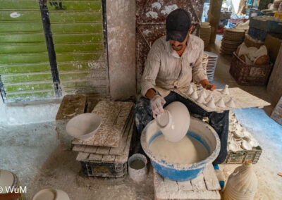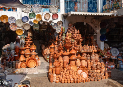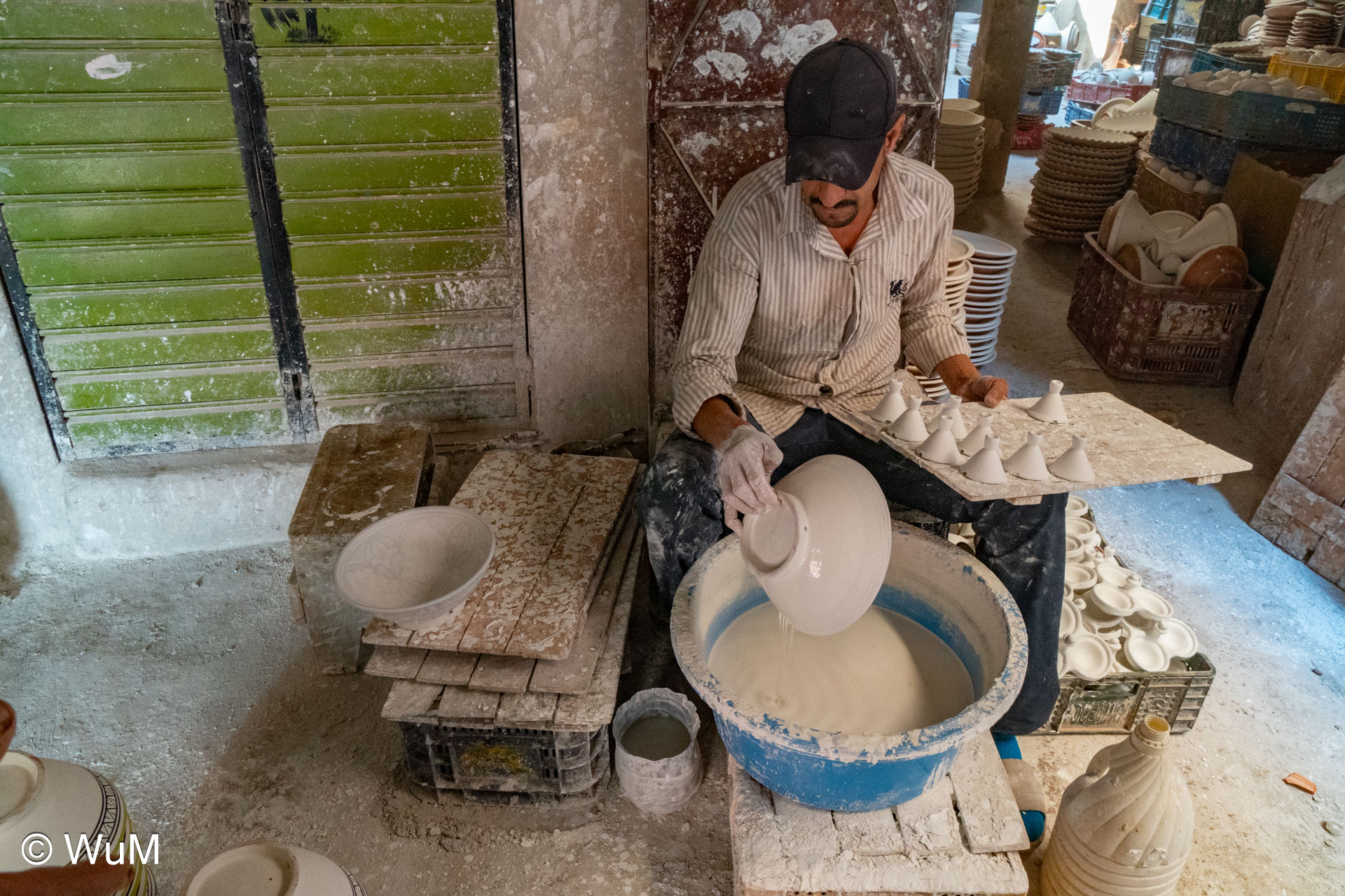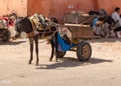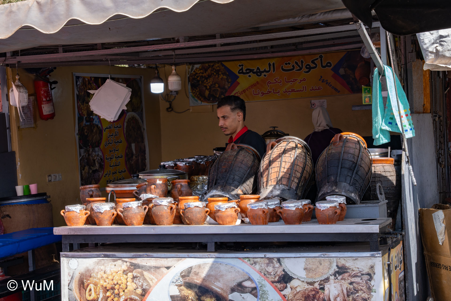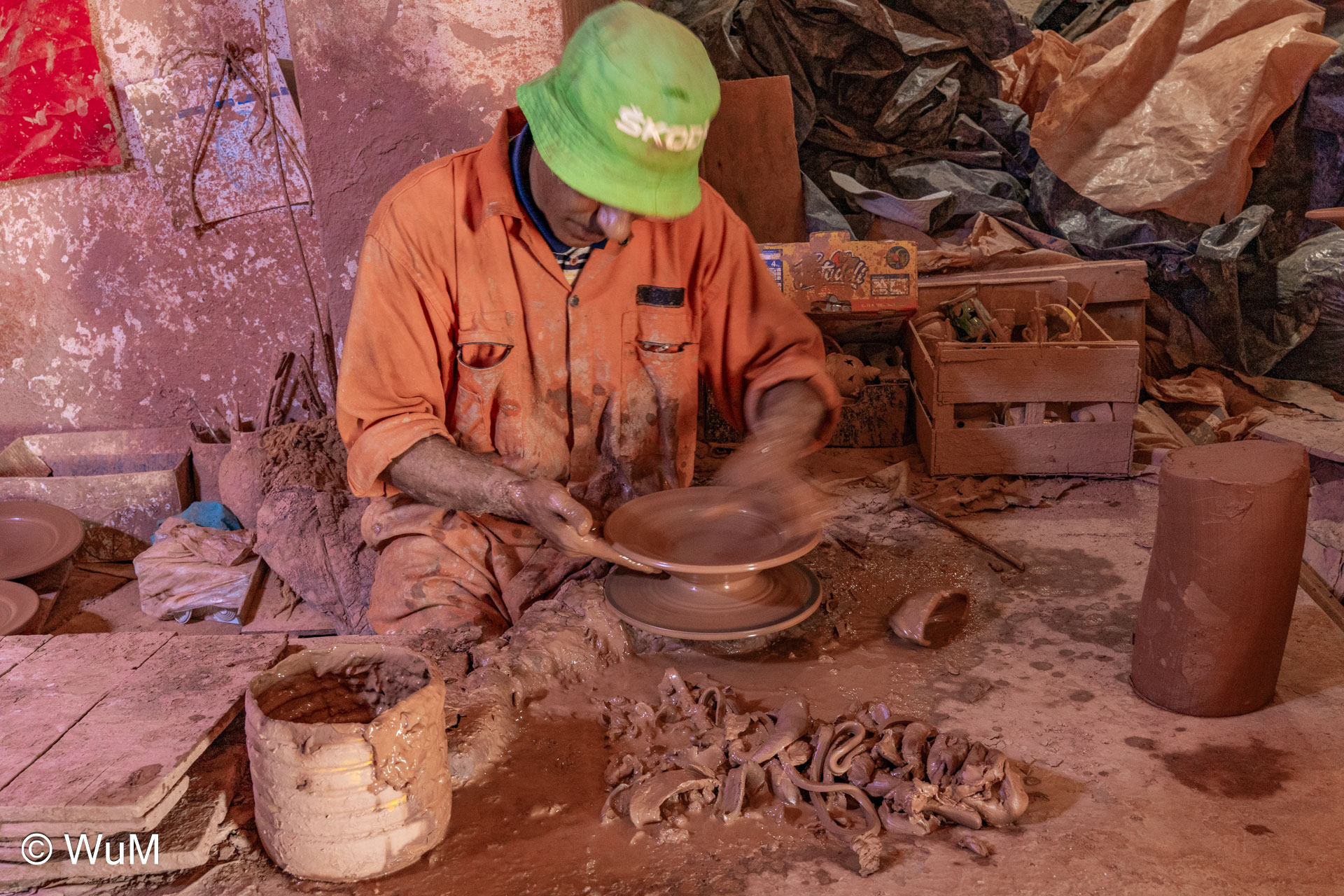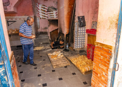 Am nächsten Tag geht es nach Safi. Die Stadt ist als marrokanische Hauptstadt der Töpferei bekannt. Wir wandern von der Medina zu den höher gelegenen Töpferwerkstätten hinauf. Man kann die Töpfer bei der Arbeit beobachten, sehen die aus Ton gefertigten Brennöfen und lassen uns den Arbeitsablauf erklären. Nach einem Kaffee gehts weg von der Küste nach Marrakech. Auf einem netten Campingplatz etwas außerhalb bleiben wir und fahren am späten Nachmittag mit dem Taxi zum Jemaa el Fna (Platz der Geköpften). Für die 20 Minuten Fahrt zahlen wir umgerechnet 10 Euro. Am Platz und in den Gassen der Medina ist viel los. Einheimische, Touristen, Mopeds, Fahrräder und Eselkarren sind in den Souks unterwegs. Auf der Dachterrasse eines der vielen Restaurants essen wir und genießen den Sonnenuntergang. Der Kellner versucht vergeblich, auf der Dachterrasse das Licht einzuschalten, was ihm aber nicht gelingt.