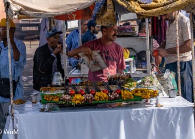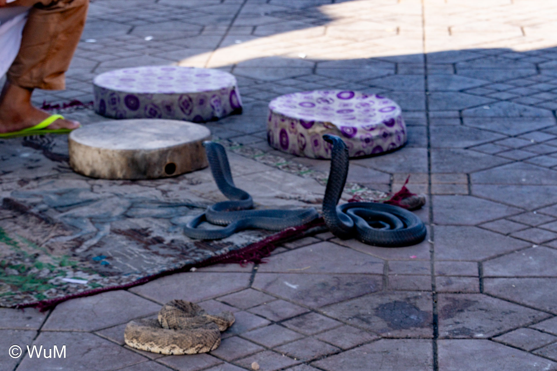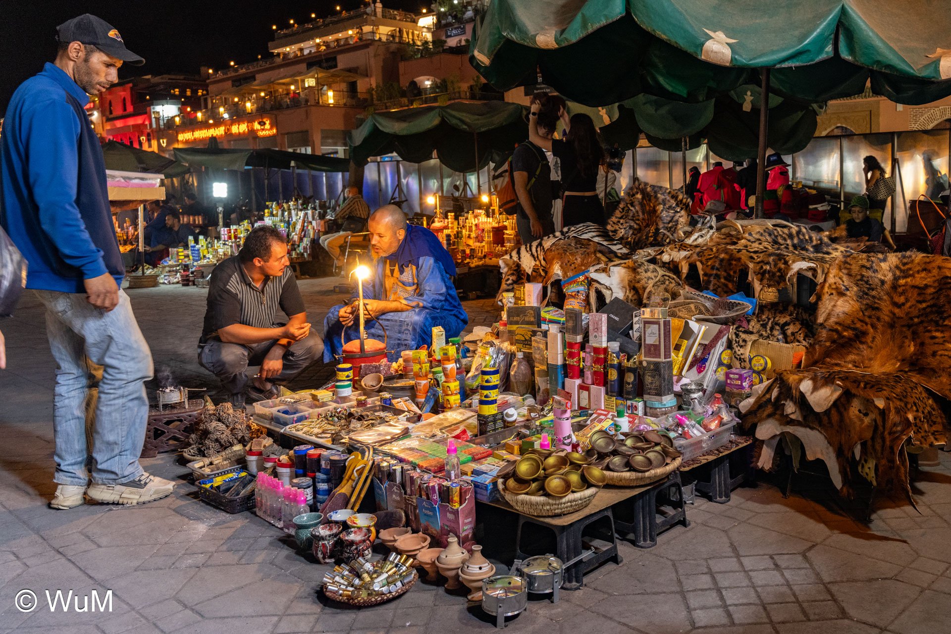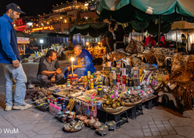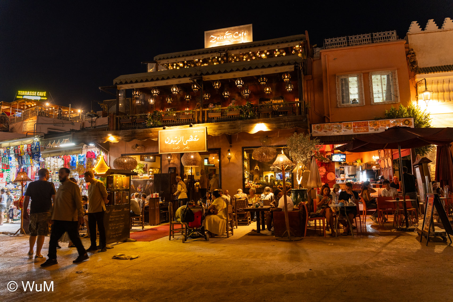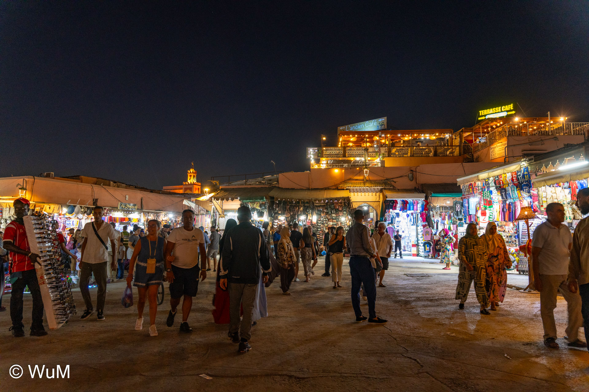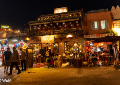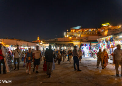 Wir suchen uns durch die Souks den Weg zurück zum Jemaa el Fna, hier ist jetzt noch mehr los als am Nachmittag, der Lärmpegel ist enorm. Die Schlangenbeschwörer haben Musikern und Tänzern Platz gemacht, zahlreiche Essensbuden sind dazugekommen. Wir lassen uns treiben und suchen uns irgendwann ein Taxi zurück zum Campingplatz. Die Fahrt entwickelt sich zu einem Höllenritt, der Fahrer ist ein verkappter Rennfahrer. Rote Ampeln, Spurmarkierungen und andere Fahrzeuge sind ihm ziemlich egal. Wir kommen aber trotzdem heil am Campingplatz an.