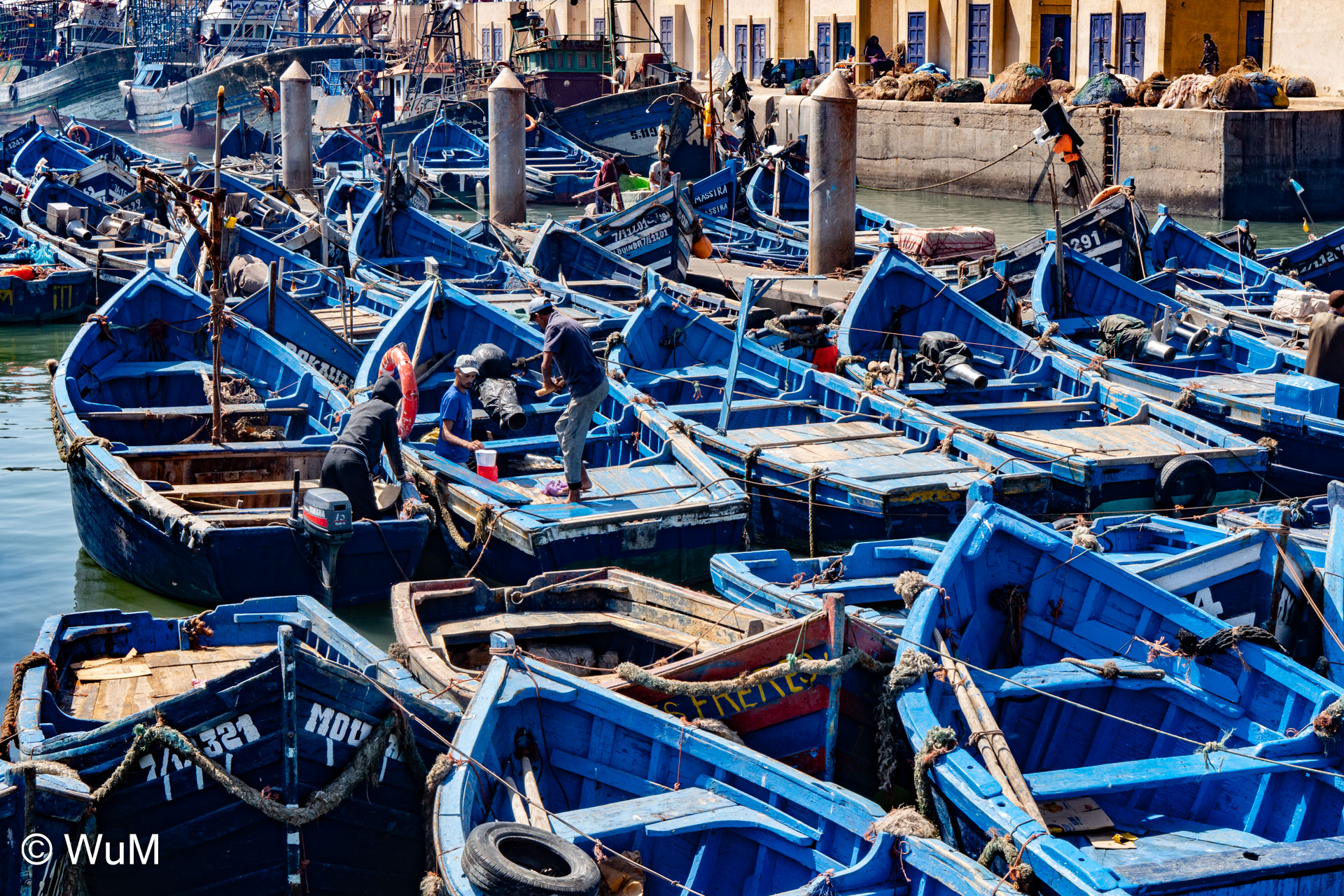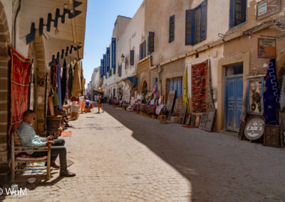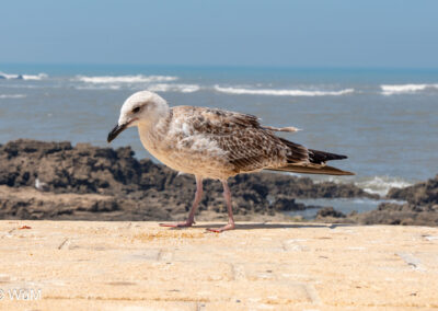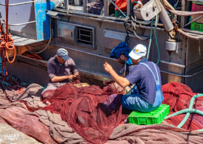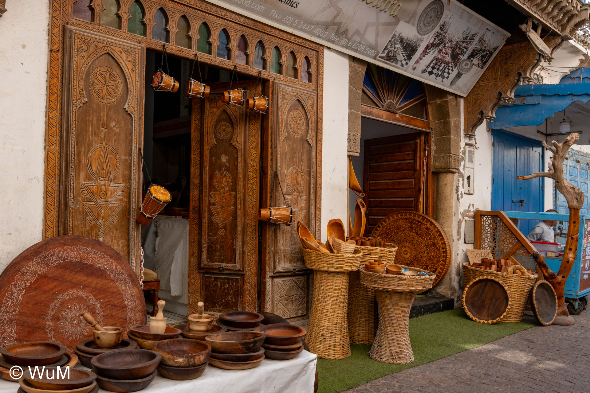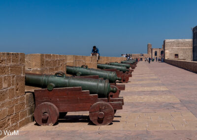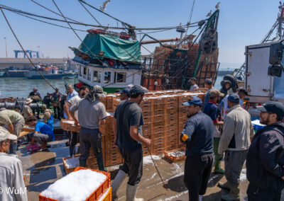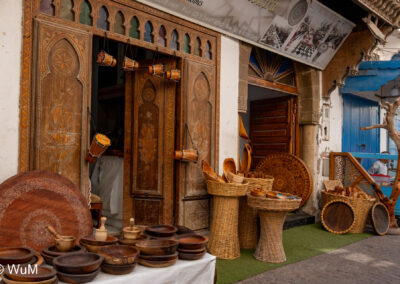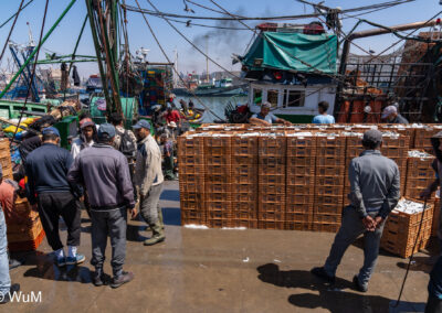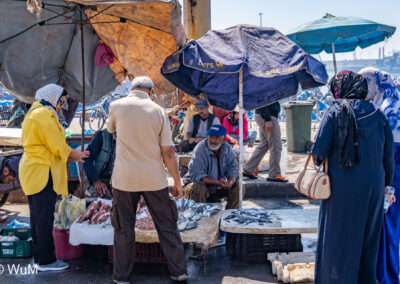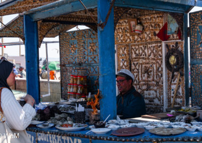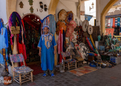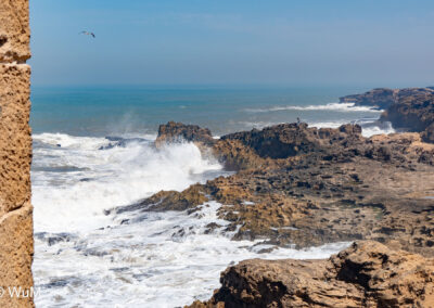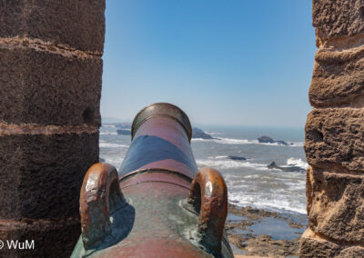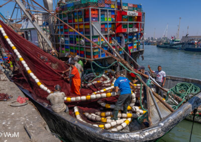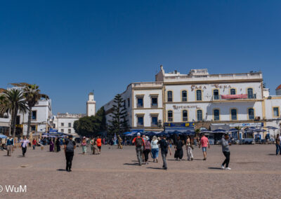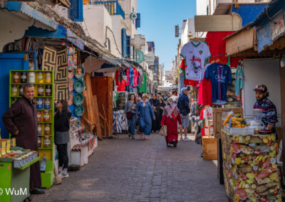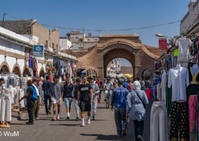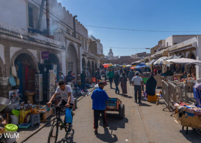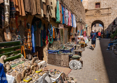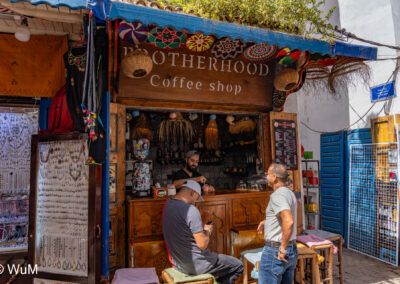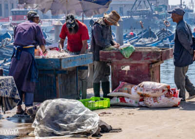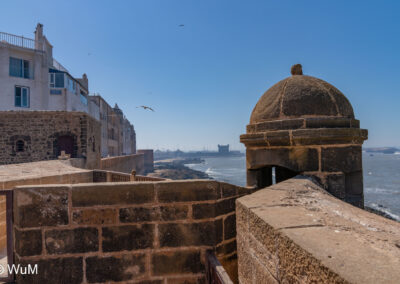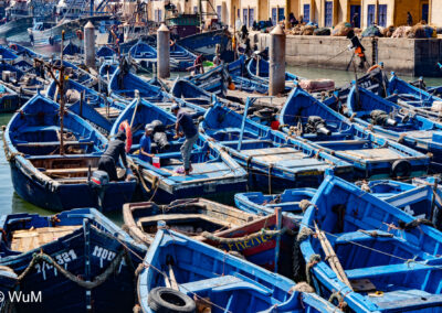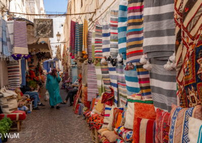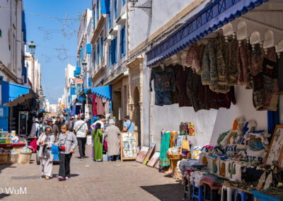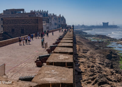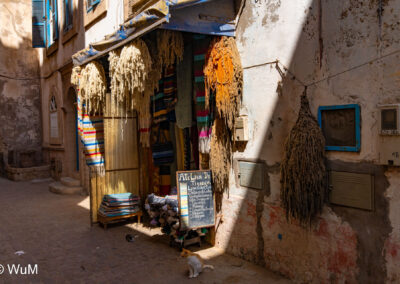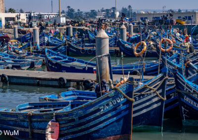 Die Fahrt von Marrakech Richtung Küste ist anfangs etwas mühselig. Viele Orte und immer wieder LKWs verhindern ein flottes Weiterkommen. Die Orte sind typisch marokkanisch mit den kleinen Läden und Werkstätten und dem üblichen Durcheinander. Nach drei Stunden Fahrt für 187 km kommen wir in Essaouira an. Nachdem wir einen Parkplatz gefunden haben, gehen wir durch die wunderschöne Altstadt mit den weißen Häusern und blauen Fensterläden Richtung Hafen. Das Angebot in den Läden hat sich bereits ein wenig geändert – wir sind weiter im Süden Marokkos. Von der von den Portugiesen errichteten Küstenbefestigung hat man einen schönen Ausblick auf die raue Küste. Entlang der Stadtmauer wandern wir zum Fischerhafen. Hier herrscht geschäftiges Treiben. Die Fischerboote werden entladen und an den Ständen wird der Fisch auch gleich verkauft oder zum Verzehr angeboten. Wir beobachten das Entladen der Fischerboote und schauen beim Flicken der Netze zu.