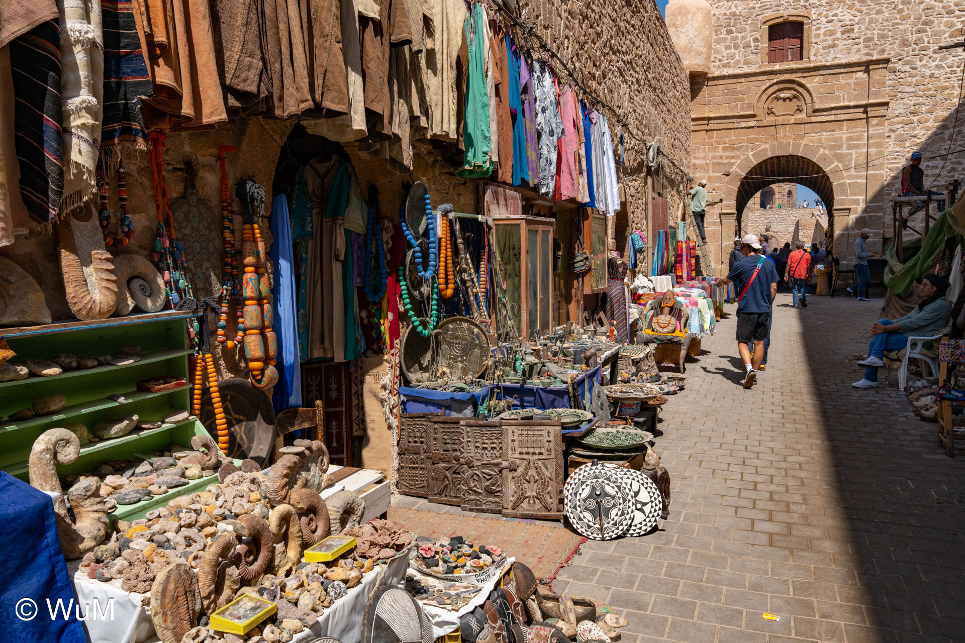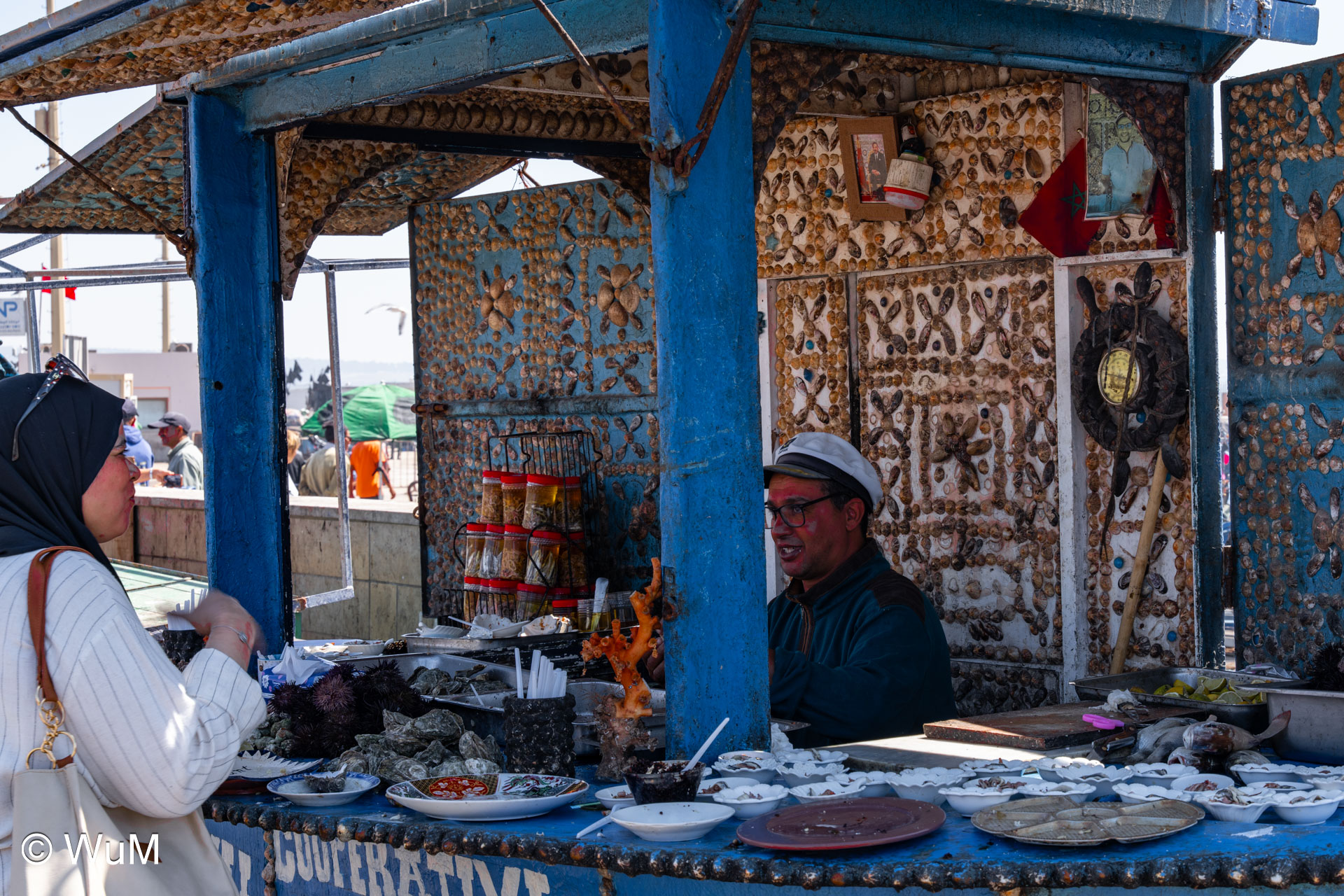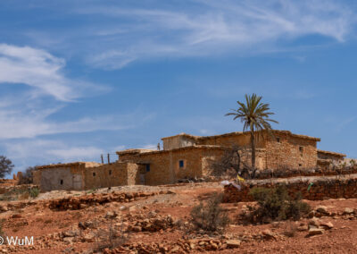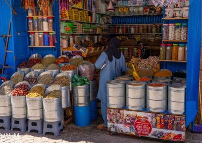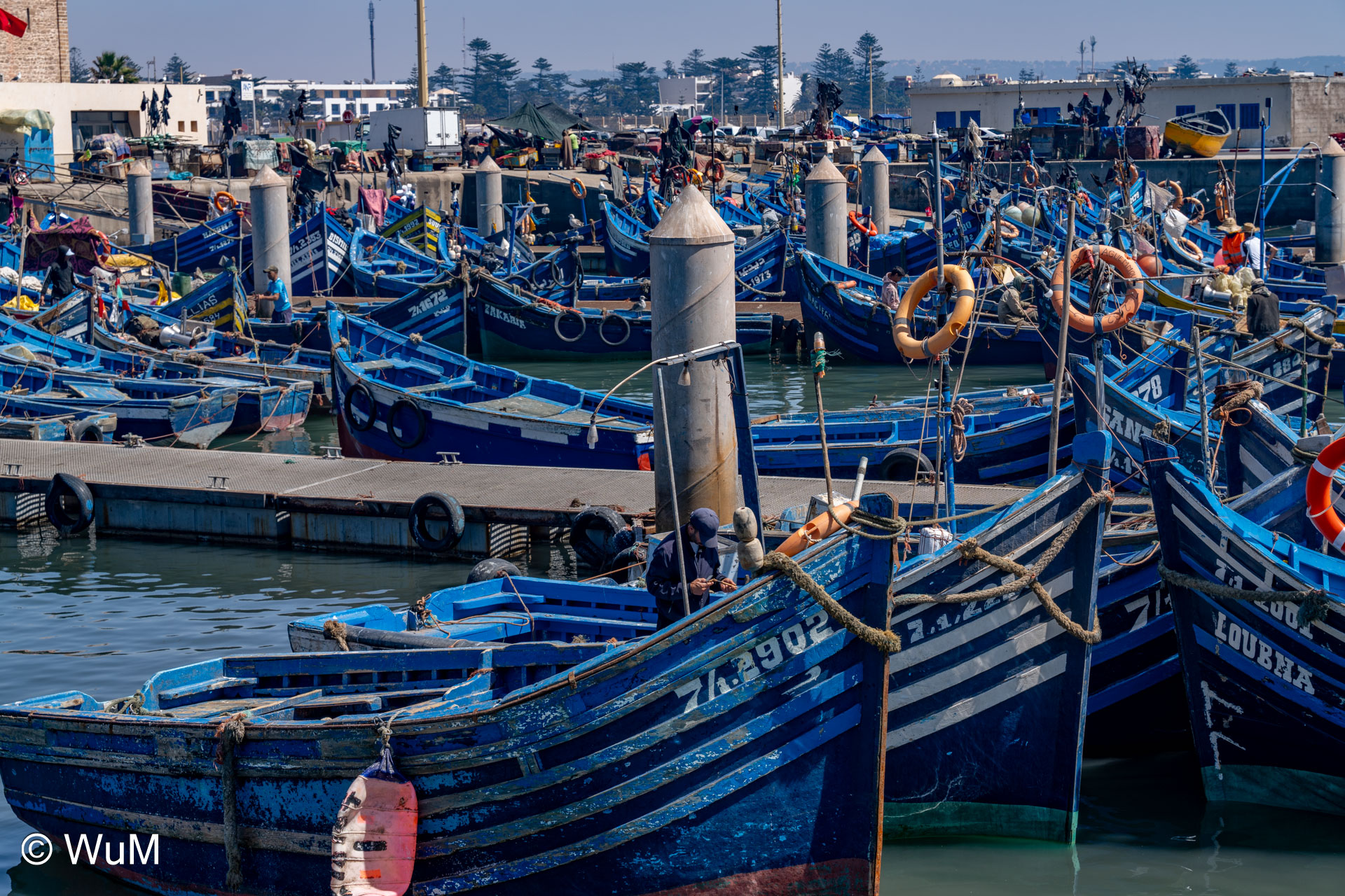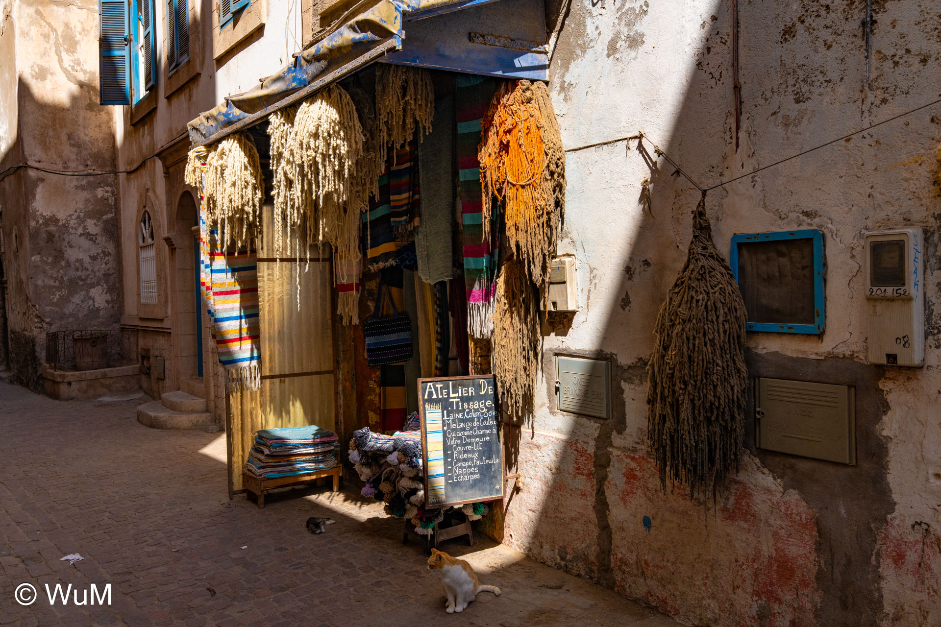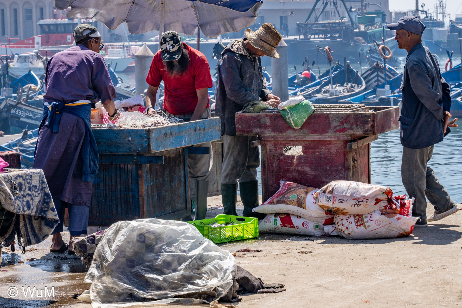 Die Fahrt von Marrakech Richtung Küste ist anfangs etwas mühselig. Viele Orte und immer wieder LKWs verhindern ein flottes Weiterkommen. Die Orte sind typisch marokkanisch mit den kleinen Läden und Werkstätten und dem üblichen Durcheinander. Nach drei Stunden Fahrt für 187 km kommen wir in Essaouira an. Nachdem wir einen Parkplatz gefunden haben, gehen wir durch die wunderschöne Altstadt mit den weißen Häusern und blauen Fensterläden Richtung Hafen. Das Angebot in den Läden hat sich bereits ein wenig geändert – wir sind weiter im Süden Marokkos. Von der von den Portugiesen errichteten Küstenbefestigung hat man einen schönen Ausblick auf die raue Küste. Entlang der Stadtmauer wandern wir zum Fischerhafen. Hier herrscht geschäftiges Treiben. Die Fischerboote werden entladen und an den Ständen wird der Fisch auch gleich verkauft oder zum Verzehr angeboten. Wir beobachten das Entladen der Fischerboote und schauen beim Flicken der Netze zu.
