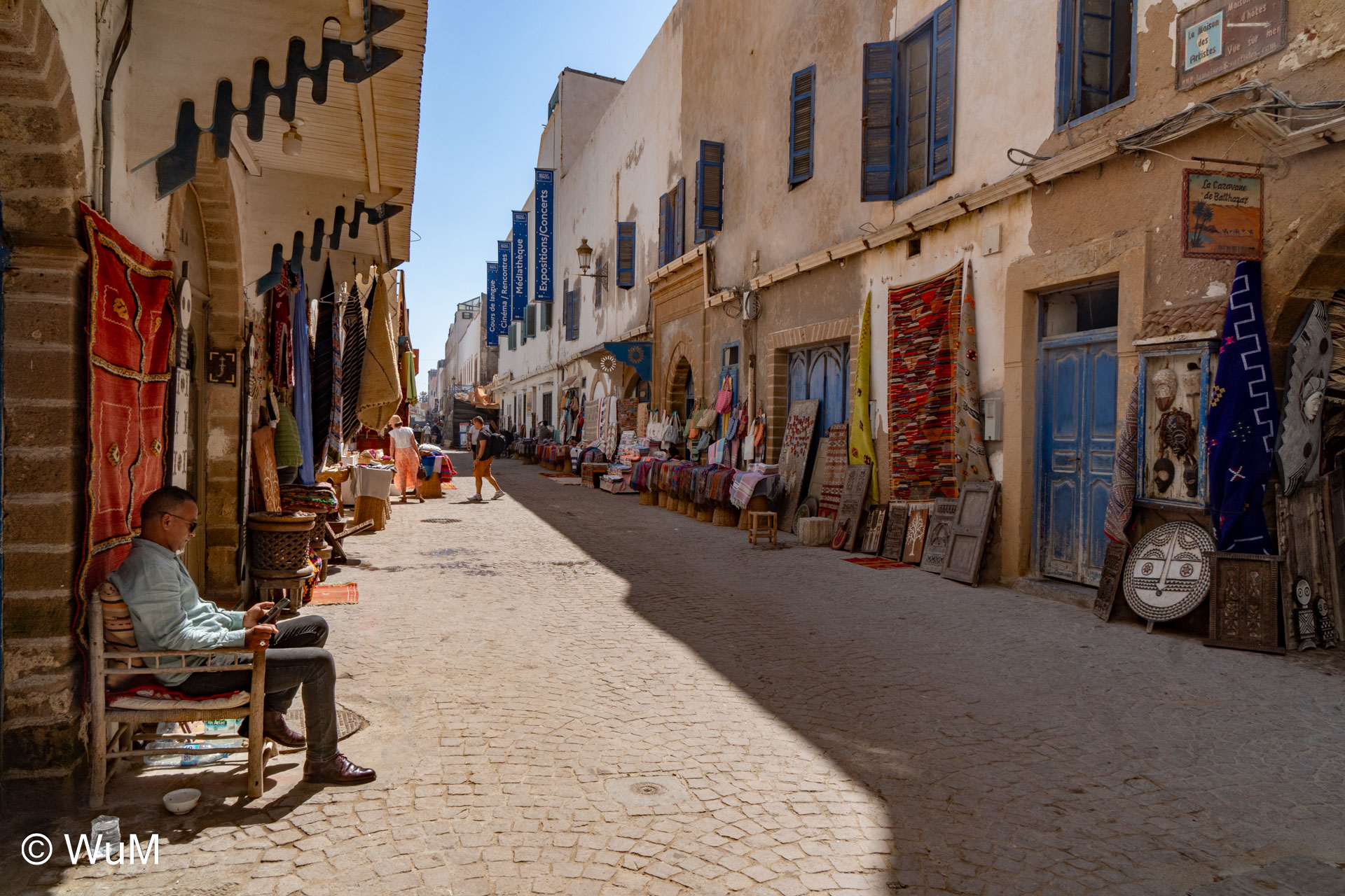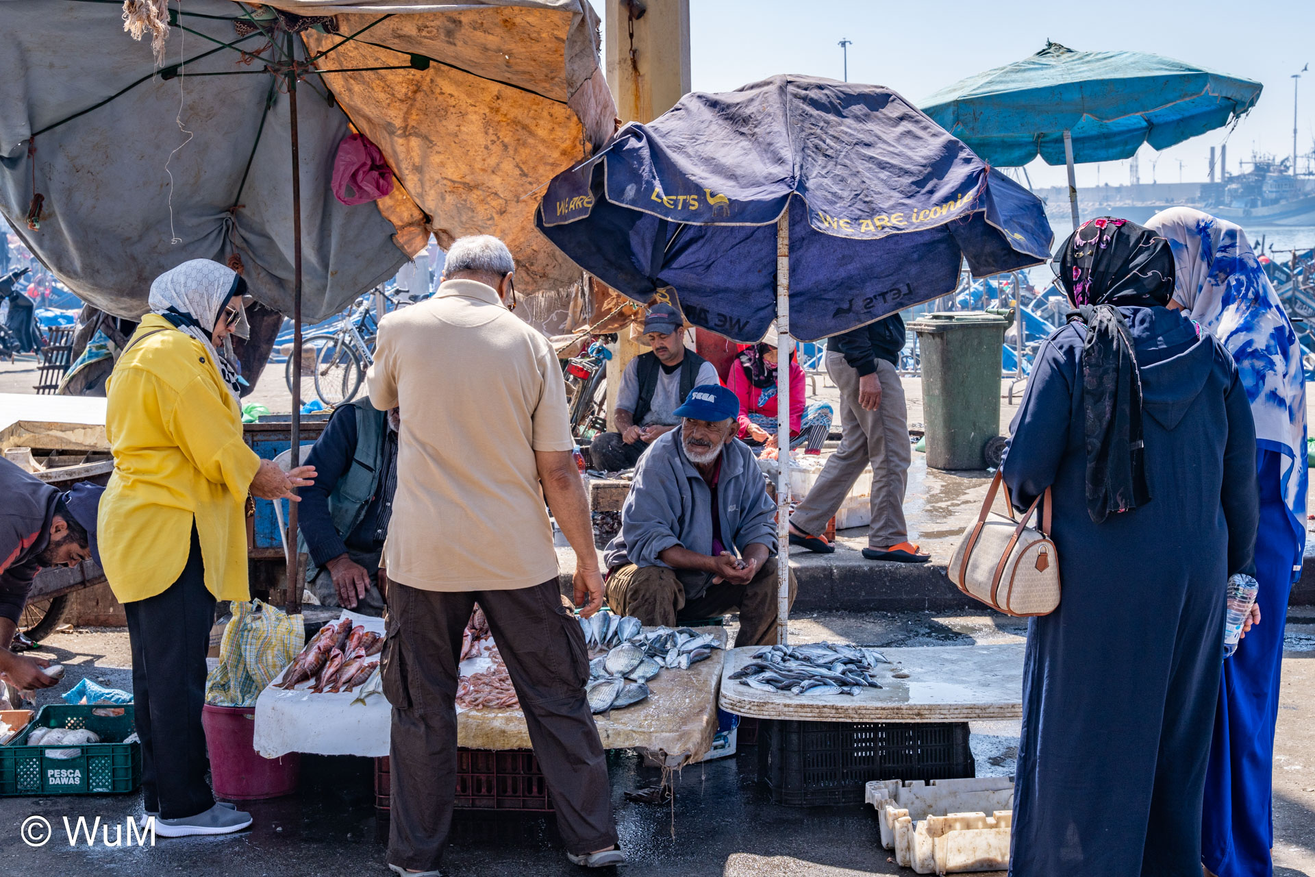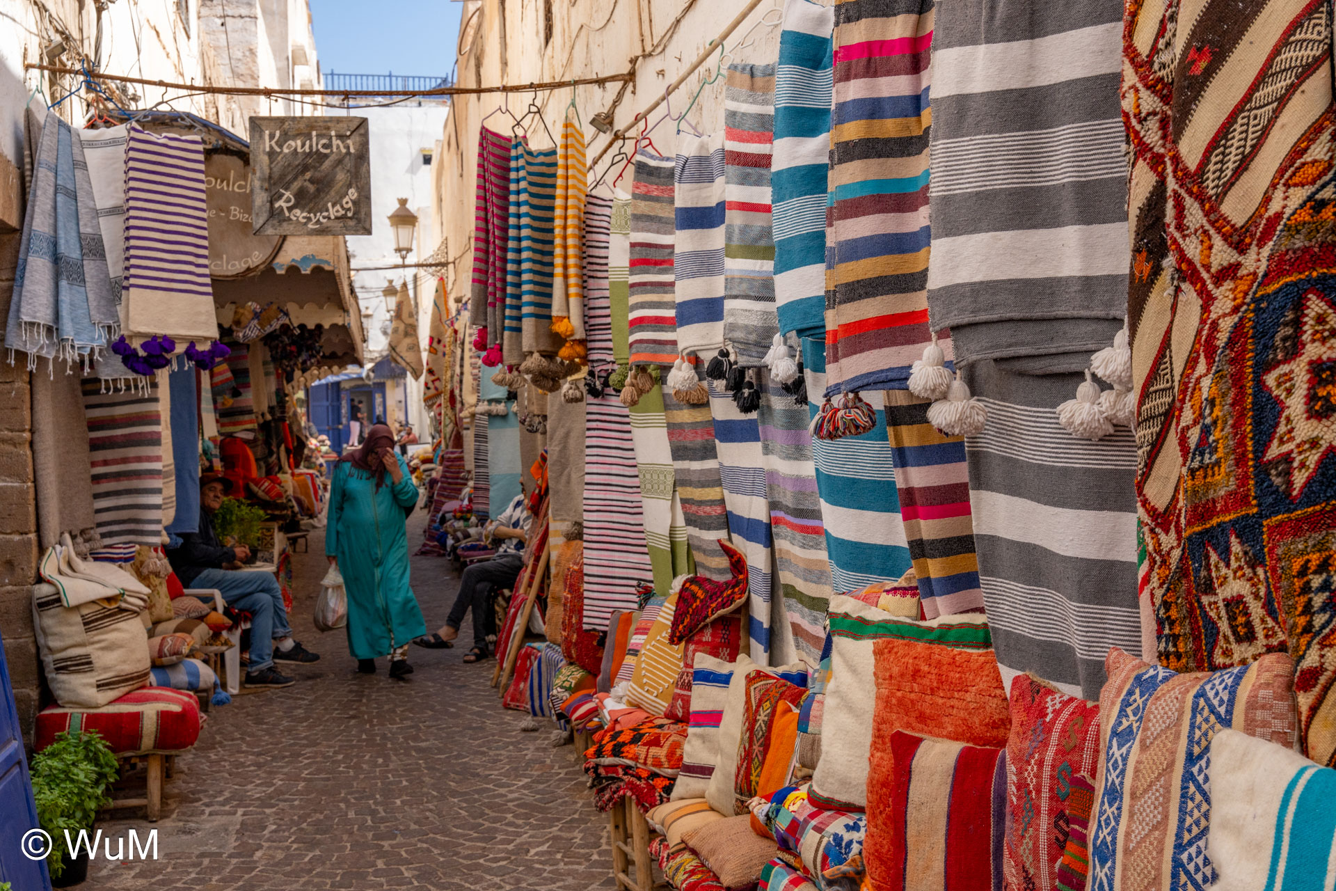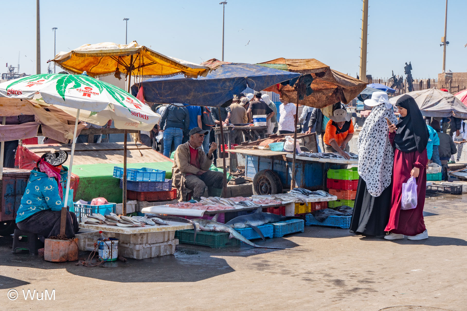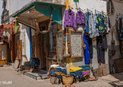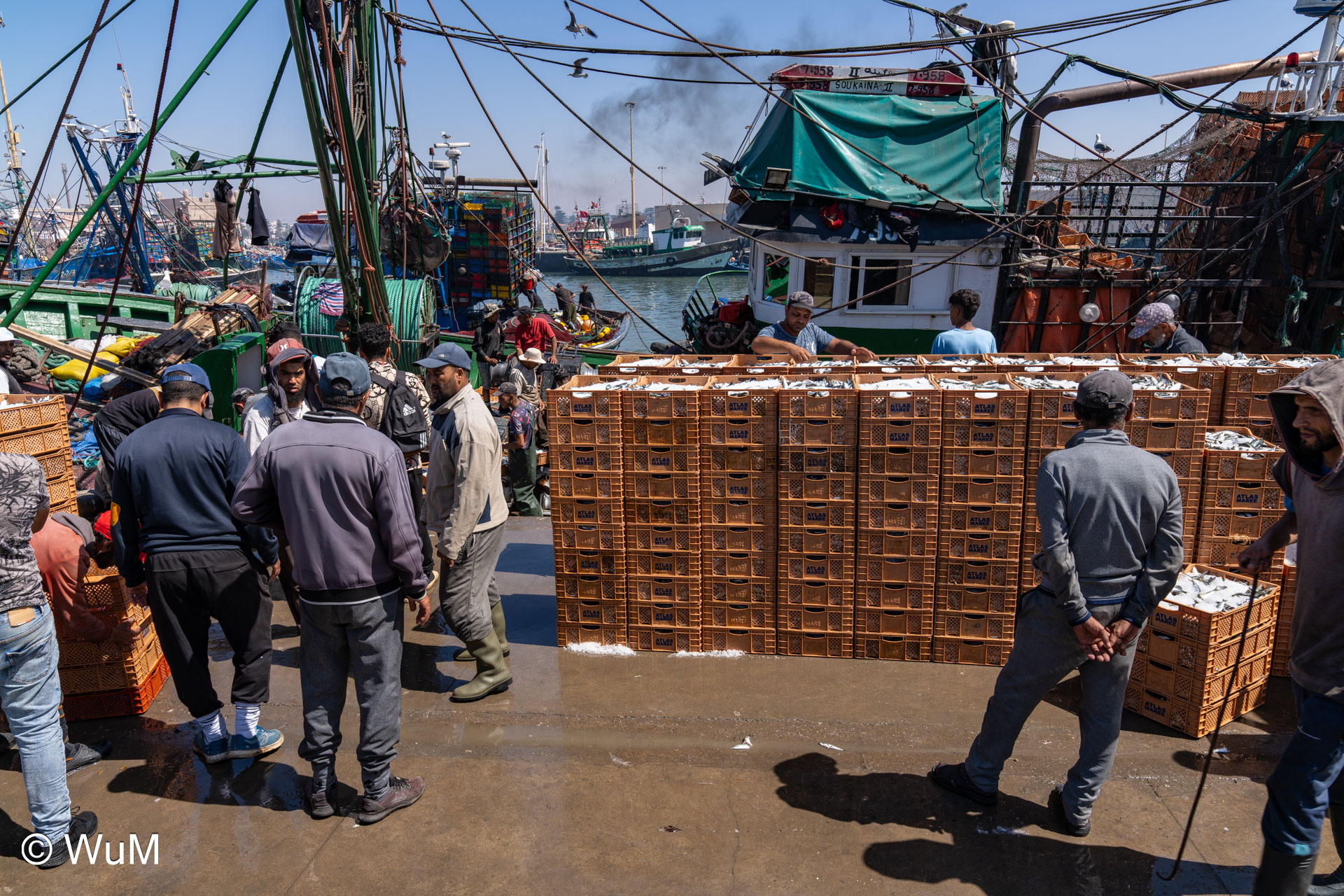 Die Fahrt von Marrakech Richtung Küste ist anfangs etwas mühselig. Viele Orte und immer wieder LKWs verhindern ein flottes Weiterkommen. Die Orte sind typisch marokkanisch mit den kleinen Läden und Werkstätten und dem üblichen Durcheinander. Nach drei Stunden Fahrt für 187 km kommen wir in Essaouira an. Nachdem wir einen Parkplatz gefunden haben, gehen wir durch die wunderschöne Altstadt mit den weißen Häusern und blauen Fensterläden Richtung Hafen. Das Angebot in den Läden hat sich bereits ein wenig geändert – wir sind weiter im Süden Marokkos. Von der von den Portugiesen errichteten Küstenbefestigung hat man einen schönen Ausblick auf die raue Küste. Entlang der Stadtmauer wandern wir zum Fischerhafen. Hier herrscht geschäftiges Treiben. Die Fischerboote werden entladen und an den Ständen wird der Fisch auch gleich verkauft oder zum Verzehr angeboten. Wir beobachten das Entladen der Fischerboote und schauen beim Flicken der Netze zu.