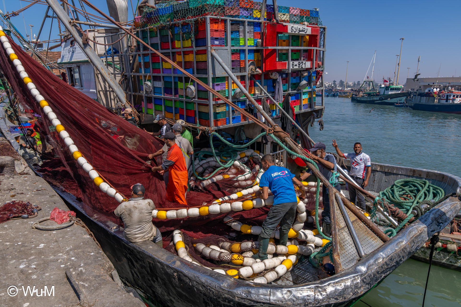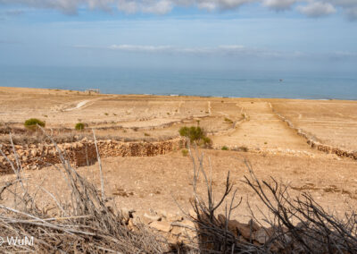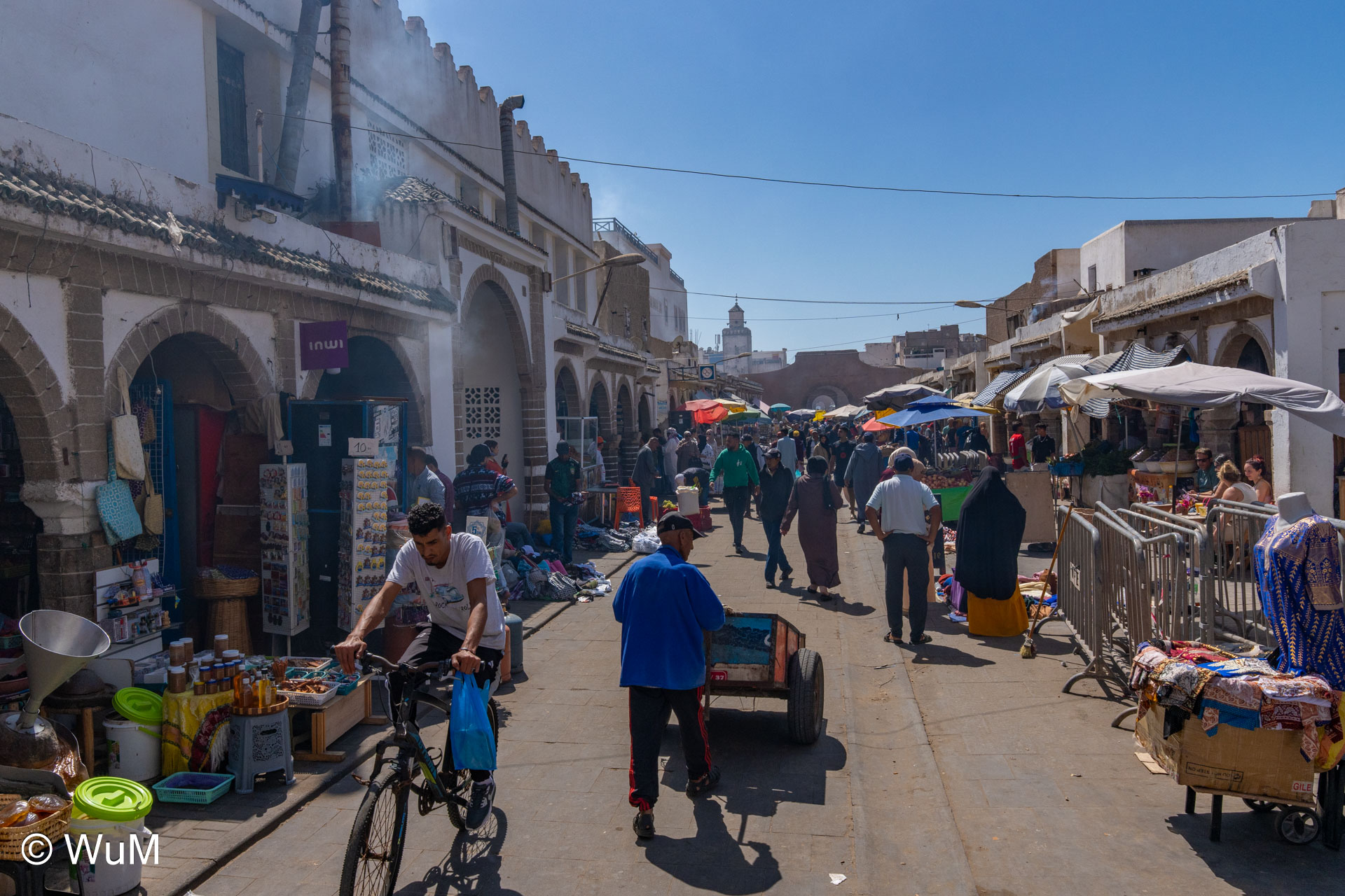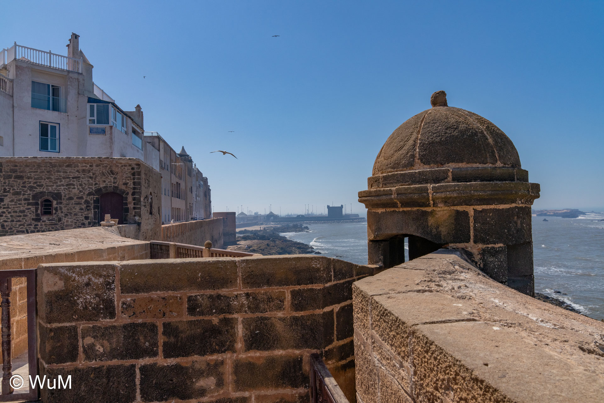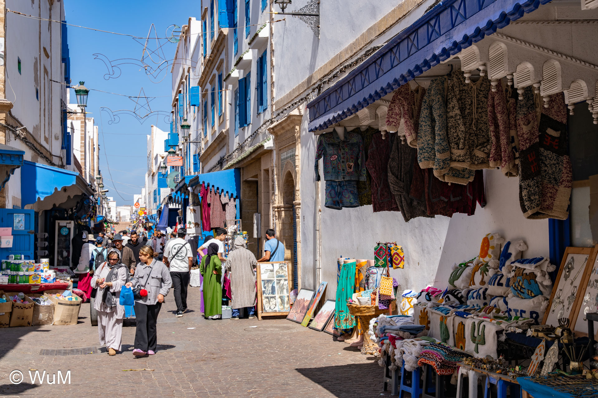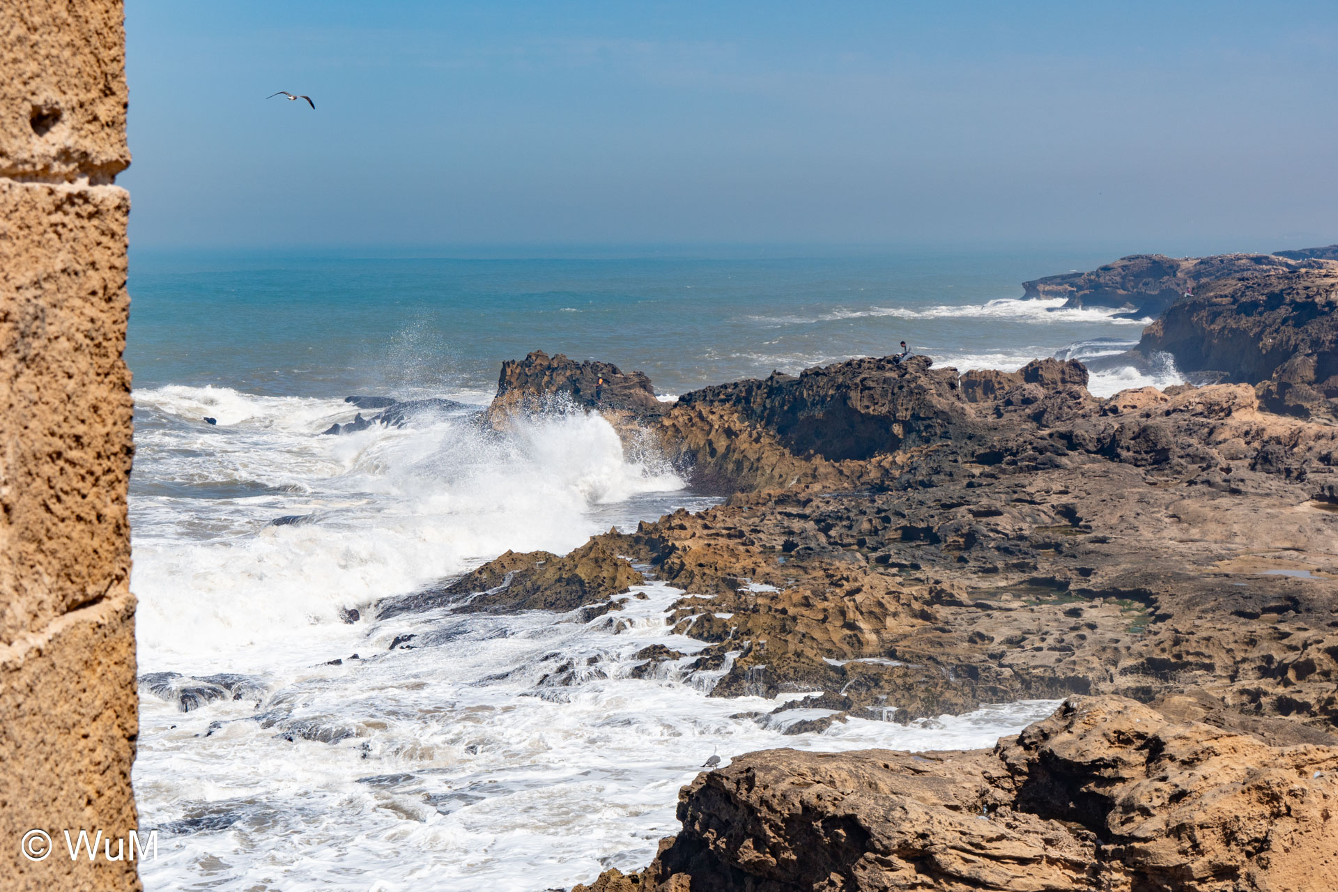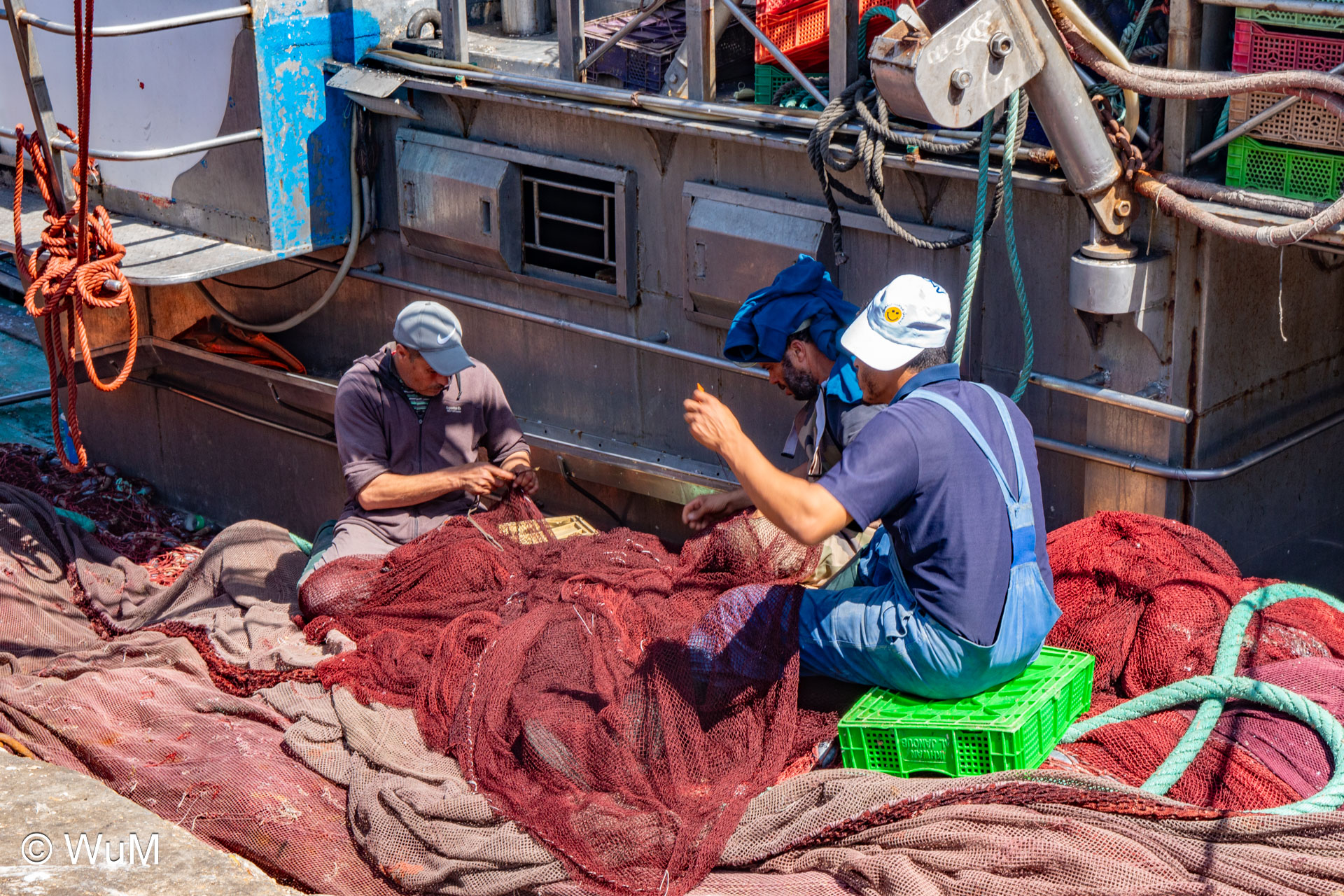 Die Fahrt von Marrakech Richtung Küste ist anfangs etwas mühselig. Viele Orte und immer wieder LKWs verhindern ein flottes Weiterkommen. Die Orte sind typisch marokkanisch mit den kleinen Läden und Werkstätten und dem üblichen Durcheinander. Nach drei Stunden Fahrt für 187 km kommen wir in Essaouira an. Nachdem wir einen Parkplatz gefunden haben, gehen wir durch die wunderschöne Altstadt mit den weißen Häusern und blauen Fensterläden Richtung Hafen. Das Angebot in den Läden hat sich bereits ein wenig geändert – wir sind weiter im Süden Marokkos. Von der von den Portugiesen errichteten Küstenbefestigung hat man einen schönen Ausblick auf die raue Küste. Entlang der Stadtmauer wandern wir zum Fischerhafen. Hier herrscht geschäftiges Treiben. Die Fischerboote werden entladen und an den Ständen wird der Fisch auch gleich verkauft oder zum Verzehr angeboten. Wir beobachten das Entladen der Fischerboote und schauen beim Flicken der Netze zu.