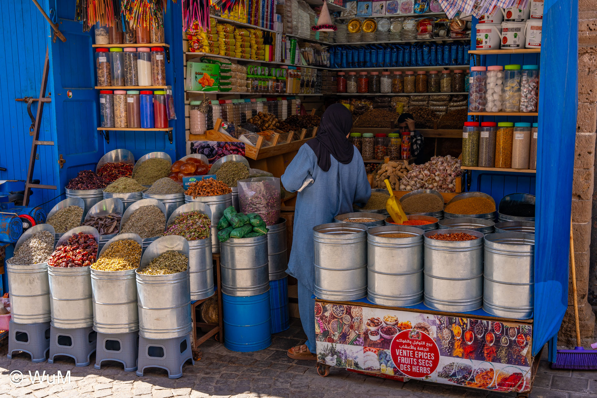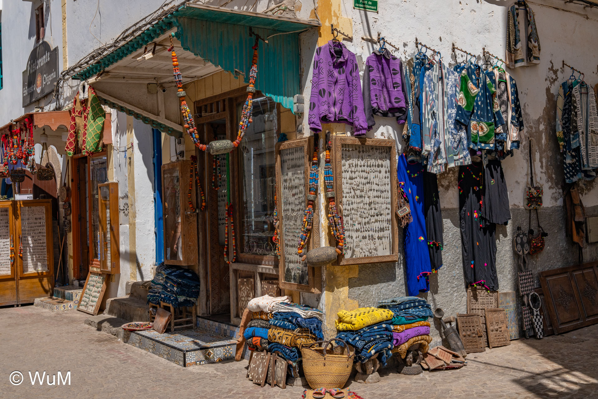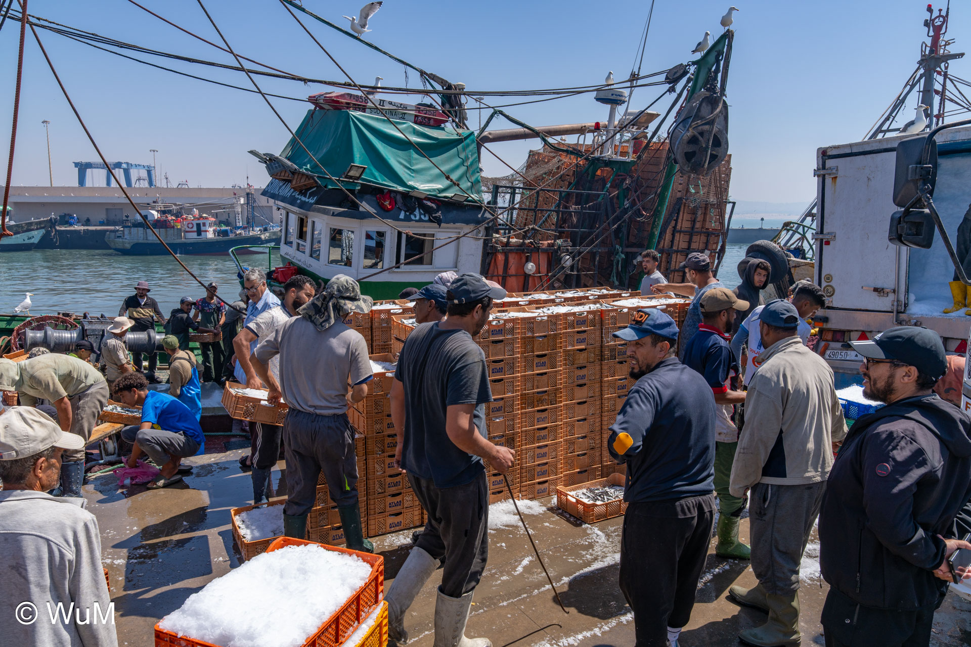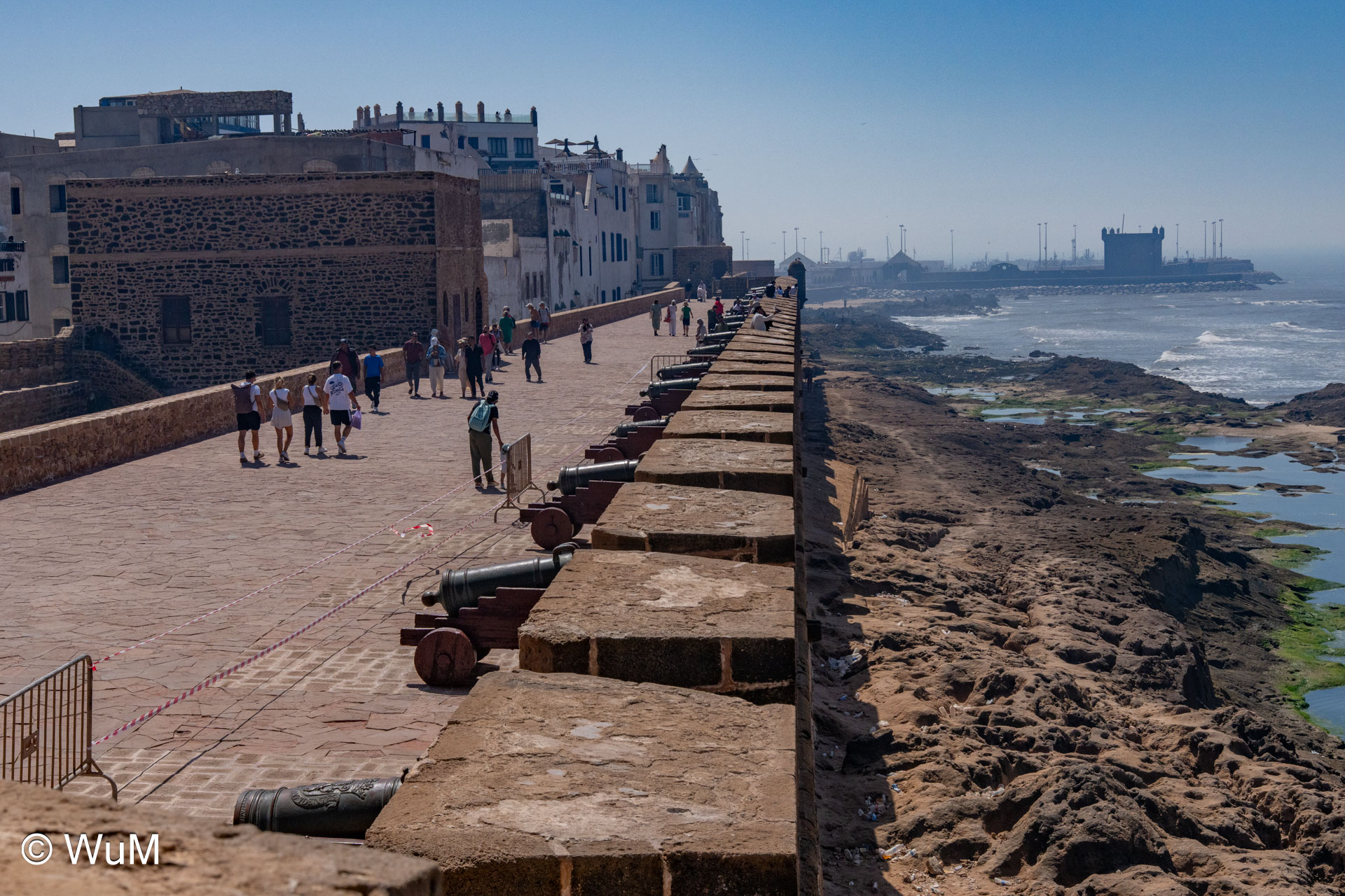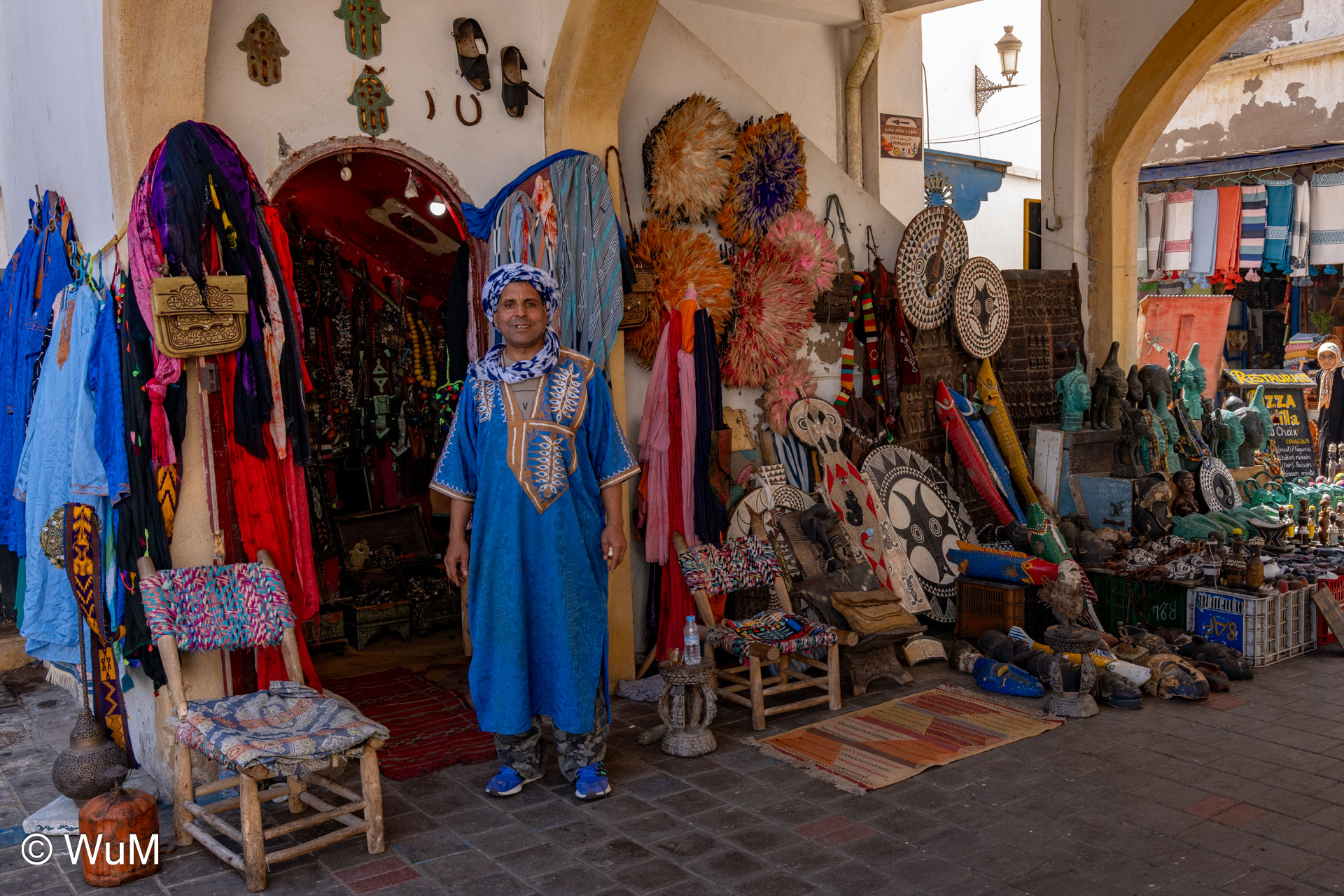 Die Fahrt von Marrakech Richtung Küste ist anfangs etwas mühselig. Viele Orte und immer wieder LKWs verhindern ein flottes Weiterkommen. Die Orte sind typisch marokkanisch mit den kleinen Läden und Werkstätten und dem üblichen Durcheinander. Nach drei Stunden Fahrt für 187 km kommen wir in Essaouira an. Nachdem wir einen Parkplatz gefunden haben, gehen wir durch die wunderschöne Altstadt mit den weißen Häusern und blauen Fensterläden Richtung Hafen. Das Angebot in den Läden hat sich bereits ein wenig geändert – wir sind weiter im Süden Marokkos. Von der von den Portugiesen errichteten Küstenbefestigung hat man einen schönen Ausblick auf die raue Küste. Entlang der Stadtmauer wandern wir zum Fischerhafen. Hier herrscht geschäftiges Treiben. Die Fischerboote werden entladen und an den Ständen wird der Fisch auch gleich verkauft oder zum Verzehr angeboten. Wir beobachten das Entladen der Fischerboote und schauen beim Flicken der Netze zu.