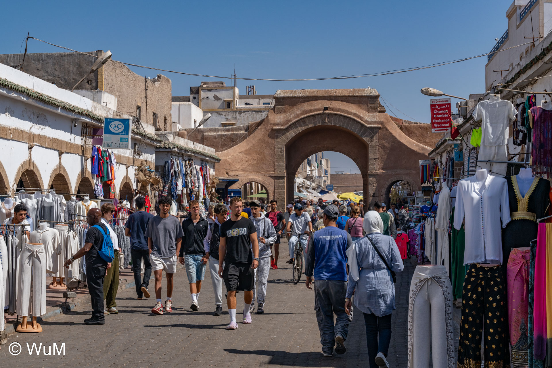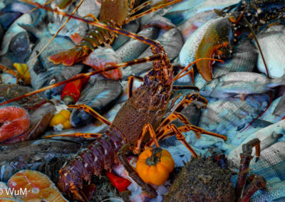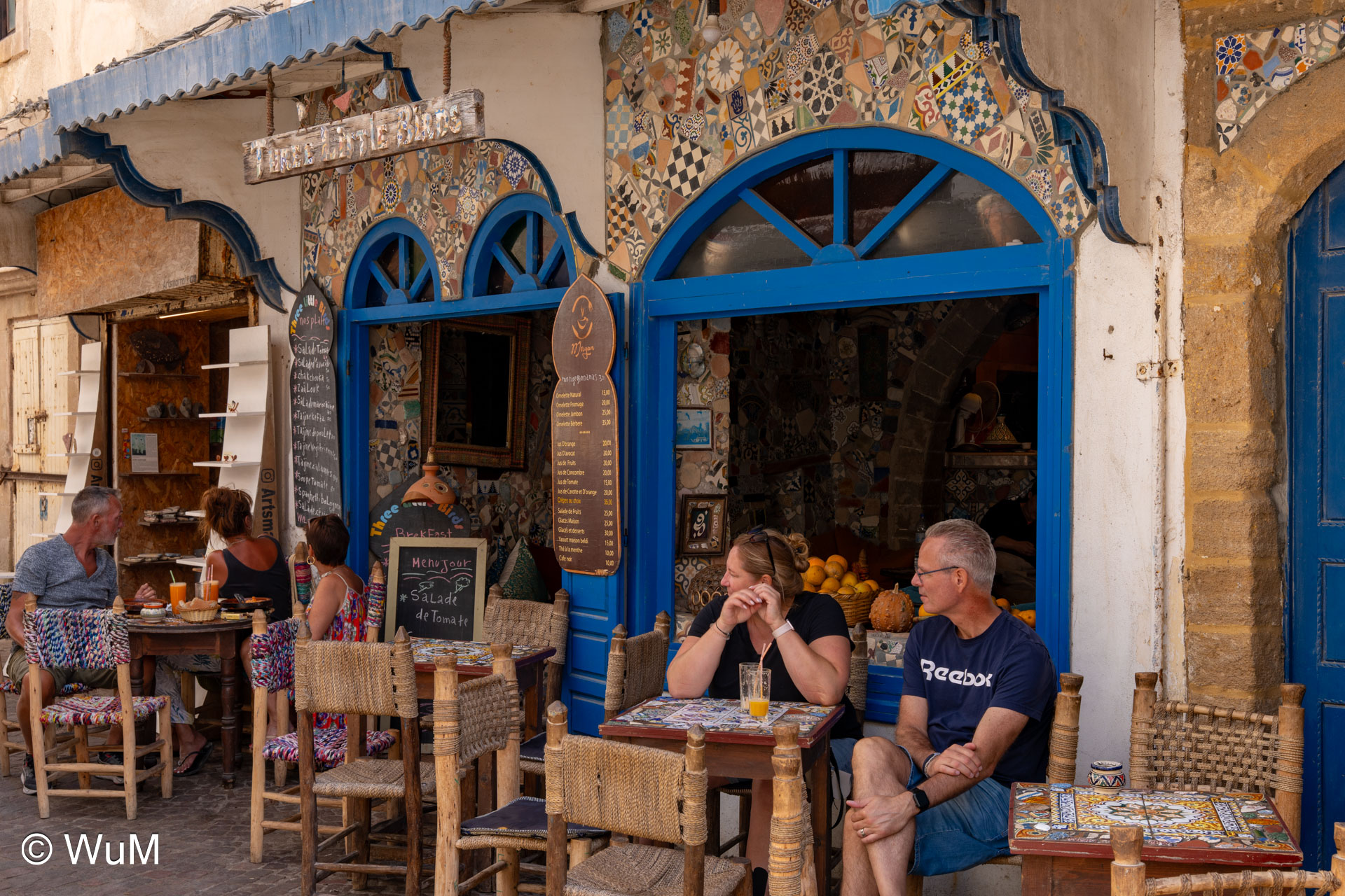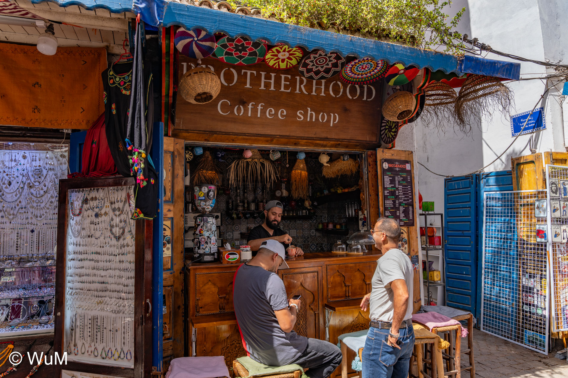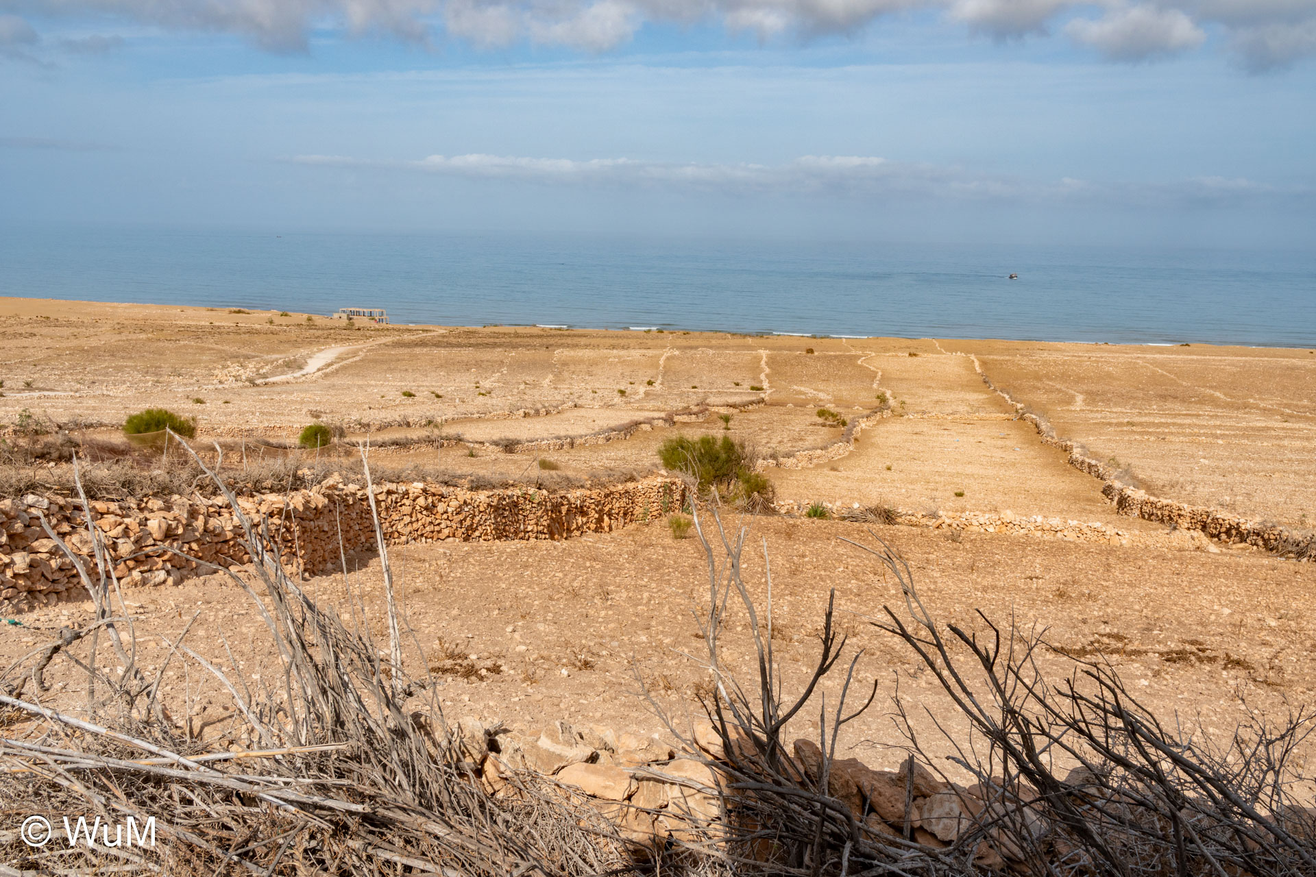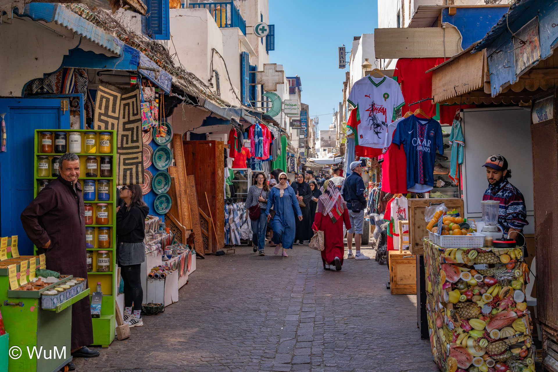 Die Fahrt von Marrakech Richtung Küste ist anfangs etwas mühselig. Viele Orte und immer wieder LKWs verhindern ein flottes Weiterkommen. Die Orte sind typisch marokkanisch mit den kleinen Läden und Werkstätten und dem üblichen Durcheinander. Nach drei Stunden Fahrt für 187 km kommen wir in Essaouira an. Nachdem wir einen Parkplatz gefunden haben, gehen wir durch die wunderschöne Altstadt mit den weißen Häusern und blauen Fensterläden Richtung Hafen. Das Angebot in den Läden hat sich bereits ein wenig geändert – wir sind weiter im Süden Marokkos. Von der von den Portugiesen errichteten Küstenbefestigung hat man einen schönen Ausblick auf die raue Küste. Entlang der Stadtmauer wandern wir zum Fischerhafen. Hier herrscht geschäftiges Treiben. Die Fischerboote werden entladen und an den Ständen wird der Fisch auch gleich verkauft oder zum Verzehr angeboten. Wir beobachten das Entladen der Fischerboote und schauen beim Flicken der Netze zu.
