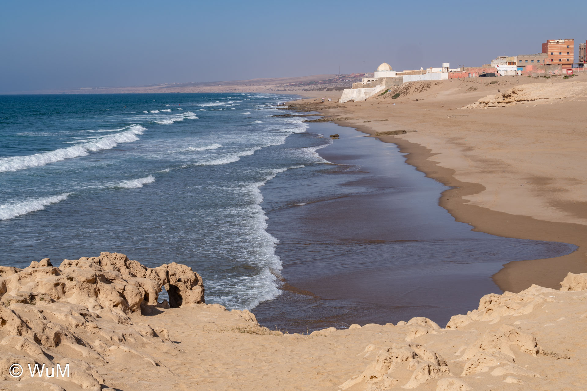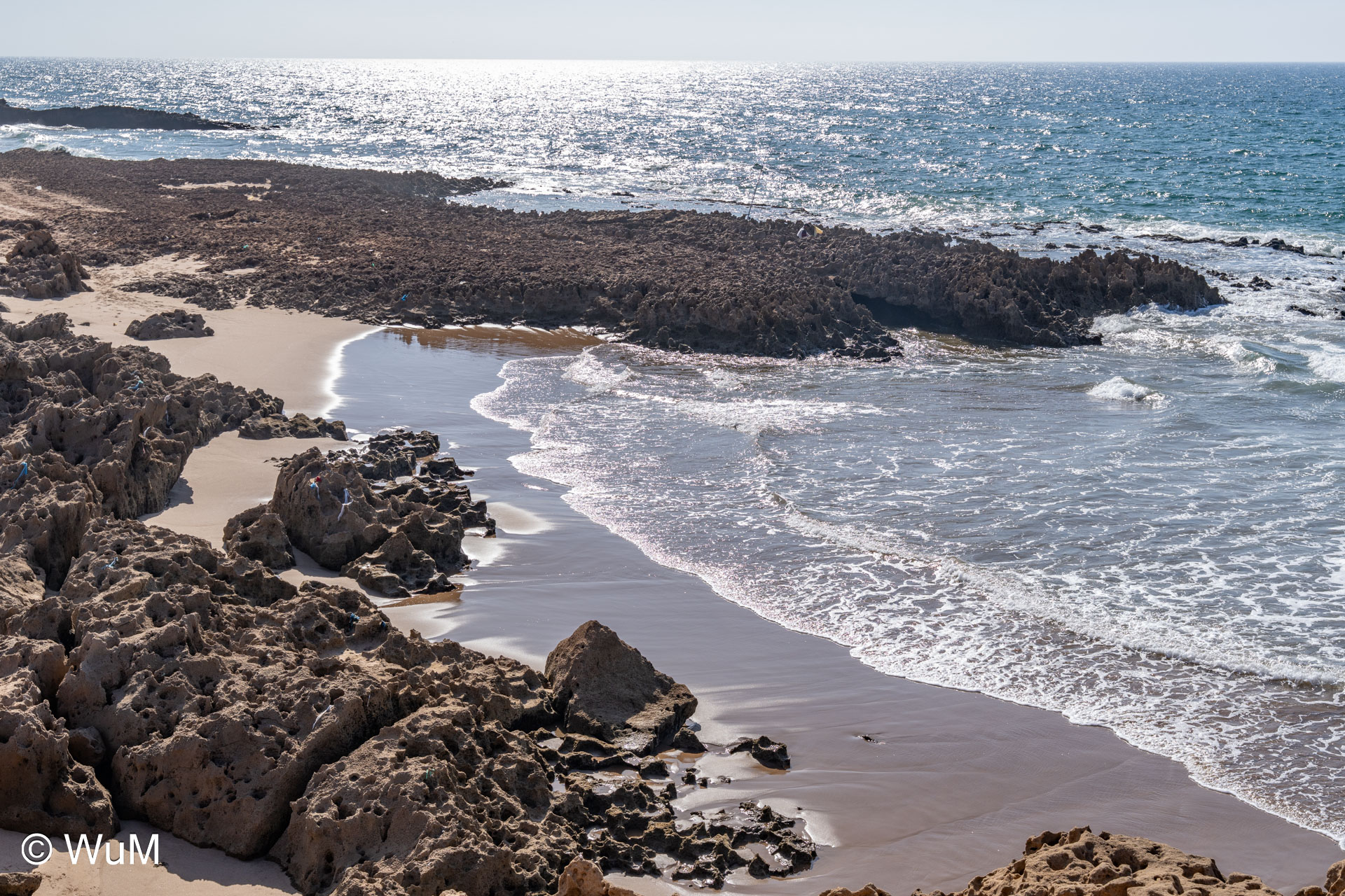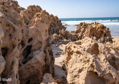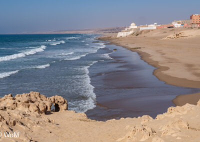 Es geht weiter nach Agadir, wo wir Lebensmittel für mehrere Tage einkaufen. Hier ist das Angebot noch groß. Dann geht es am Rande des Parc National Souss Massa Richtung Süden. Hier gibt es viele verschiedene Vogelarten zu sehen. Eigentlich wollten wir an der Küste campieren, fahren auch einige Pisten entlang, stehen aber jedes Mal vor einer Müllhalde oder eingestürzten Häusern. Am Wassay Beach bleiben wir dann auf einem Campingplatz. Wir machen einen schönen Spaziergang am Strand, der hier erstaunlich sauber ist…