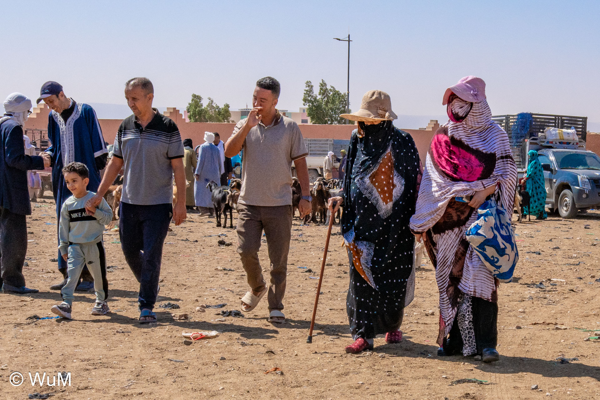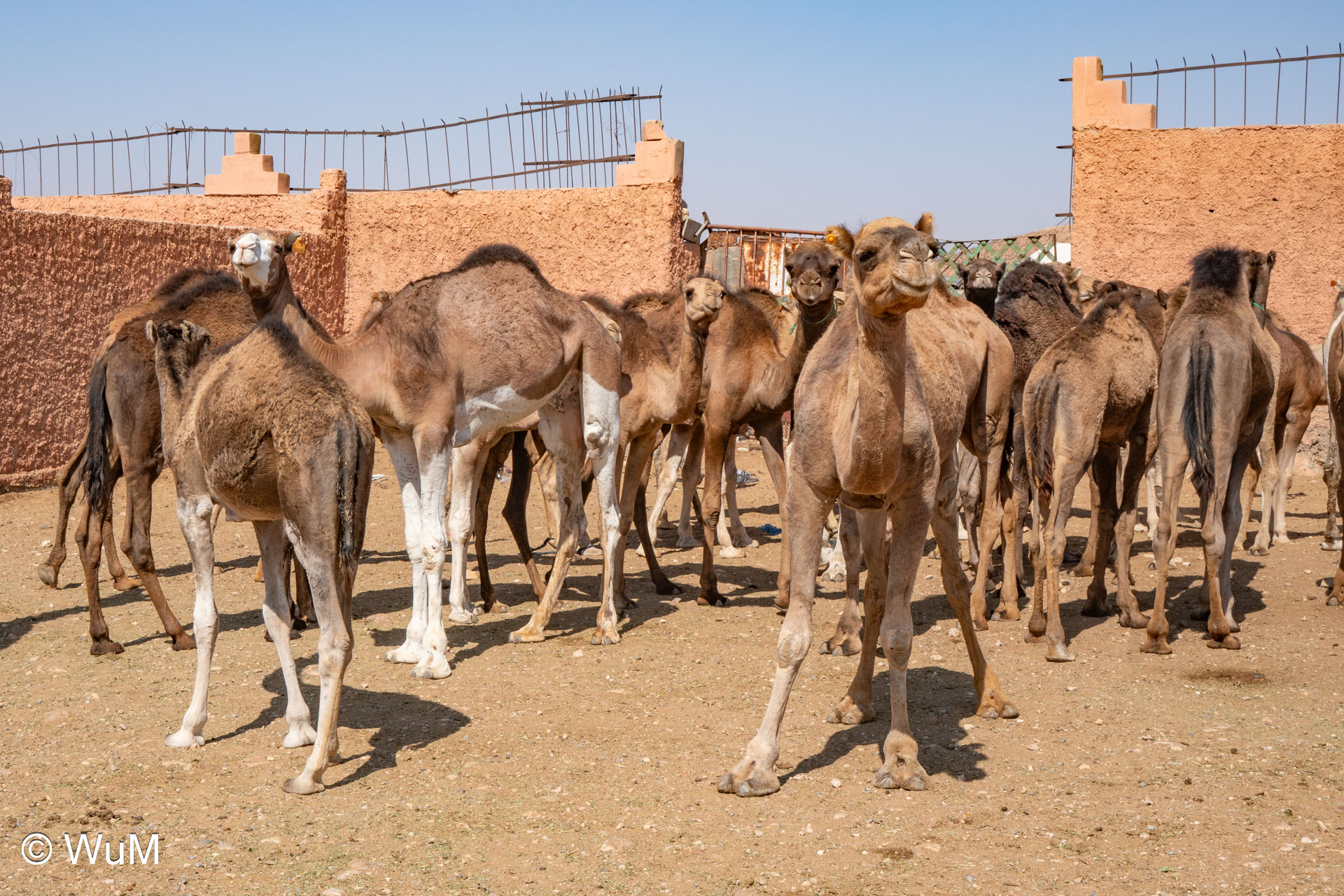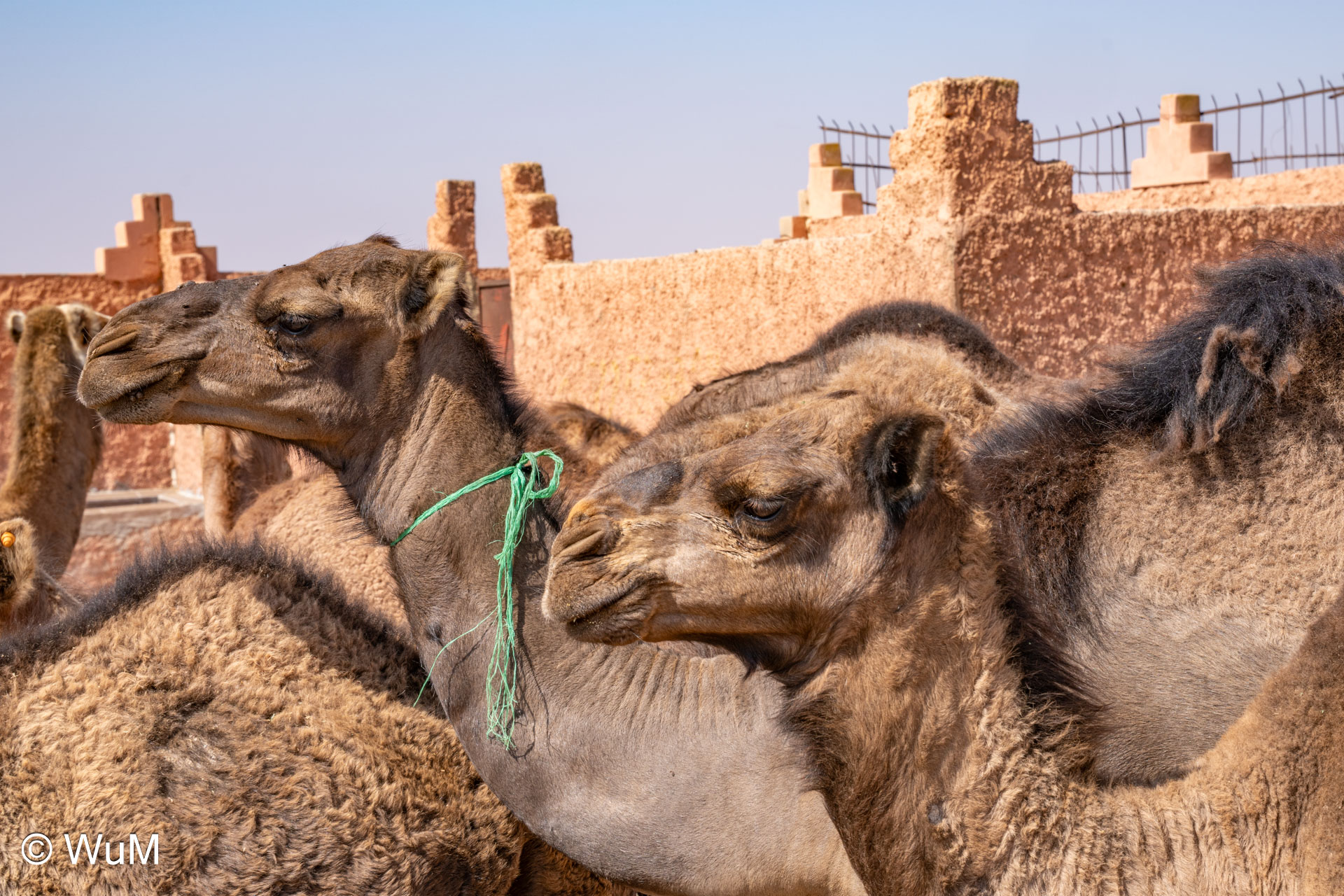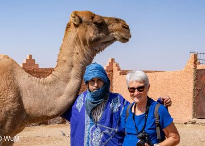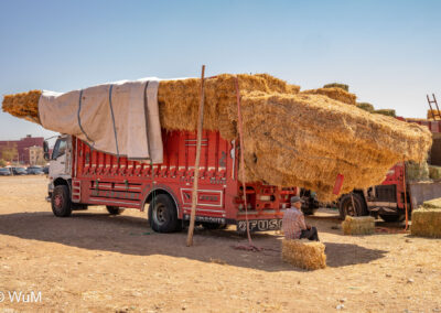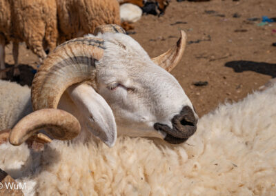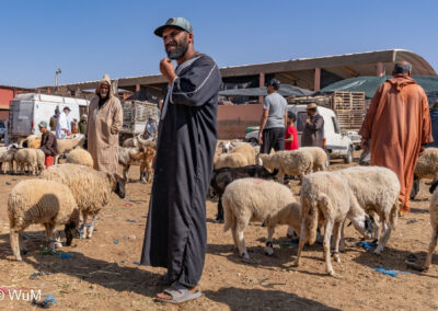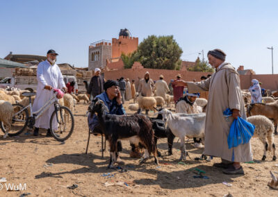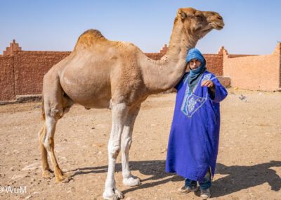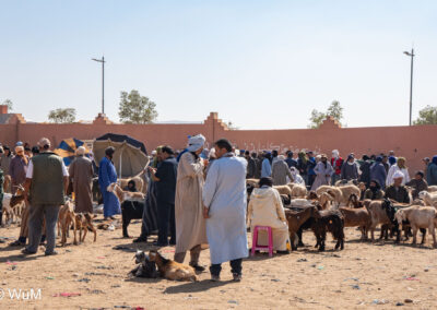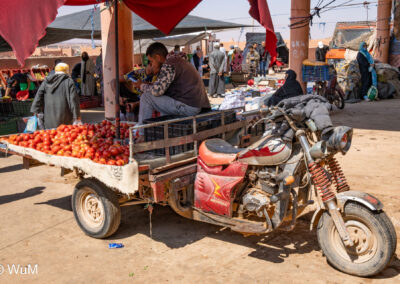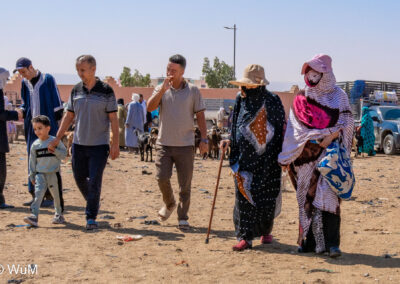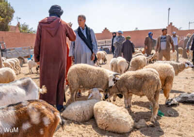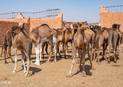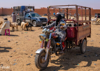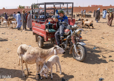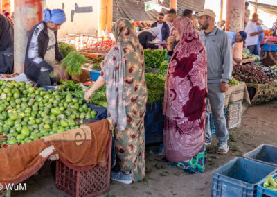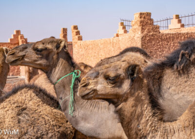 In Guelmim ist heute Kamel und Nutztiermarkt, da müssen wir hin. Über die N1 gehts durch wüstenähnliche Landschaft Richtung Süden. Guelmim war früher ein bedeutender Knotenpunkt für Karawanen aus dem Süden. Durch den Grenzkonflikt bleiben aber die Karawanen aus und der Kamelmarkt ist nur mehr ein Abklatsch früherer Zeiten. Trotzdem geht es ziemlich lebhaft zu und wir sind mitten drin. Allerdings tun uns die Tiere leid, es wird nicht zimperlich mit ihnen umgegangen. Daneben ist noch der normale Markt, wo wir uns mit Obst und Gemüse versorgen.