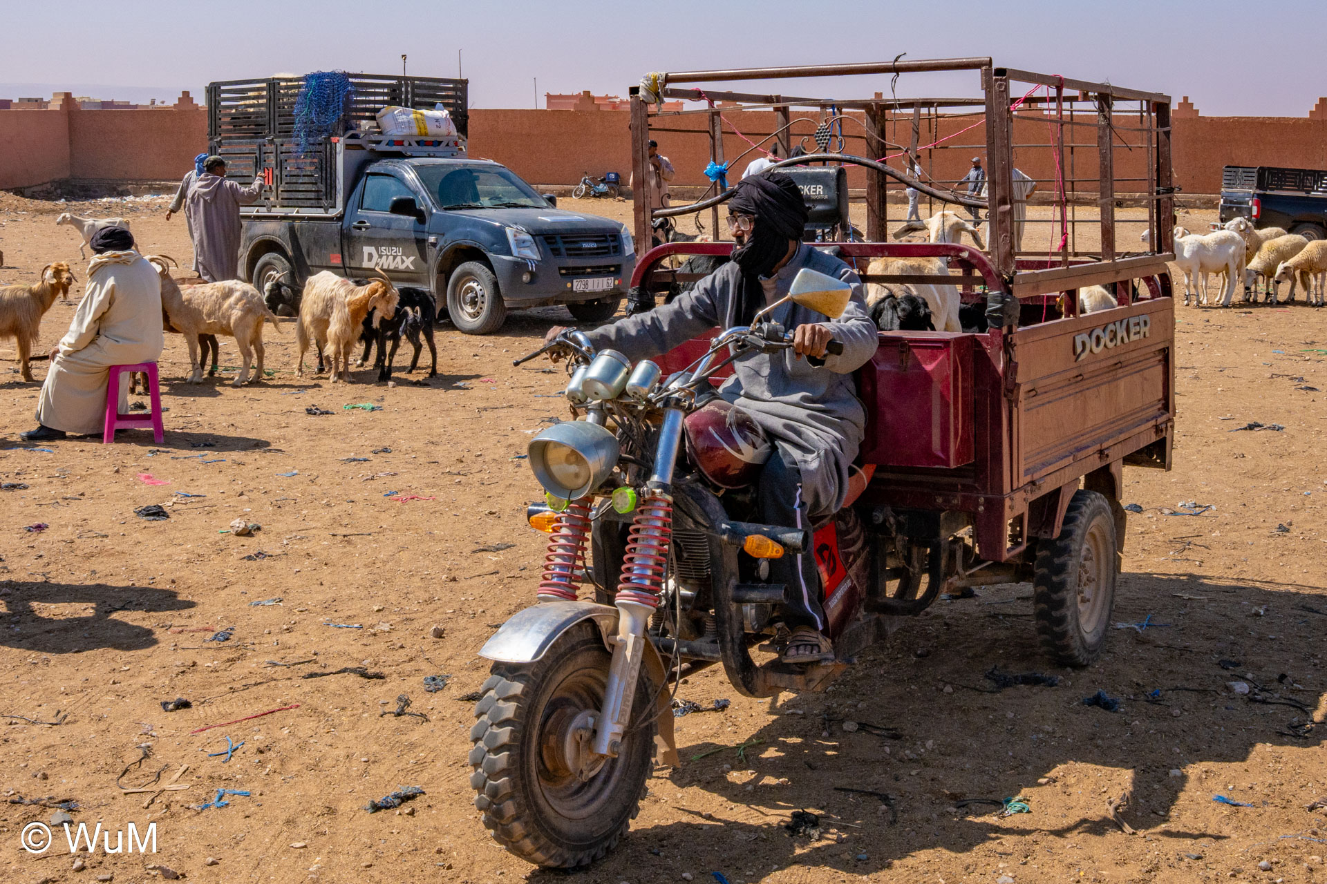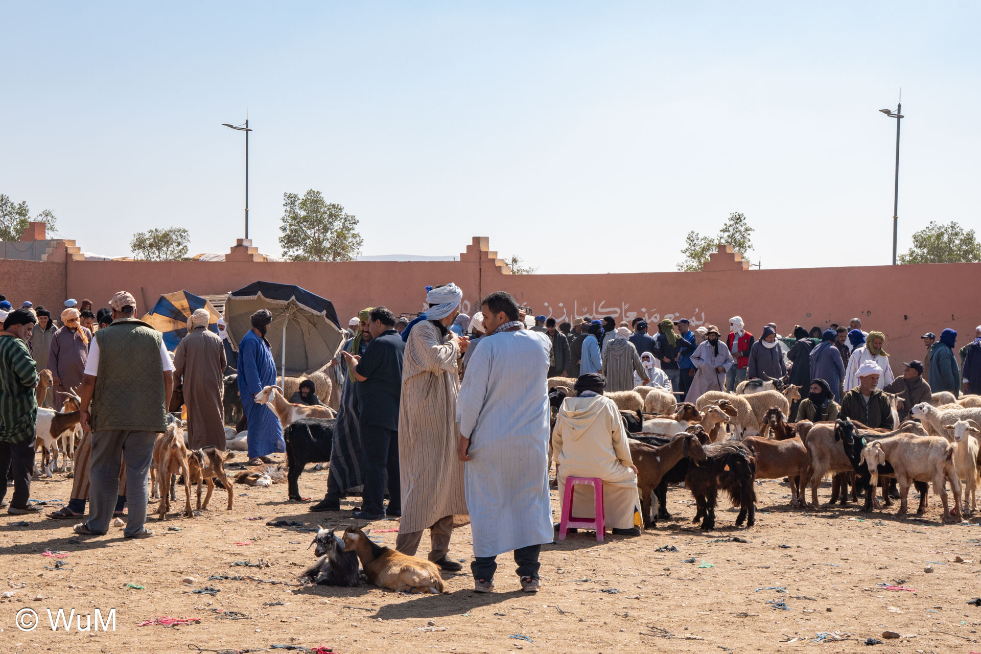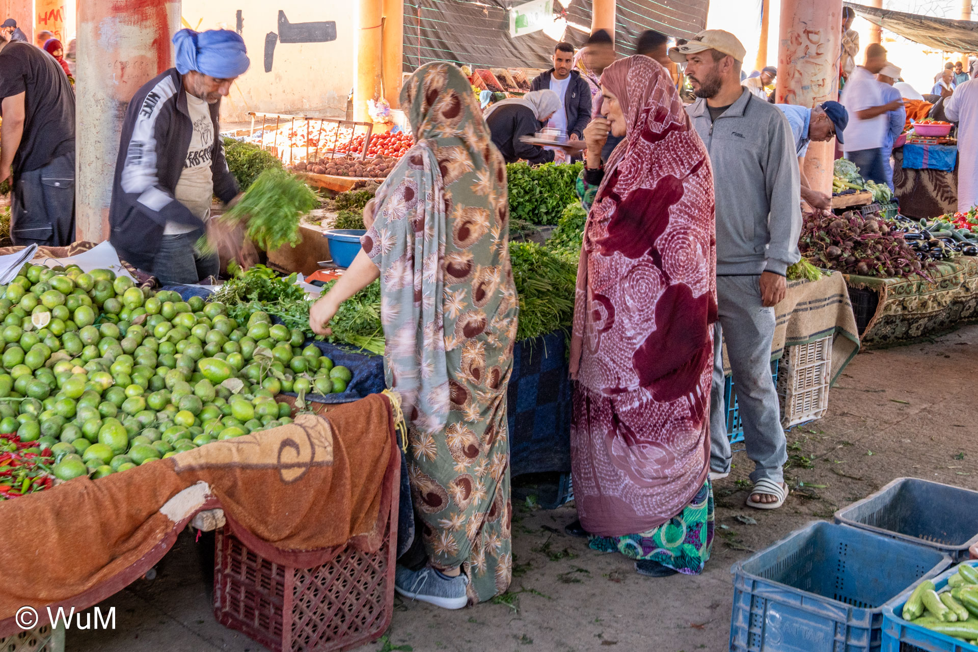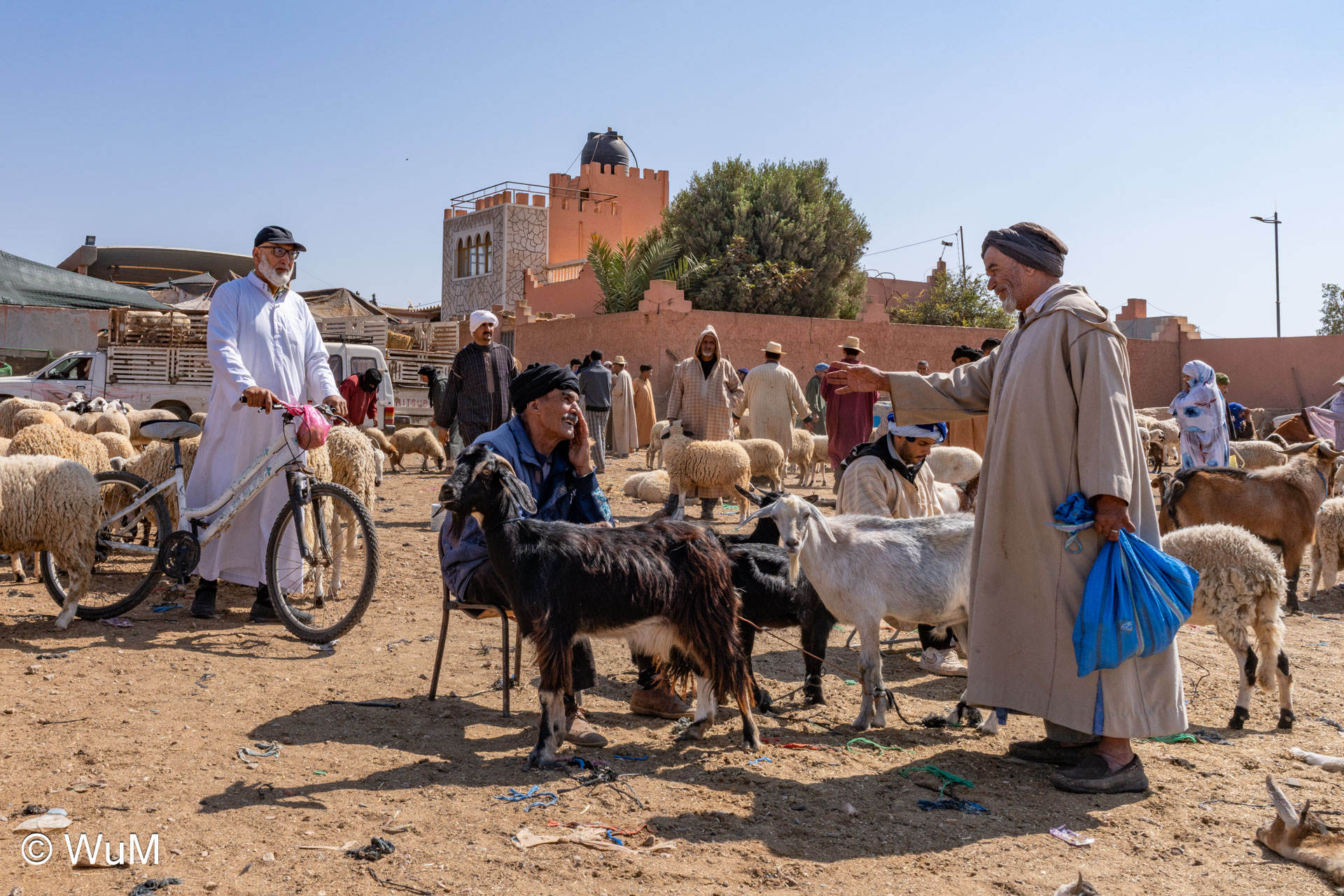In Guelmim ist heute Kamel und Nutztiermarkt, da müssen wir hin. Über die N1 gehts durch wüstenähnliche Landschaft Richtung Süden. Guelmim war früher ein bedeutender Knotenpunkt für Karawanen aus dem Süden. Durch den Grenzkonflikt bleiben aber die Karawanen aus und der Kamelmarkt ist nur mehr ein Abklatsch früherer Zeiten. Trotzdem geht es ziemlich lebhaft zu und wir sind mitten drin. Allerdings tun uns die Tiere leid, es wird nicht zimperlich mit ihnen umgegangen. Daneben ist noch der normale Markt, wo wir uns mit Obst und Gemüse versorgen.
