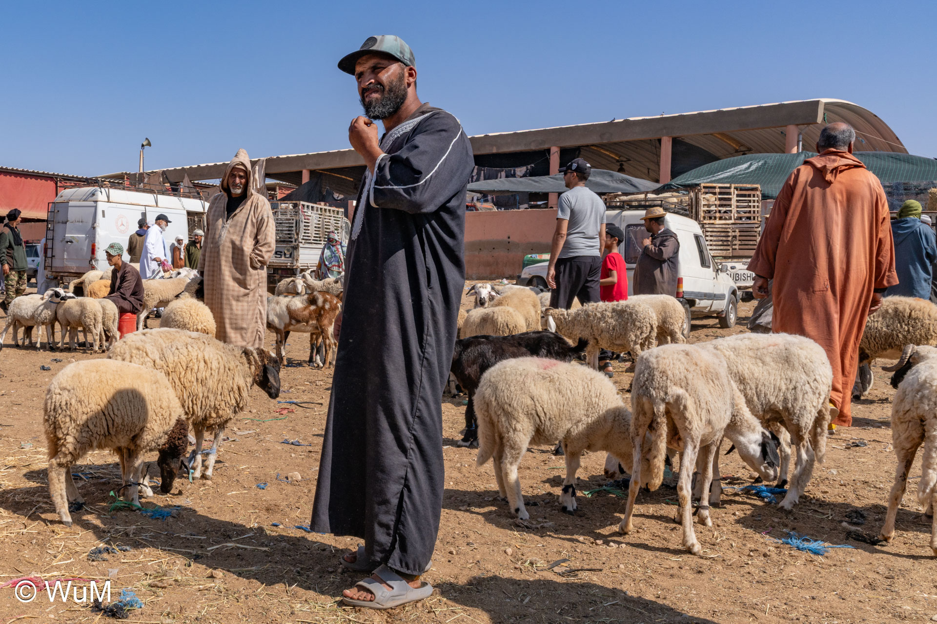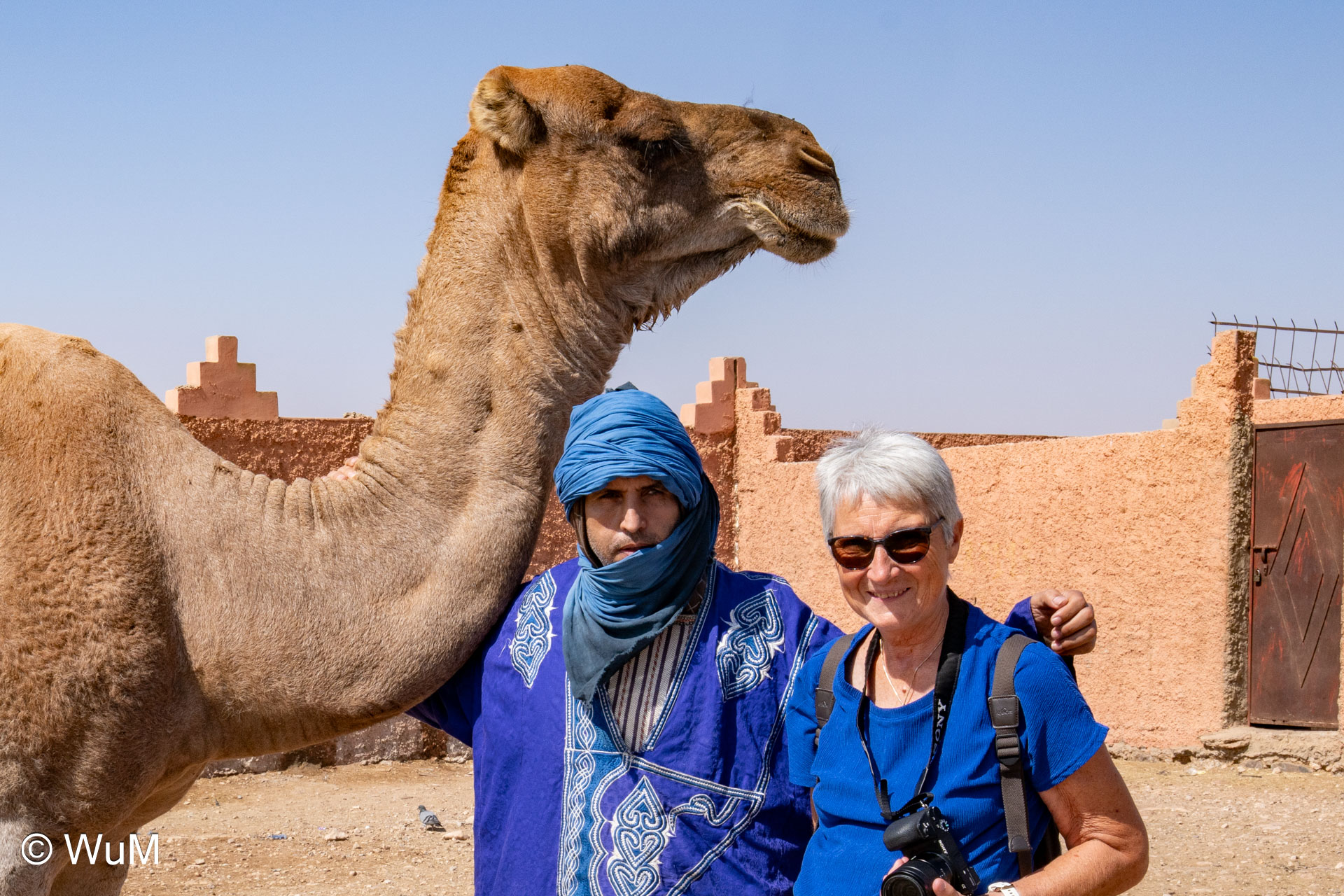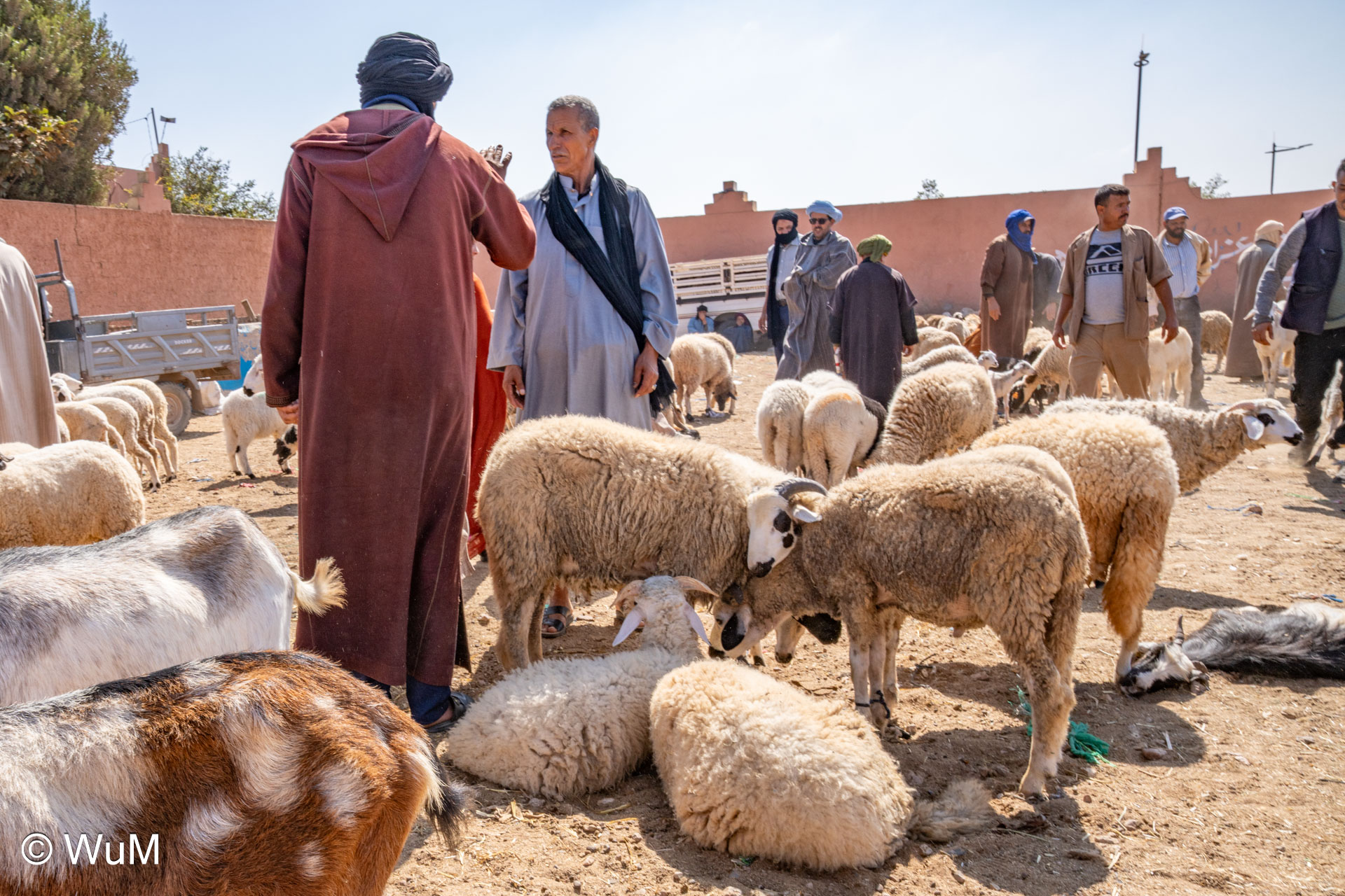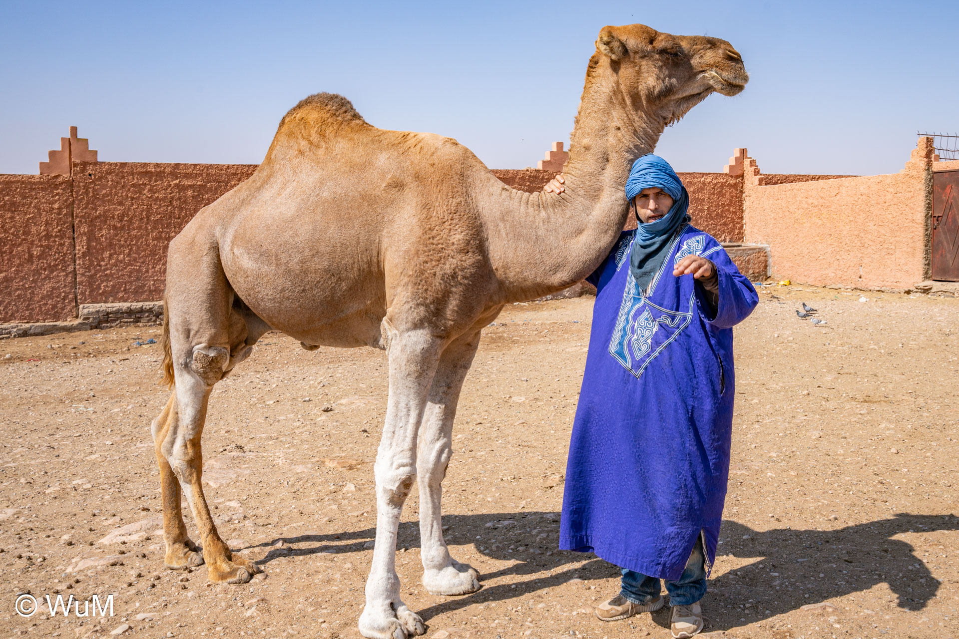 In Guelmim ist heute Kamel und Nutztiermarkt, da müssen wir hin. Über die N1 gehts durch wüstenähnliche Landschaft Richtung Süden. Guelmim war früher ein bedeutender Knotenpunkt für Karawanen aus dem Süden. Durch den Grenzkonflikt bleiben aber die Karawanen aus und der Kamelmarkt ist nur mehr ein Abklatsch früherer Zeiten. Trotzdem geht es ziemlich lebhaft zu und wir sind mitten drin. Allerdings tun uns die Tiere leid, es wird nicht zimperlich mit ihnen umgegangen. Daneben ist noch der normale Markt, wo wir uns mit Obst und Gemüse versorgen.