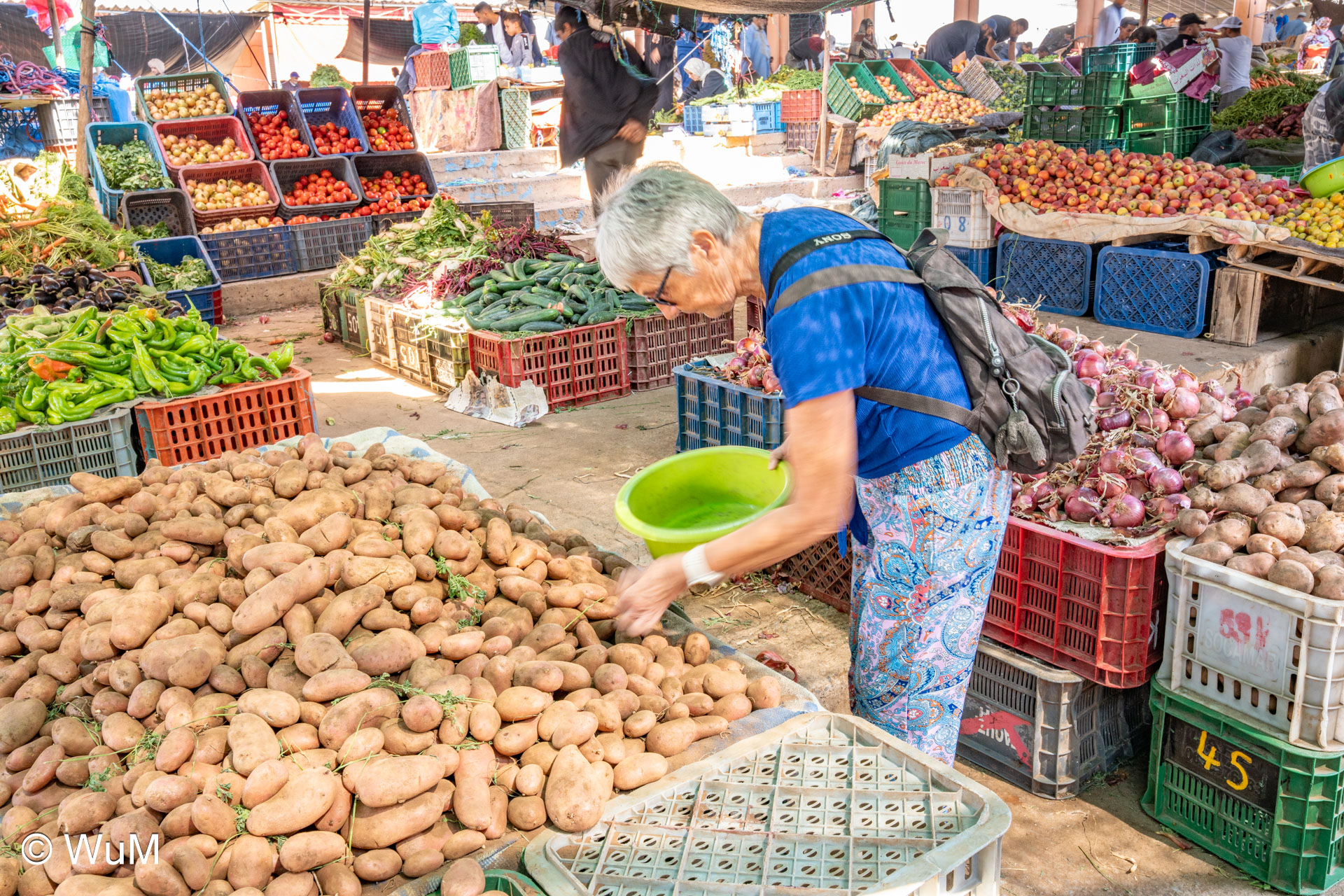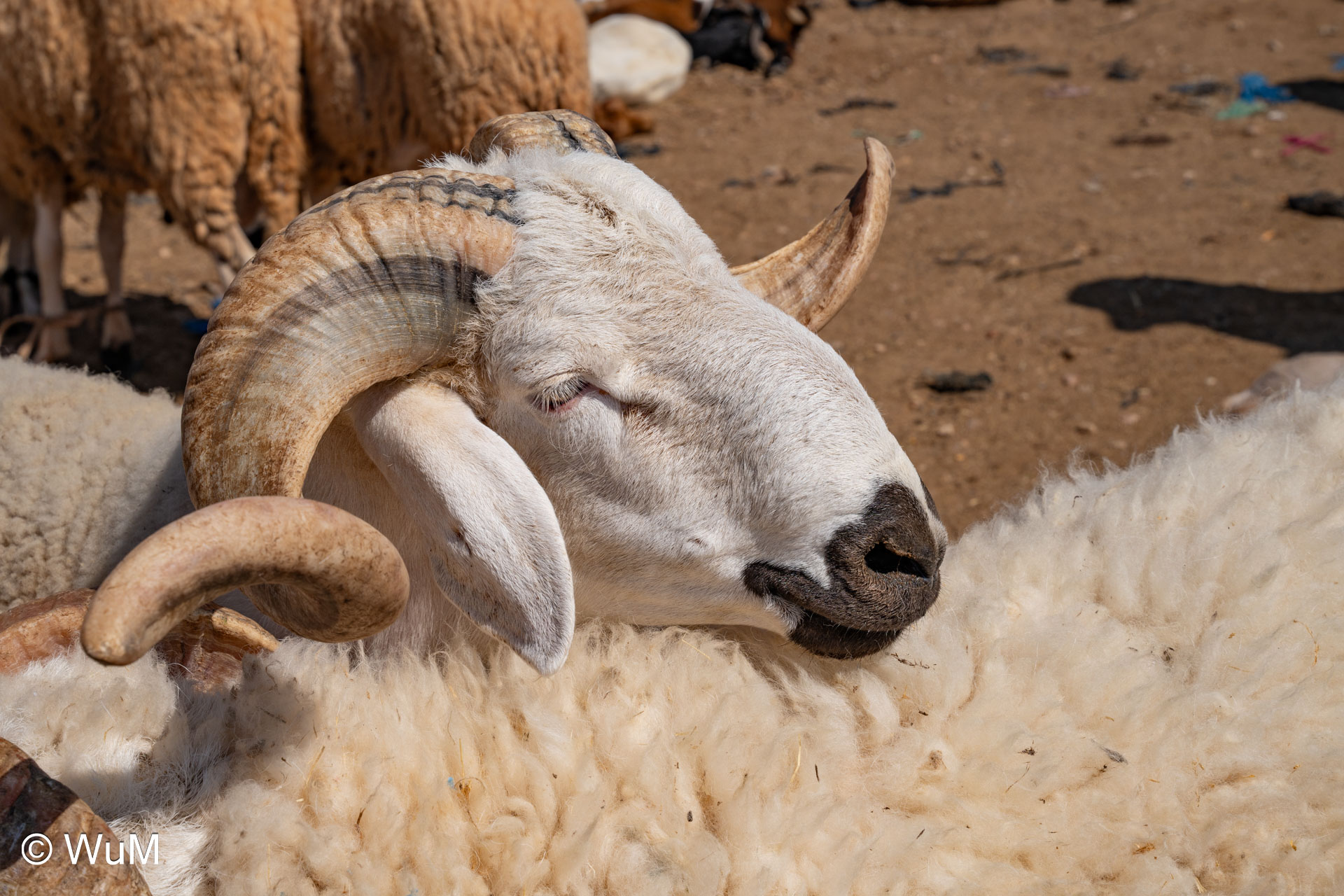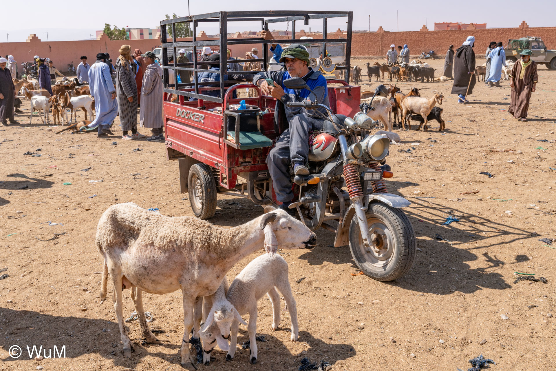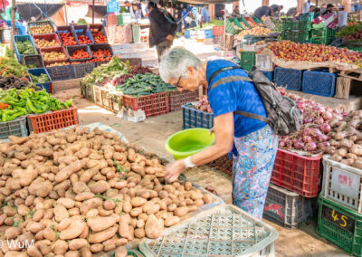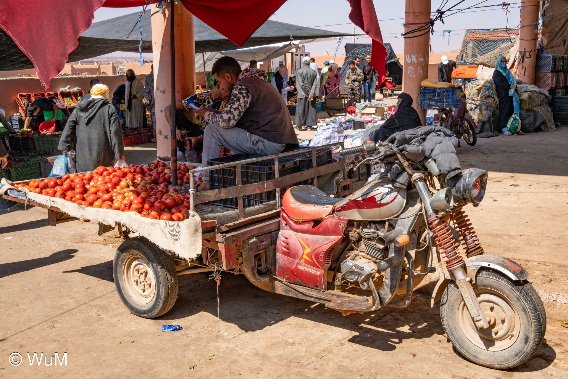 In Guelmim ist heute Kamel und Nutztiermarkt, da müssen wir hin. Über die N1 gehts durch wüstenähnliche Landschaft Richtung Süden. Guelmim war früher ein bedeutender Knotenpunkt für Karawanen aus dem Süden. Durch den Grenzkonflikt bleiben aber die Karawanen aus und der Kamelmarkt ist nur mehr ein Abklatsch früherer Zeiten. Trotzdem geht es ziemlich lebhaft zu und wir sind mitten drin. Allerdings tun uns die Tiere leid, es wird nicht zimperlich mit ihnen umgegangen. Daneben ist noch der normale Markt, wo wir uns mit Obst und Gemüse versorgen.