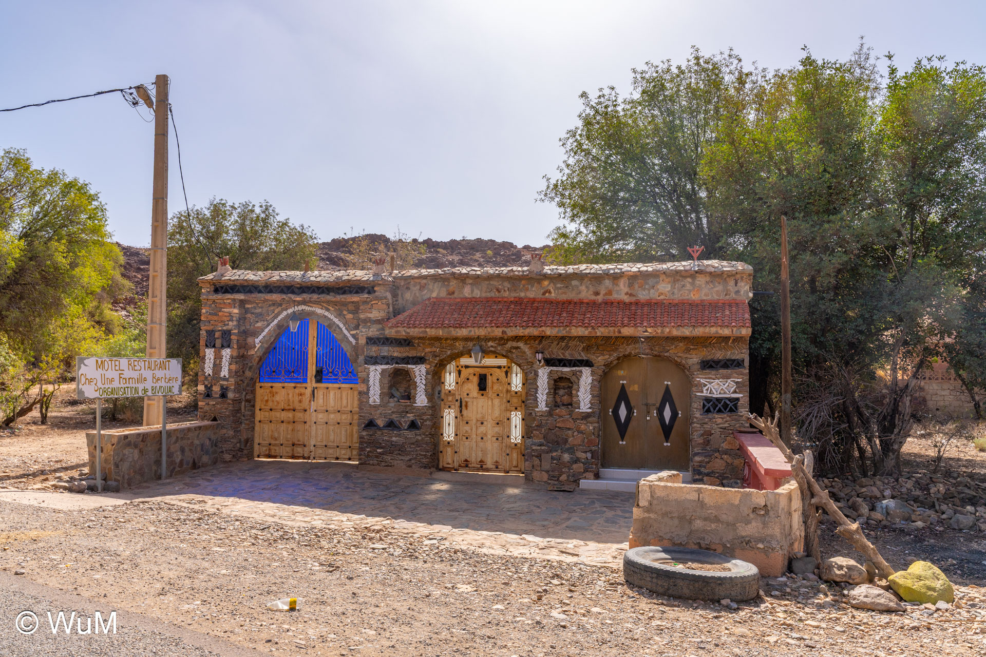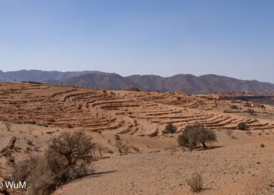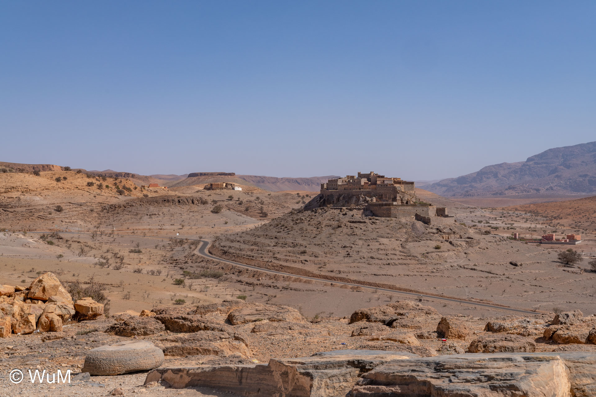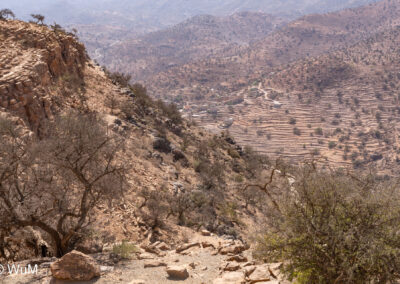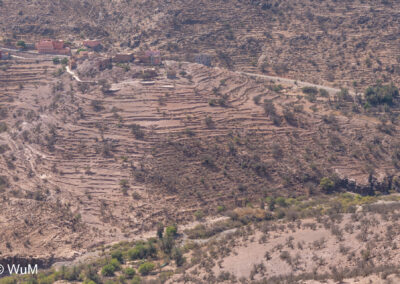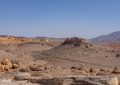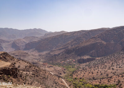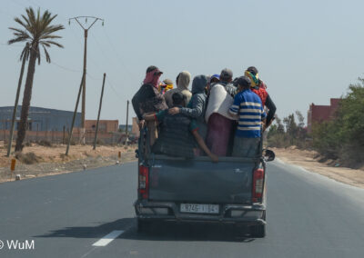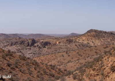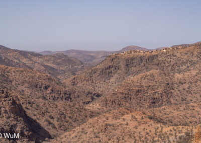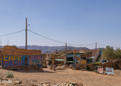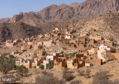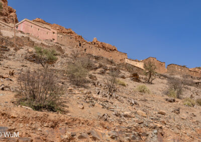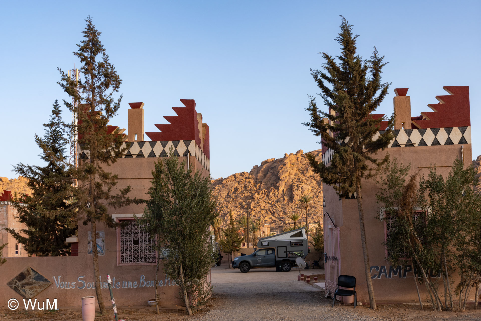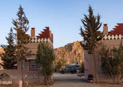 Am nächsten Tag um 10 Uhr sind die Reifen da und werden gleich montiert. Außerdem wird nocheinmal die Spur kontrolliert und fein justiert. Nach Mittag starten wir dann Richtung Tafraoute. Die Straße windet sich in unzähligen Kurven auf über 1.600 m Höhe hinauf. An den Berghängen sind immer wieder kleine Bergdörfer, in den Tälern sieht man hin und wieder Oasen. Auf 1.600 m haben wir noch immer 28 Grad! Auf dem kleinen aber feinen Campingplatz Granite Rose werden wir vom Besitzer auf Deutsch begrüßt.