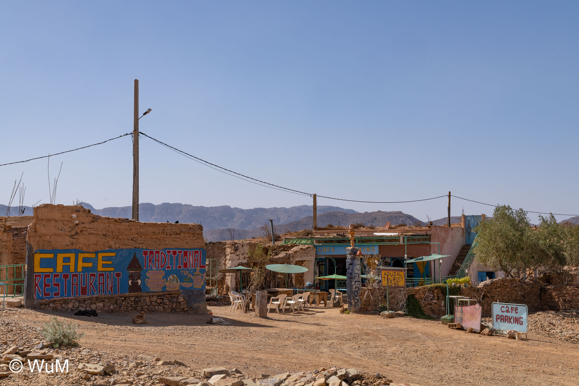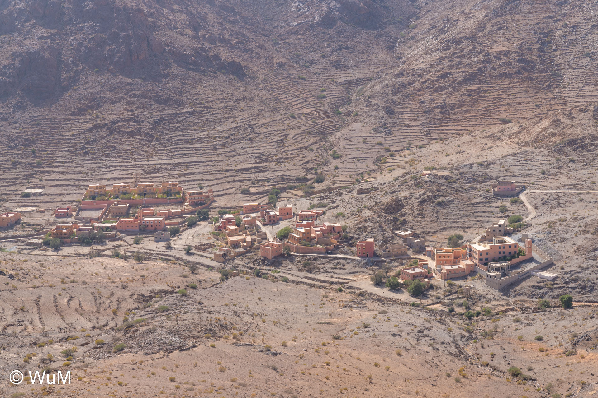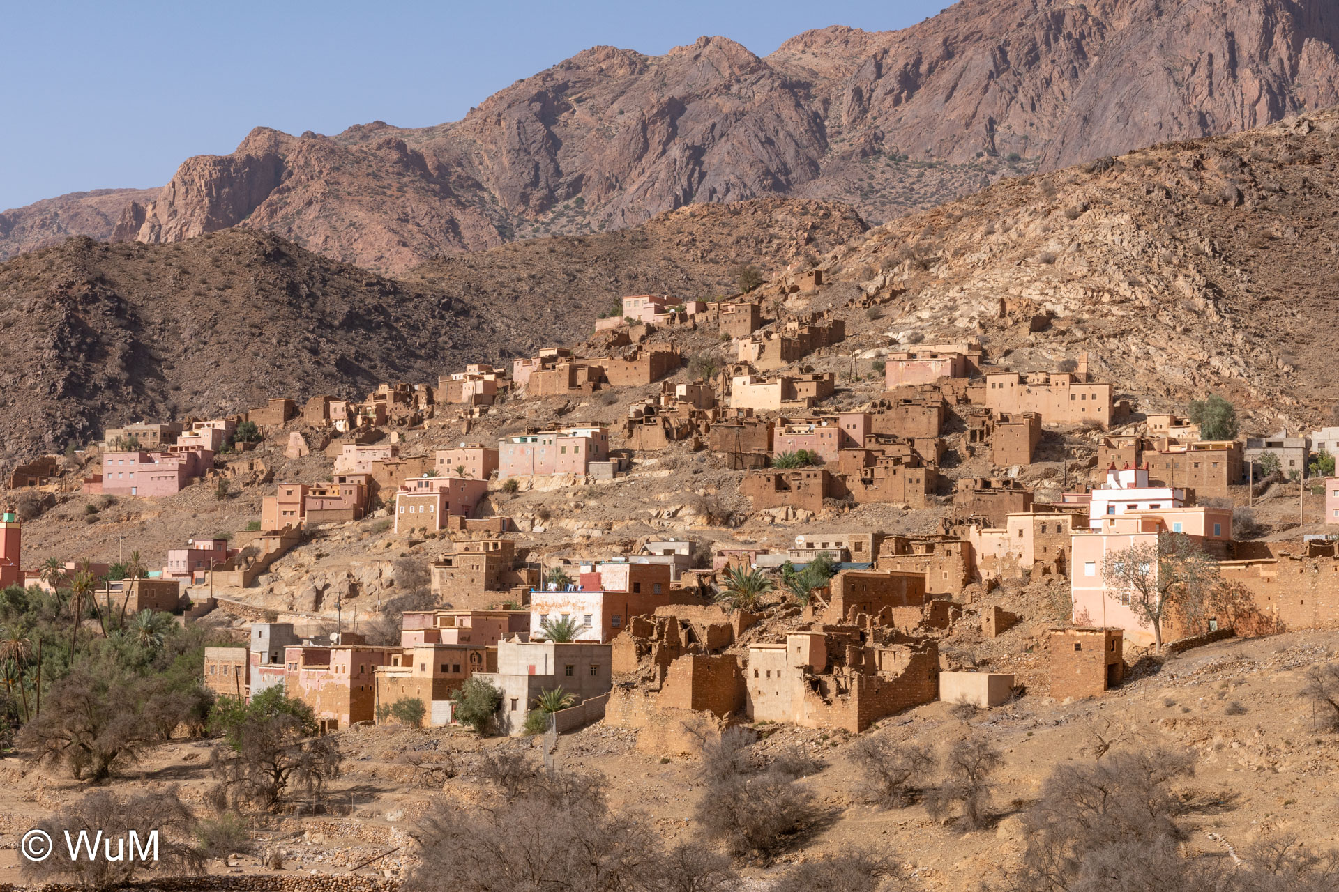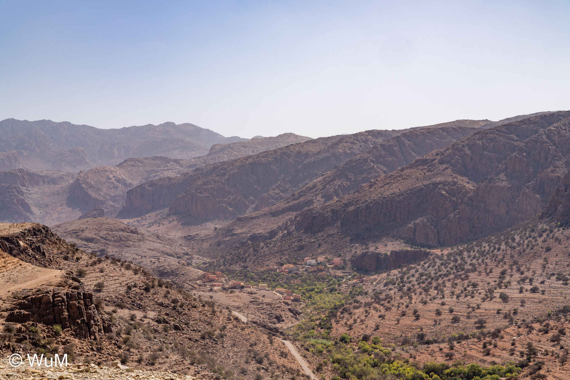 Am nächsten Tag um 10 Uhr sind die Reifen da und werden gleich montiert. Außerdem wird nocheinmal die Spur kontrolliert und fein justiert. Nach Mittag starten wir dann Richtung Tafraoute. Die Straße windet sich in unzähligen Kurven auf über 1.600 m Höhe hinauf. An den Berghängen sind immer wieder kleine Bergdörfer, in den Tälern sieht man hin und wieder Oasen. Auf 1.600 m haben wir noch immer 28 Grad! Auf dem kleinen aber feinen Campingplatz Granite Rose werden wir vom Besitzer auf Deutsch begrüßt.