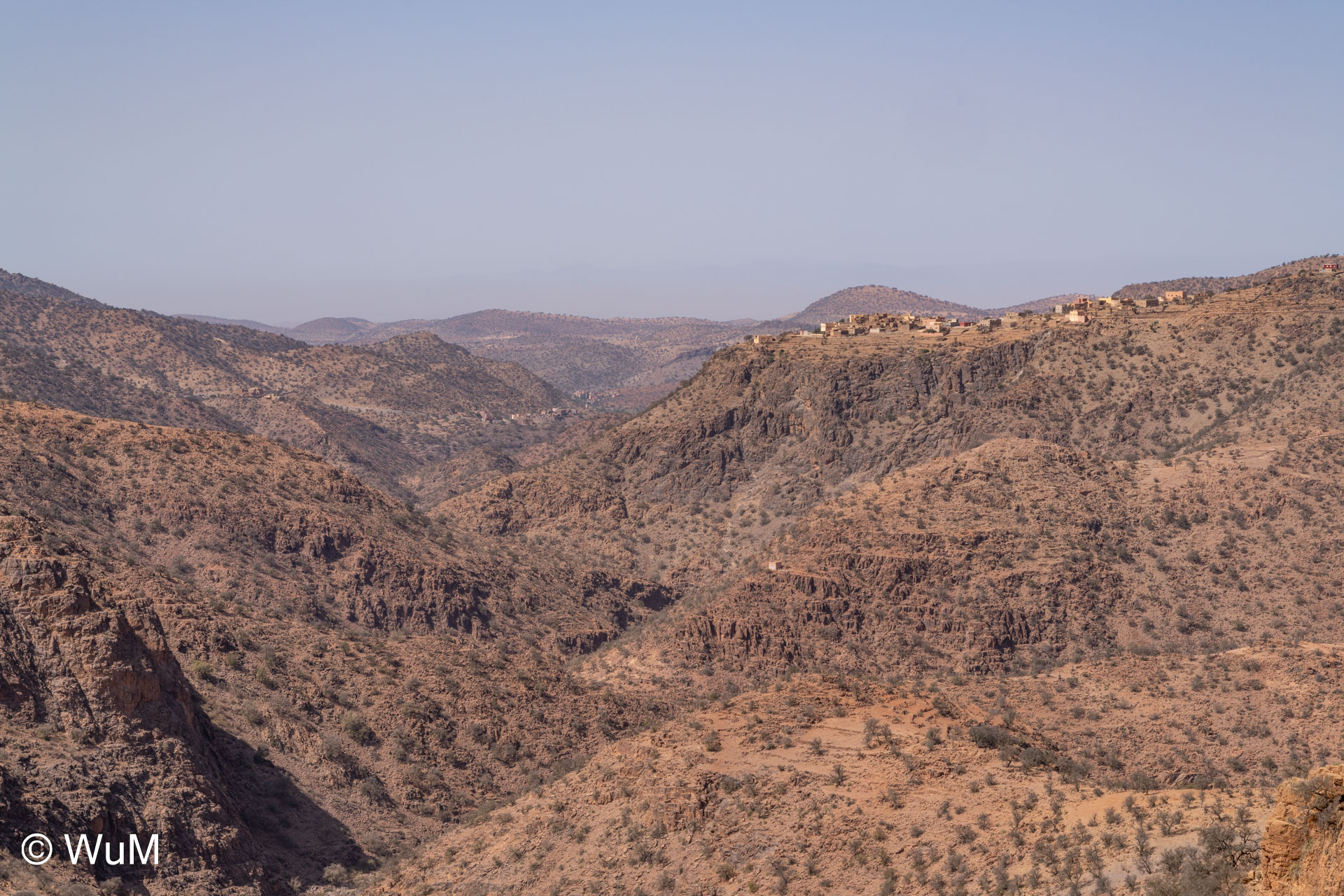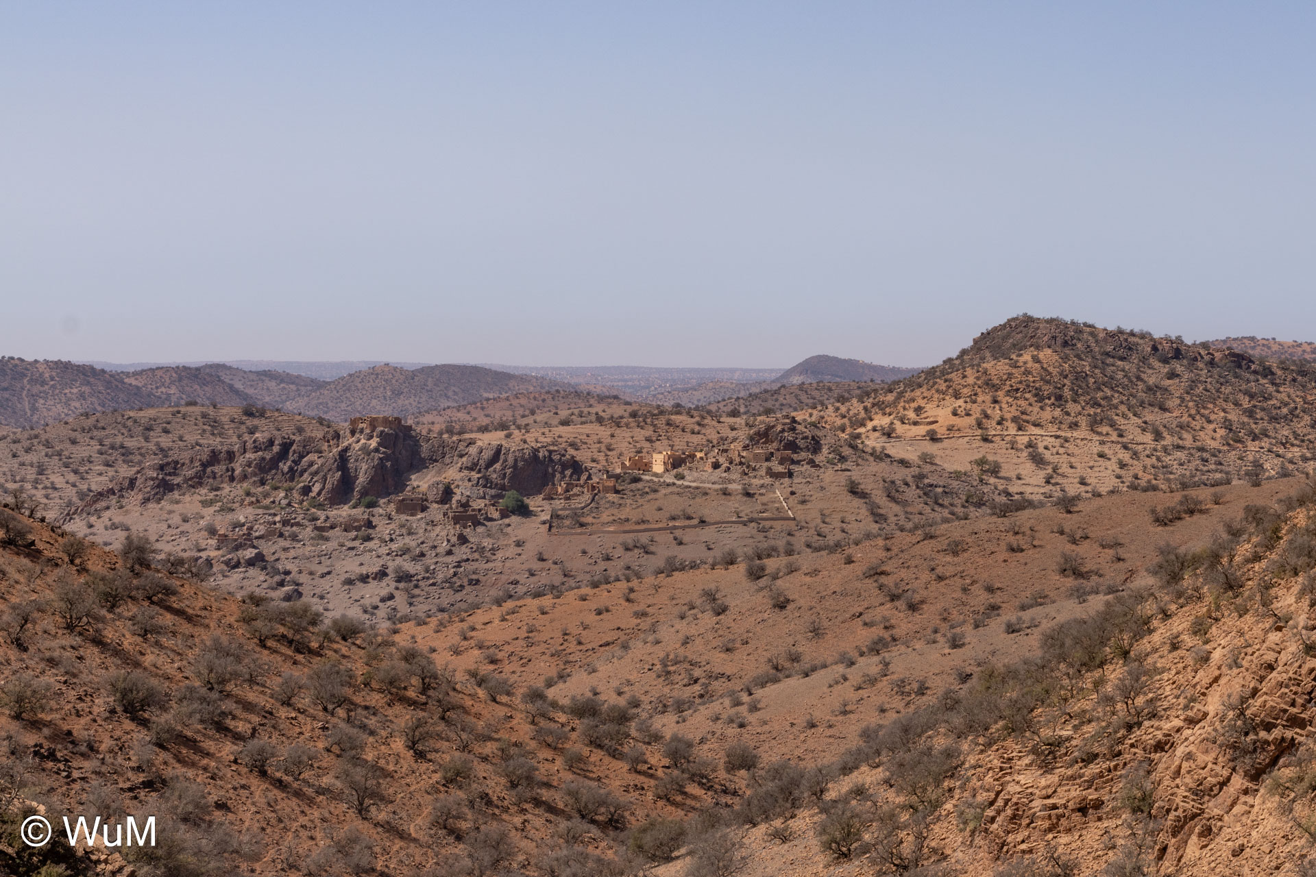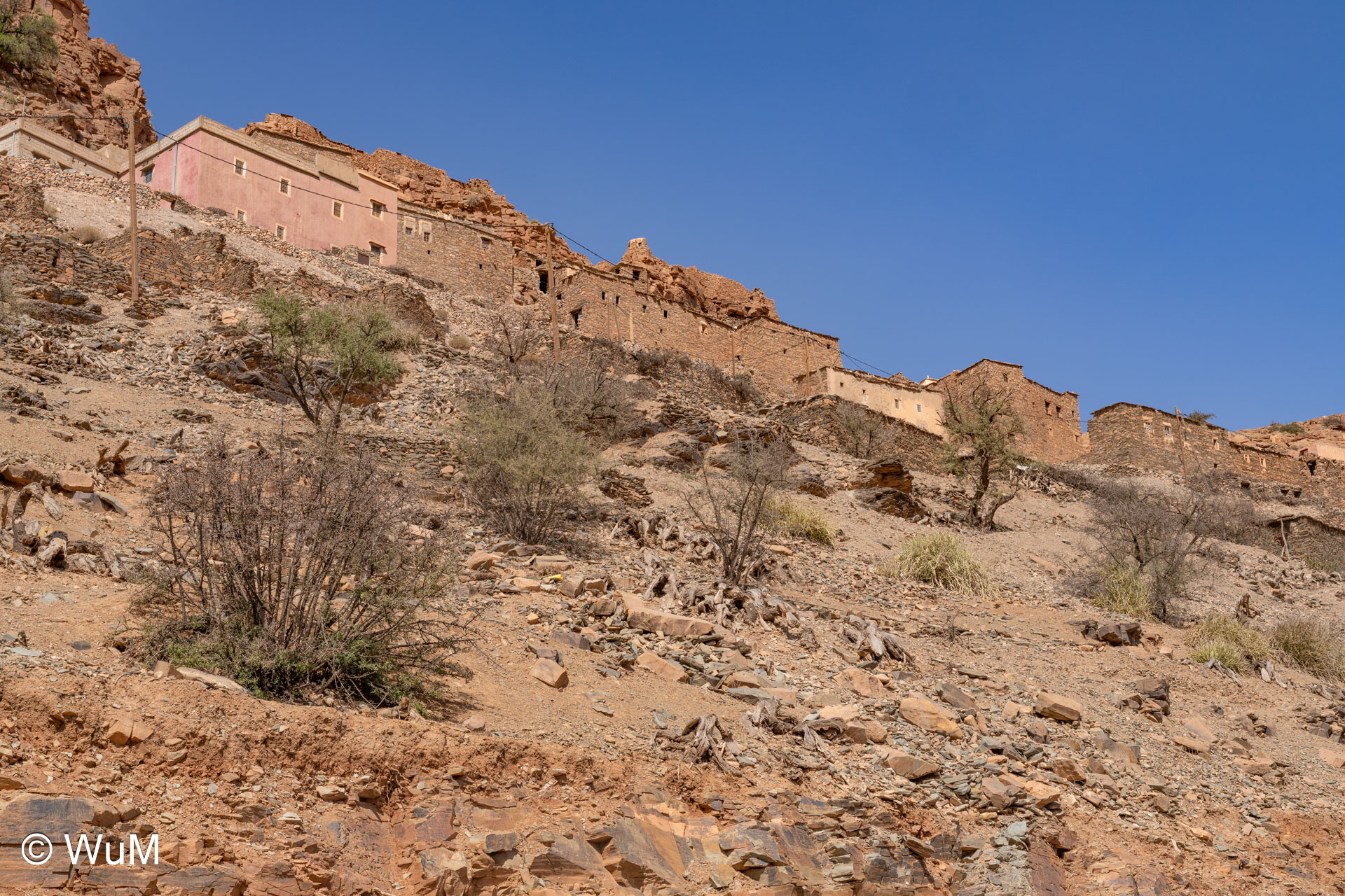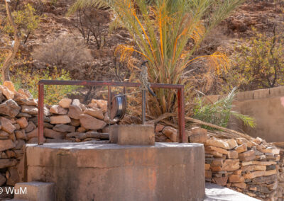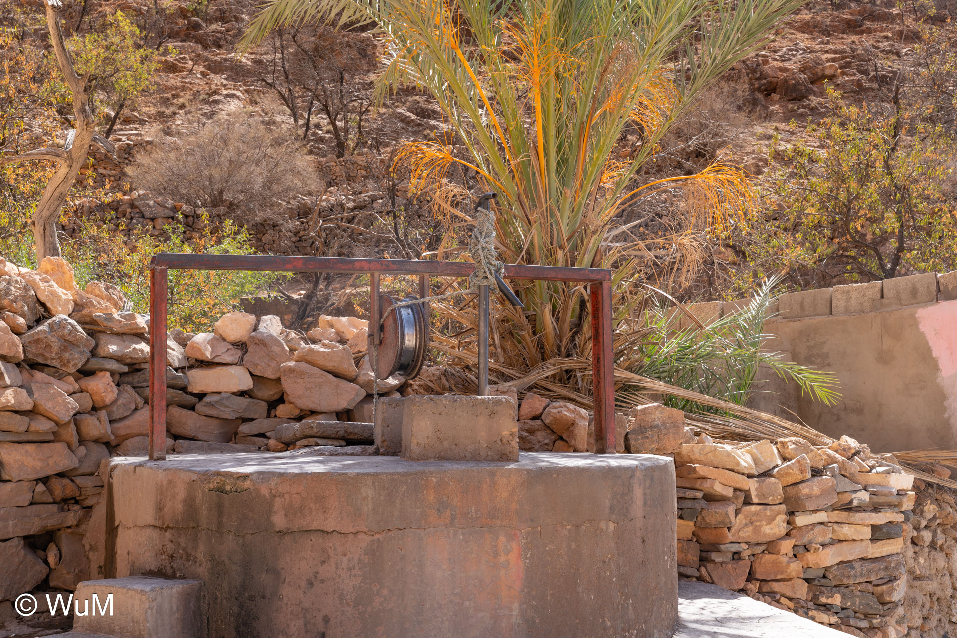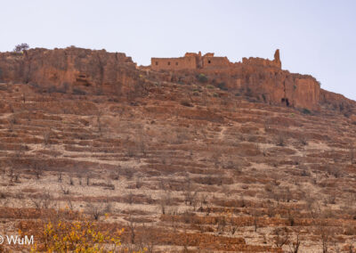 Am nächsten Tag um 10 Uhr sind die Reifen da und werden gleich montiert. Außerdem wird nocheinmal die Spur kontrolliert und fein justiert. Nach Mittag starten wir dann Richtung Tafraoute. Die Straße windet sich in unzähligen Kurven auf über 1.600 m Höhe hinauf. An den Berghängen sind immer wieder kleine Bergdörfer, in den Tälern sieht man hin und wieder Oasen. Auf 1.600 m haben wir noch immer 28 Grad! Auf dem kleinen aber feinen Campingplatz Granite Rose werden wir vom Besitzer auf Deutsch begrüßt.