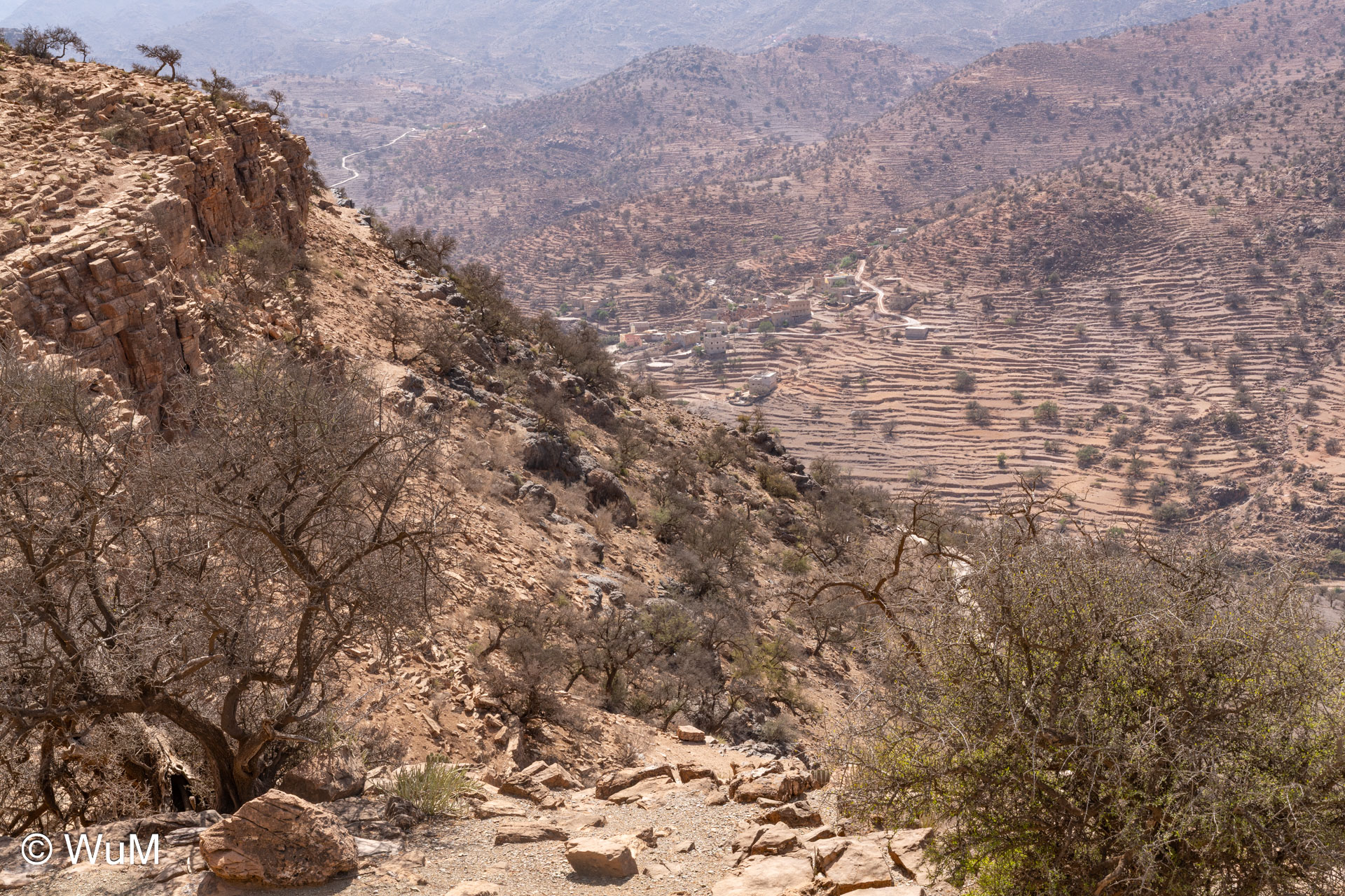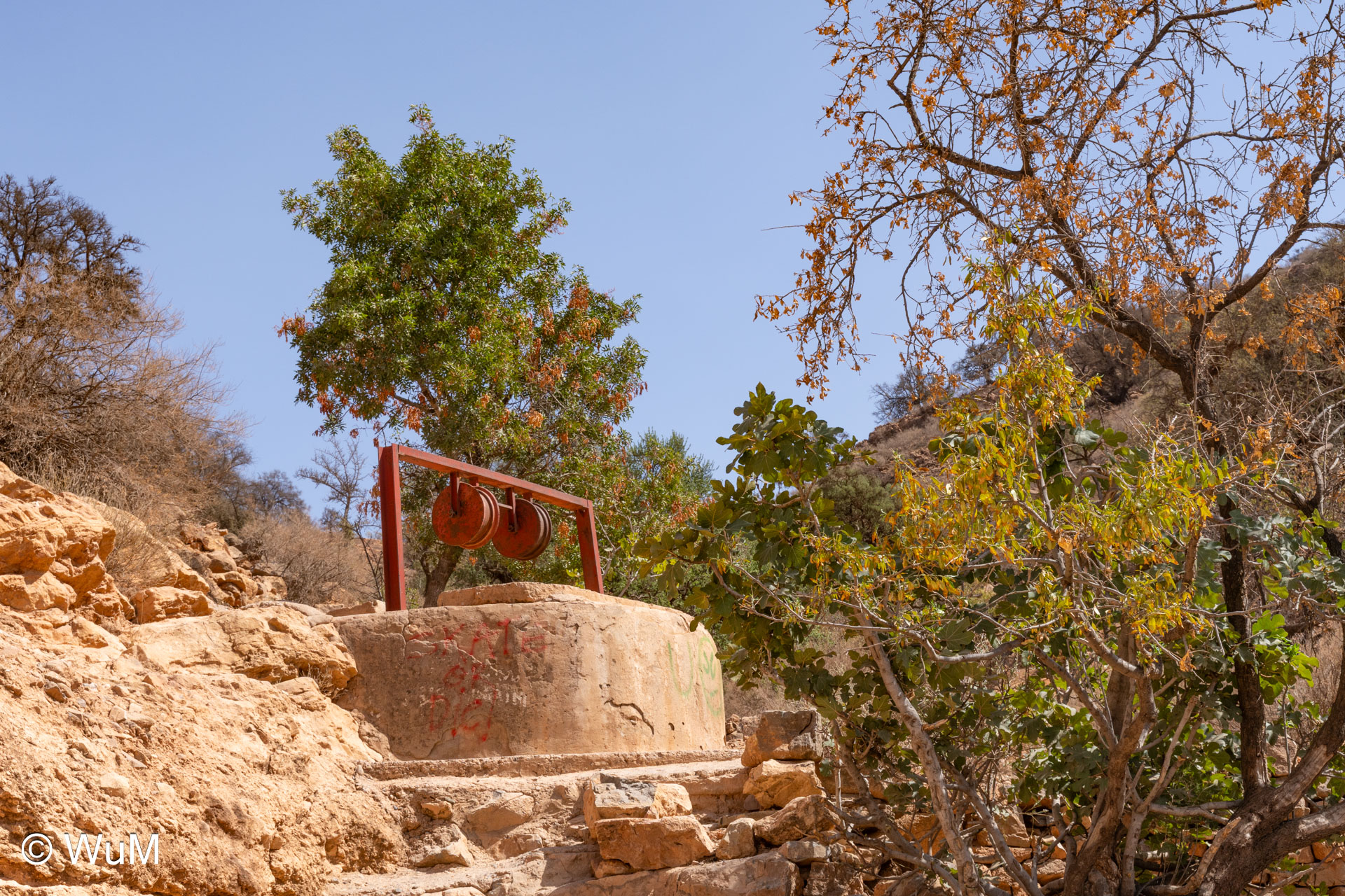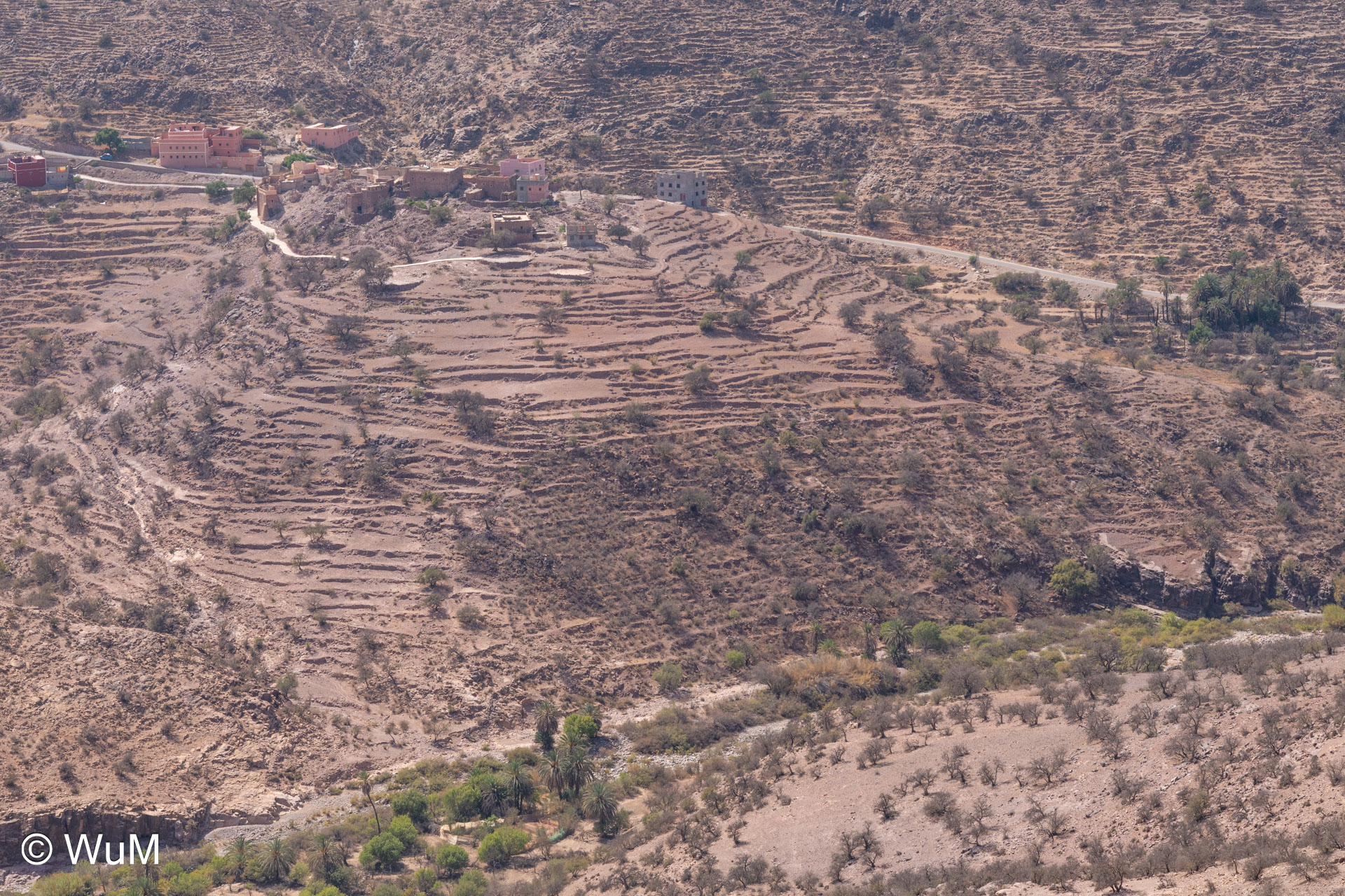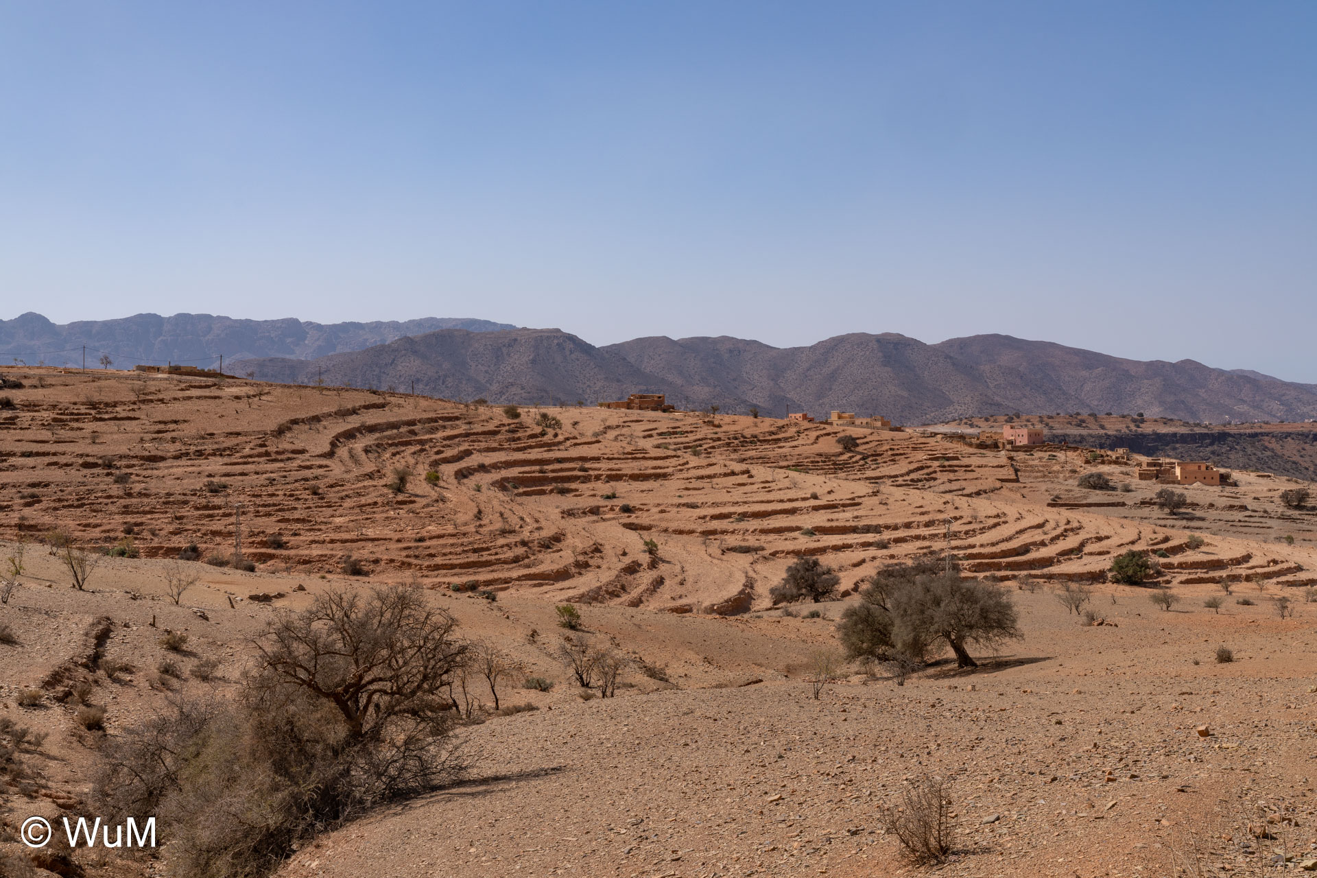 Am nächsten Tag um 10 Uhr sind die Reifen da und werden gleich montiert. Außerdem wird nocheinmal die Spur kontrolliert und fein justiert. Nach Mittag starten wir dann Richtung Tafraoute. Die Straße windet sich in unzähligen Kurven auf über 1.600 m Höhe hinauf. An den Berghängen sind immer wieder kleine Bergdörfer, in den Tälern sieht man hin und wieder Oasen. Auf 1.600 m haben wir noch immer 28 Grad! Auf dem kleinen aber feinen Campingplatz Granite Rose werden wir vom Besitzer auf Deutsch begrüßt.