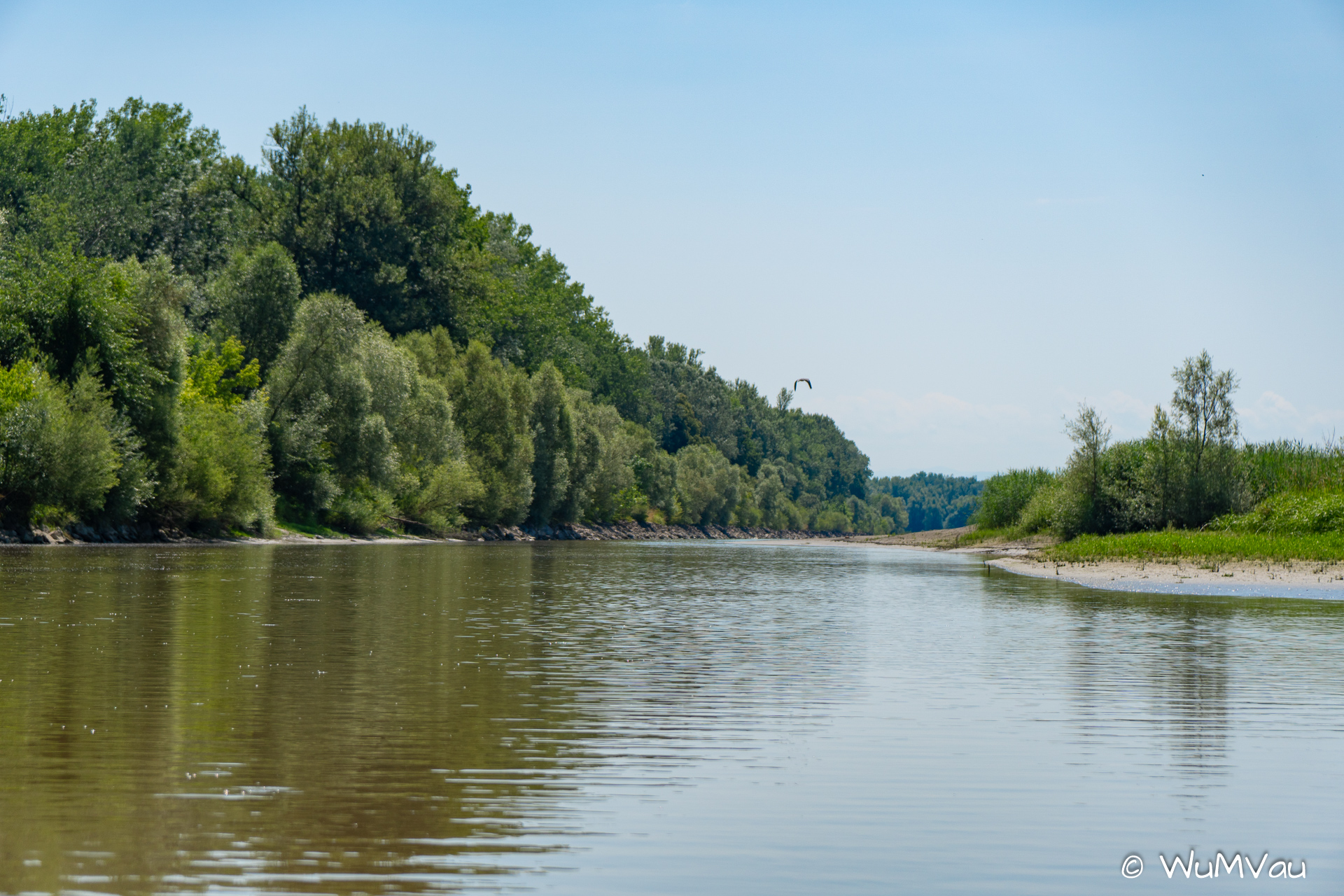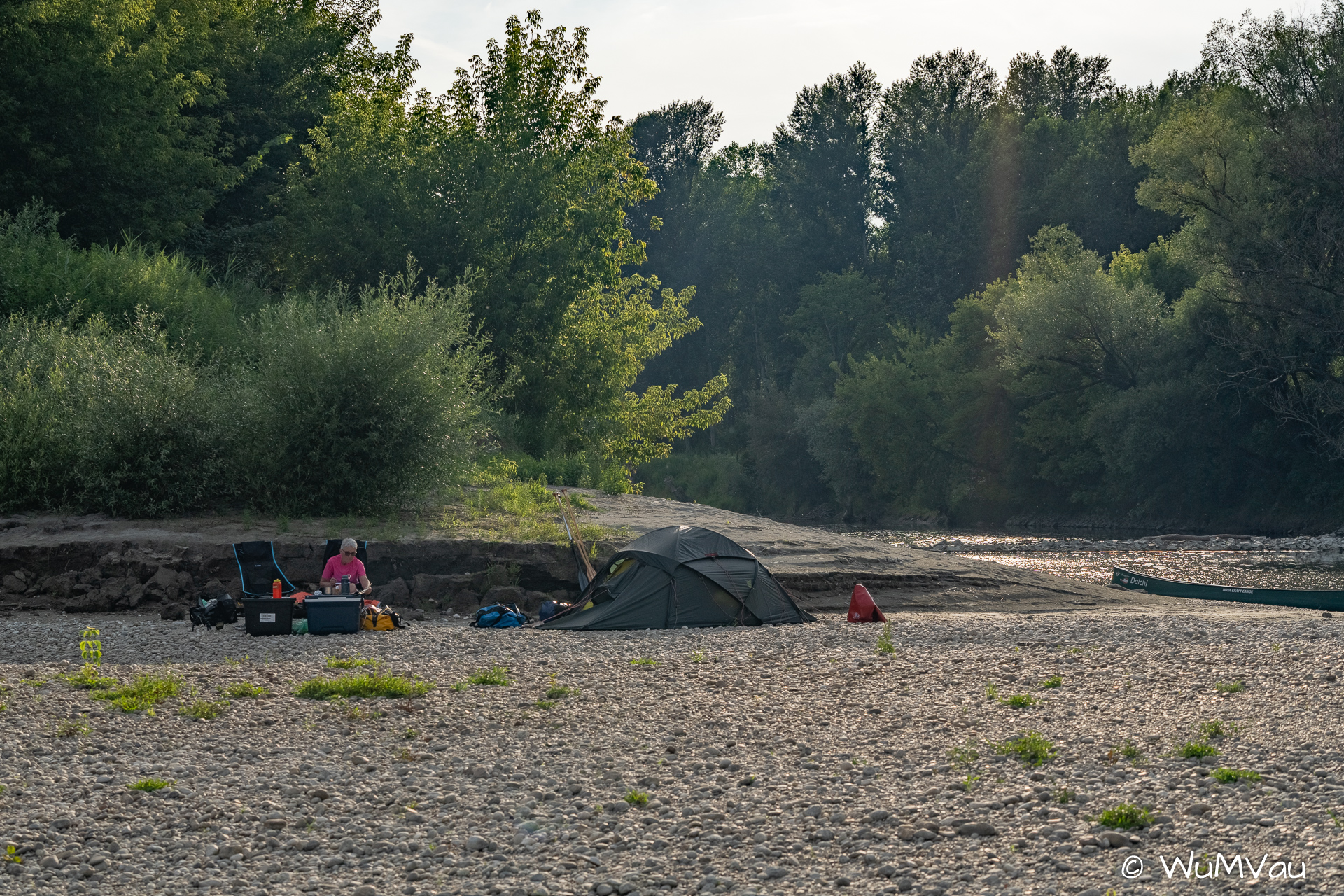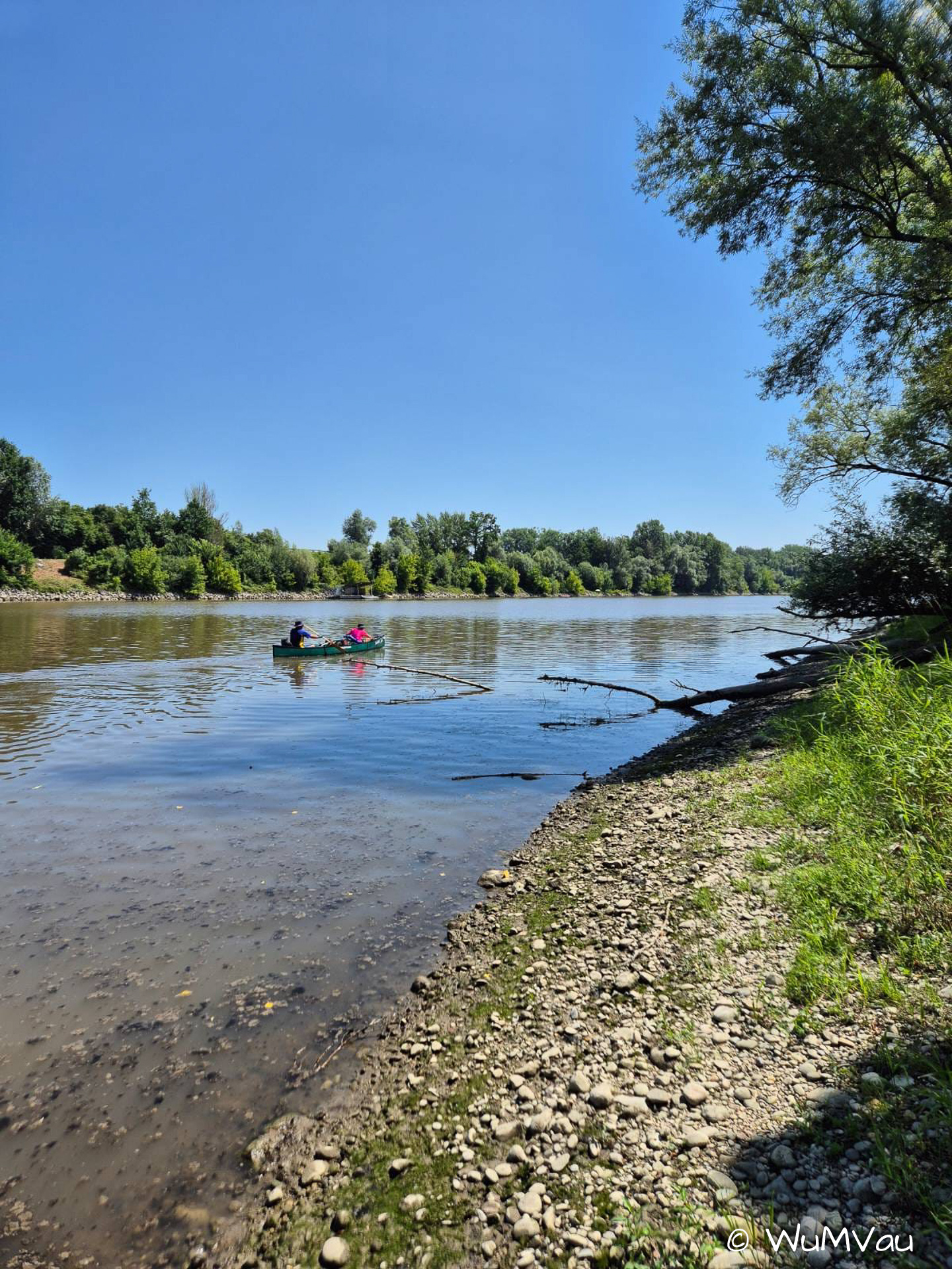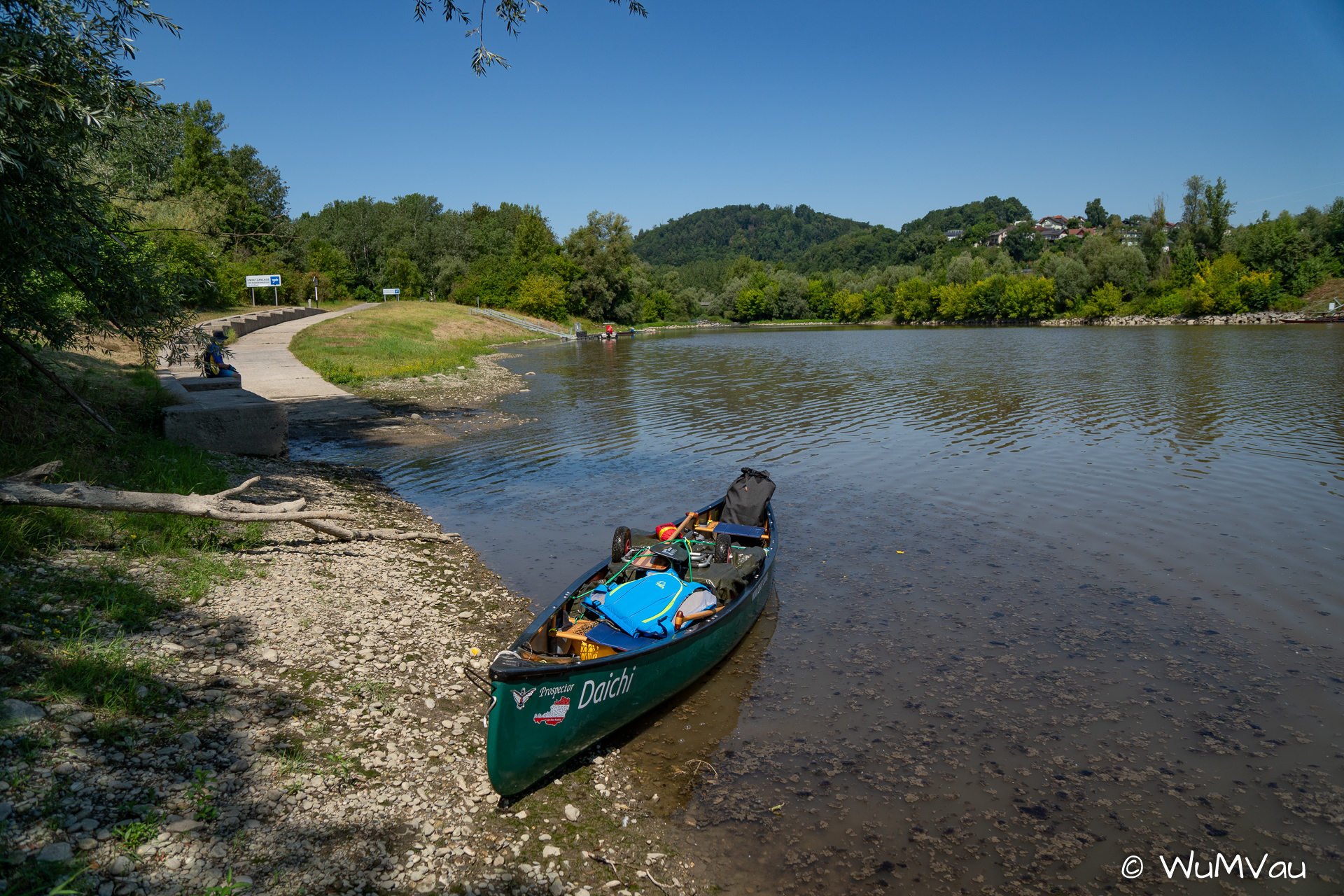 Pünktlich holt uns Martin am nächsten Tag in der Früh ab und bringt uns zum EKRV Donau. Auch unsere Freunde Brigitte und Wolfgang lassen es sich nicht nehmen und sind bei unserem Start dabei. Sie haben ein Geschenk für die Reise dabei – eine gute Flasche Rotwein. Um 9 Uhr haben wir fertig gepackt und wir starten. Nach 2 Stunden erreichen wir das Kraftwerk Abwinden Asten. Wir müssen das Kanu in den Altarm übersetzen. Dort treffen wir noch Steffi und Carina, die mit dem Fahrrad gekommen sind. Nach einer kurzen Pause geht es weiter. Unseren geplanten Stopp für diesen Tag – Au an der Donau – erreichen wir zu bald und wir fahren weiter. Bis Wallsee finden wir dann keinen Lagerplatz. Der Altarm beim Kraftwerk ist wegen zu niedrigem Wasserstand gesperrt und wir müssen (dürfen) die Schleuse benützen. Bis wir schließlich einen Lagerplatz finden, sind wir 44 km gefahren. Trotz einiger Badestopps war es ein heißer Tag. Wir bauen auf der Schotterbank unser Zelt auf und gehen noch ein paar Mal baden.