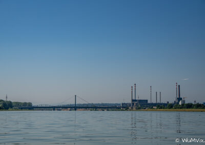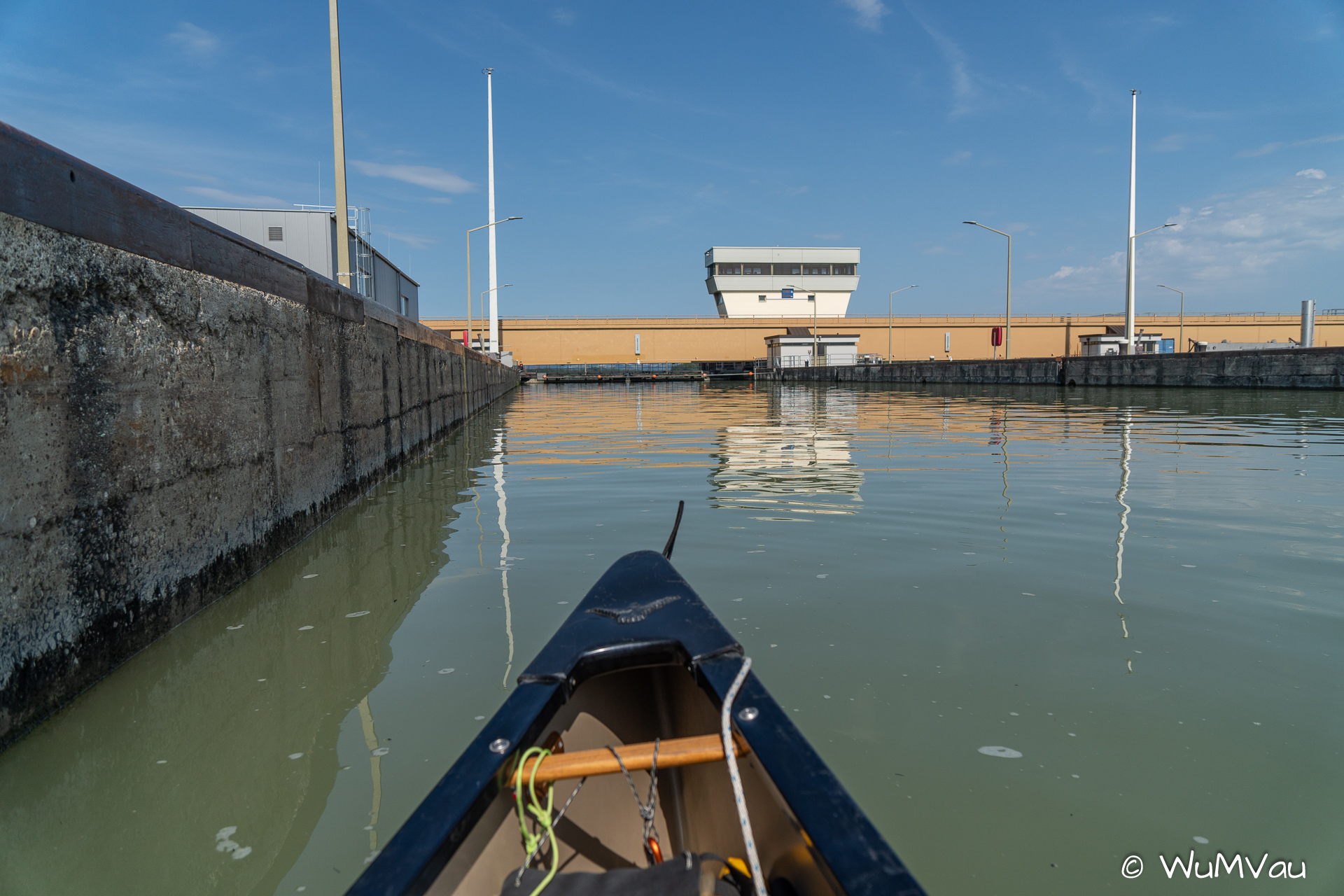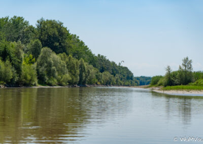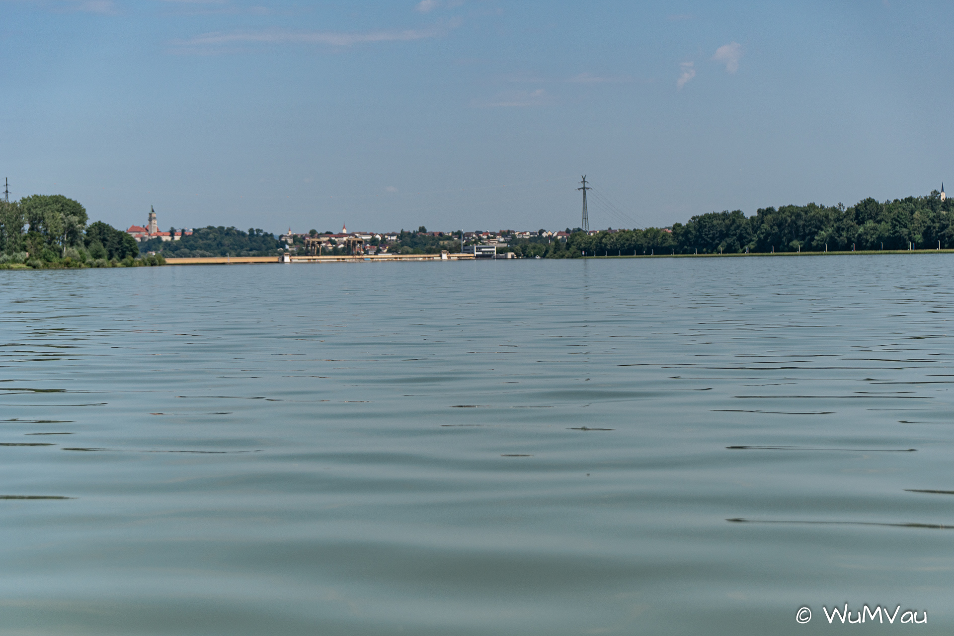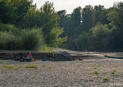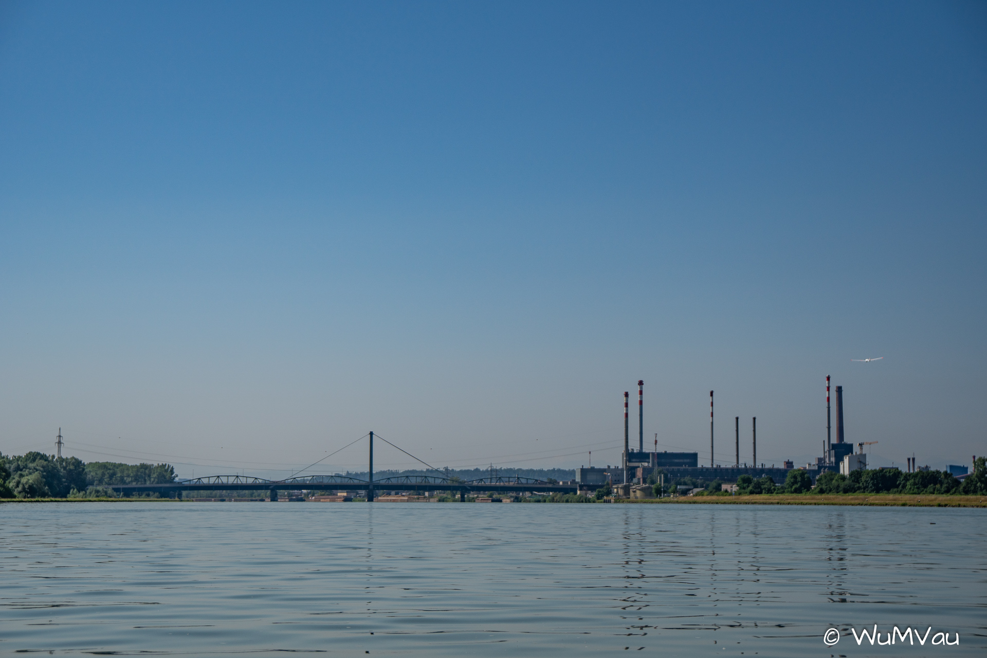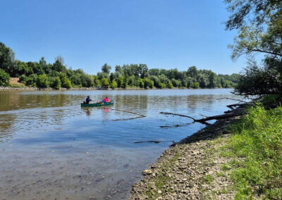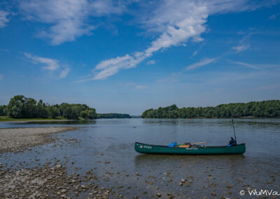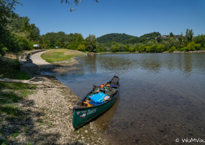 Pünktlich holt uns Martin am nächsten Tag in der Früh ab und bringt uns zum EKRV Donau. Auch unsere Freunde Brigitte und Wolfgang lassen es sich nicht nehmen und sind bei unserem Start dabei. Sie haben ein Geschenk für die Reise dabei – eine gute Flasche Rotwein. Um 9 Uhr haben wir fertig gepackt und wir starten. Nach 2 Stunden erreichen wir das Kraftwerk Abwinden Asten. Wir müssen das Kanu in den Altarm übersetzen. Dort treffen wir noch Steffi und Carina, die mit dem Fahrrad gekommen sind. Nach einer kurzen Pause geht es weiter. Unseren geplanten Stopp für diesen Tag – Au an der Donau – erreichen wir zu bald und wir fahren weiter. Bis Wallsee finden wir dann keinen Lagerplatz. Der Altarm beim Kraftwerk ist wegen zu niedrigem Wasserstand gesperrt und wir müssen (dürfen) die Schleuse benützen. Bis wir schließlich einen Lagerplatz finden, sind wir 44 km gefahren. Trotz einiger Badestopps war es ein heißer Tag. Wir bauen auf der Schotterbank unser Zelt auf und gehen noch ein paar Mal baden.
