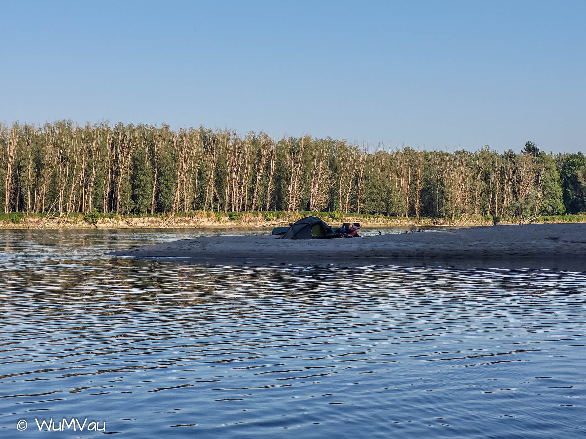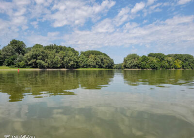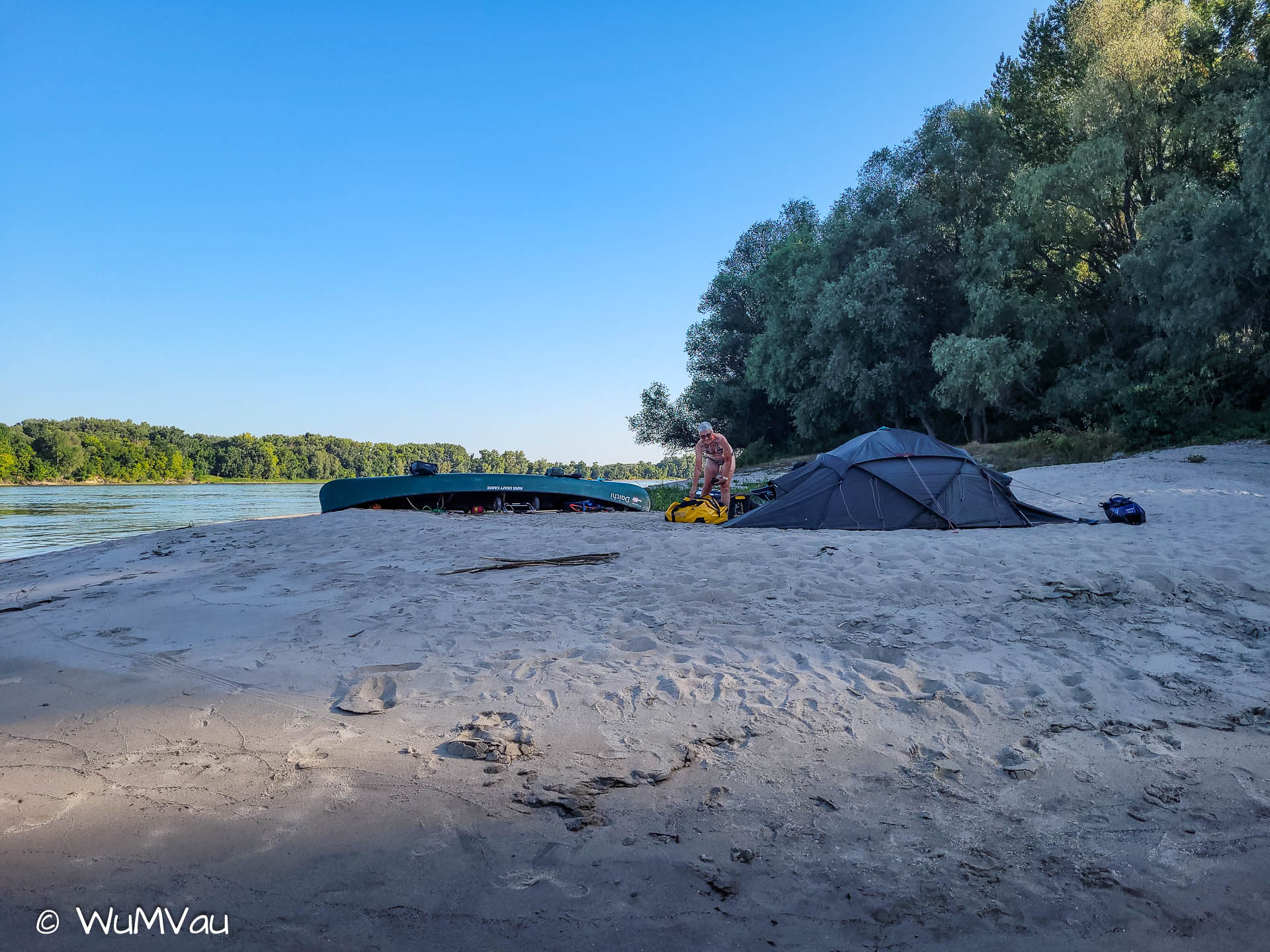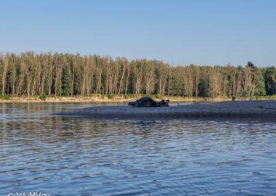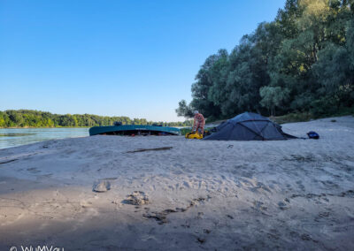 Wir sind auch heute wieder bald am Wasser. Es wird wieder ein heißer Tag. Bei sehr wenig Strömung schaffen wir bis zur Mittagspause aber immerhin 38 km. Dann haben wir uns einen Kaffee und Apfelstrudel verdient. Den genießen wir in der Rev Csarda. Ein sehr schönes Lokal und der Besitzer spricht deutsch. Mit neuem Elan geht’s dann weiter, wir möchten uns nicht zum viele Kilometer für den letzten Tag aufheben. Auf einer sehr sandigen Halbinsel schlagen wir unser letztes Camp auf.