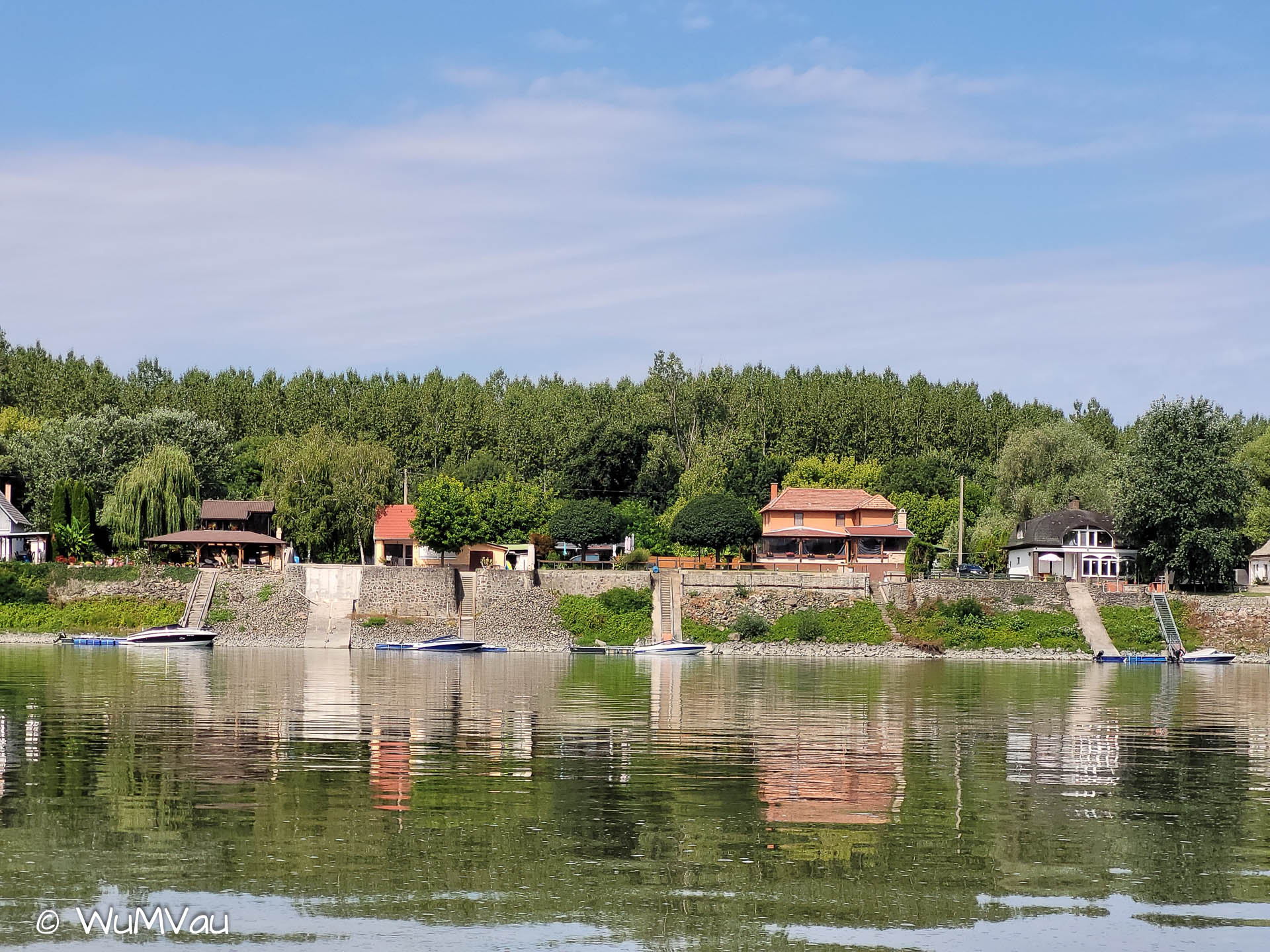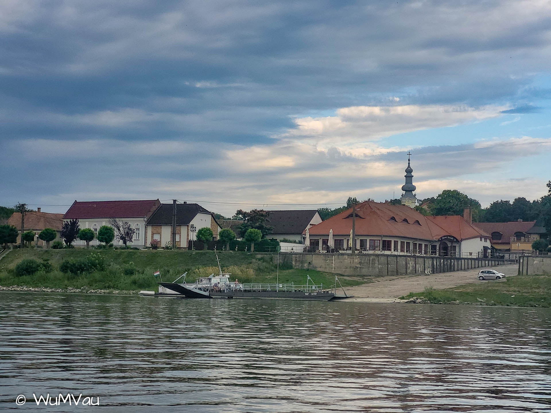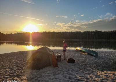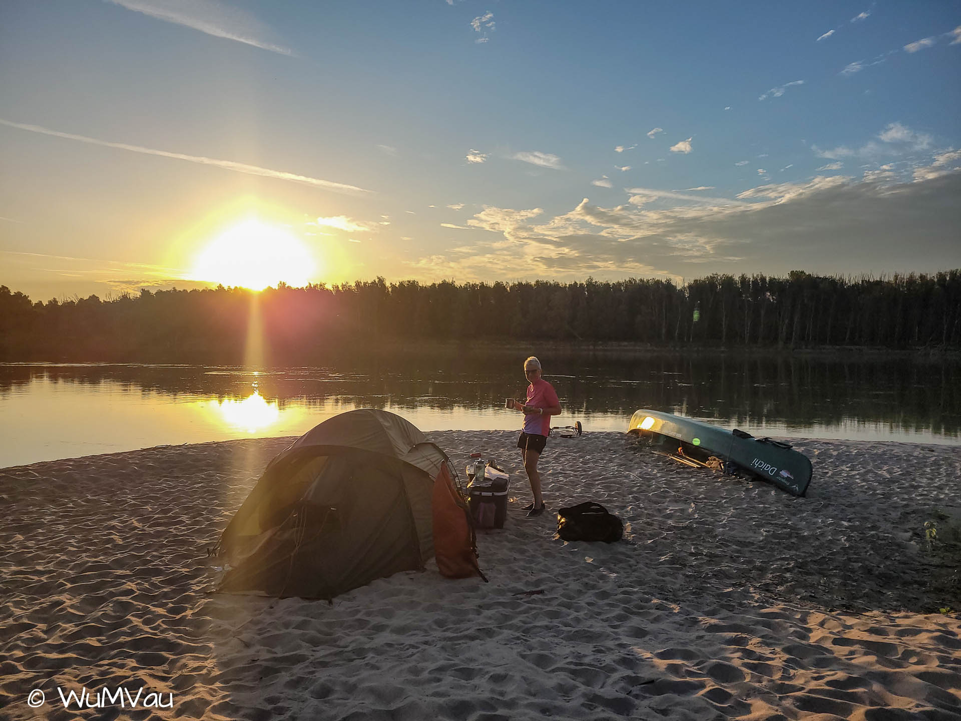 Wir sind auch heute wieder bald am Wasser. Es wird wieder ein heißer Tag. Bei sehr wenig Strömung schaffen wir bis zur Mittagspause aber immerhin 38 km. Dann haben wir uns einen Kaffee und Apfelstrudel verdient. Den genießen wir in der Rev Csarda. Ein sehr schönes Lokal und der Besitzer spricht deutsch. Mit neuem Elan geht’s dann weiter, wir möchten uns nicht zum viele Kilometer für den letzten Tag aufheben. Auf einer sehr sandigen Halbinsel schlagen wir unser letztes Camp auf.