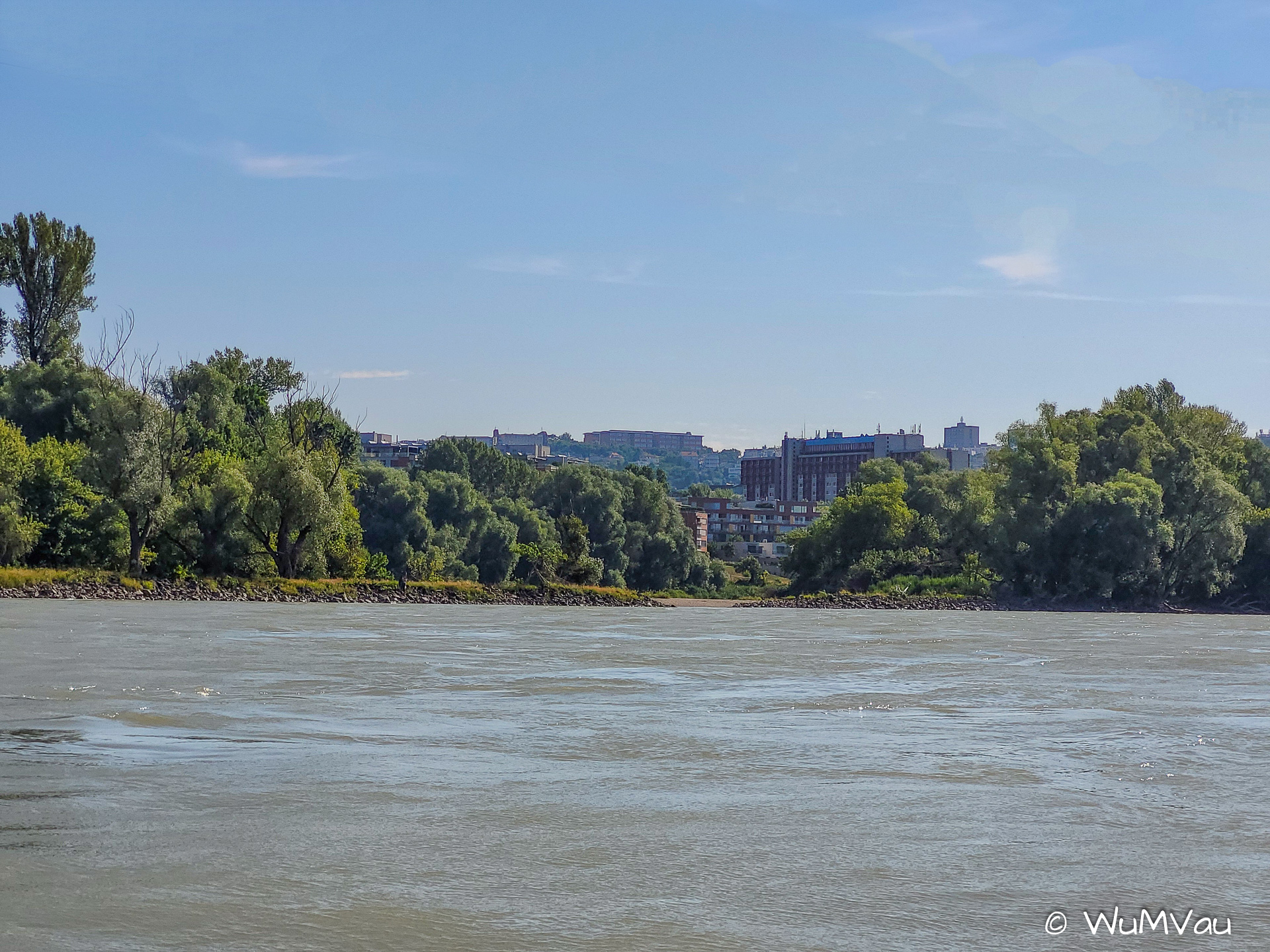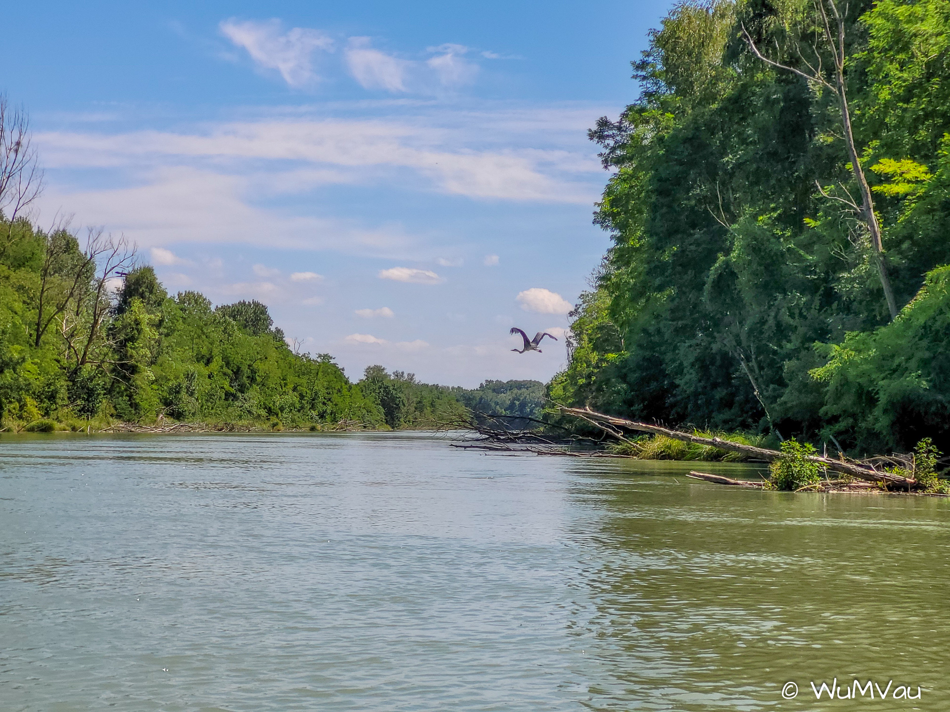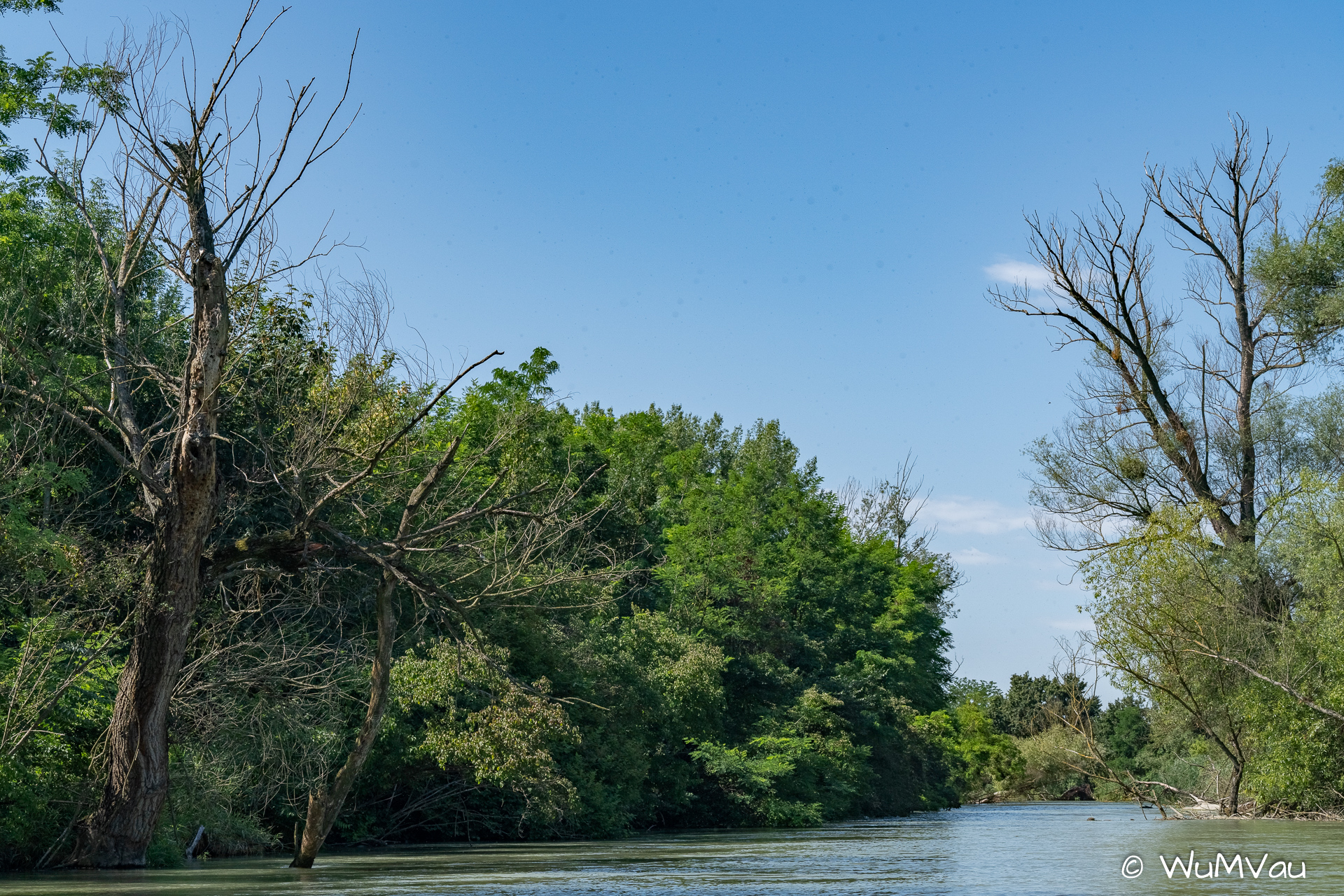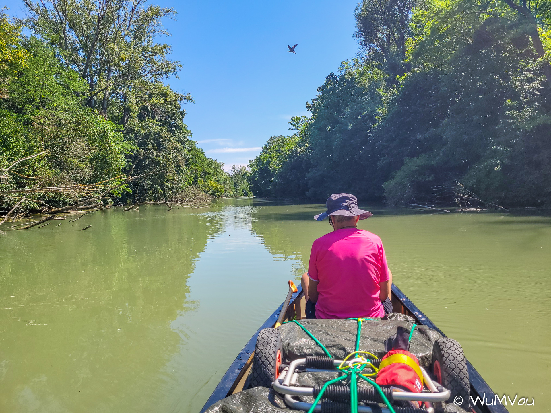In der Früh scheint die Sonne und wir brechen bald auf. Da wir nahe einer langen Buhne unser Camp aufgeschlagen hatten, treideln wir ein Stück stromaufwärts, um sicher vorbei zu kommen. Wir haben starken Gegenwind, dank der Strömung kommen wir trotzdem gut voran und erreichen bald Bratislava. Kurz nach Bratislava macht sich der Staubereich des Kraftwerkes Gabcikovo bemerkbar. Bei Stromkilometer 1852 nahe des Wehrs Mosonske Rameno gehen wir an Land. Nun beginnt der bis jetzt härteste Teil unserer Reise. Bei 30 Grad ziehen wir unser Boot und die gesamte Ausrüstung bis zu einem Sperrwerk. Nach gut zwei Stunden sind wir dort und bringen unser Boot über einen steilen Abhang wieder ins Wasser. Wir haben die Mosoni Donau erreicht. Von diesem naturbelassenen Arm sind wir sofort fasziniert. Wir sehen viele Reiher, Kormorane und andere Vögel. Es liegen viele umgefallene Bäume im Wasser und wir müssen Slalom fahren um durchzukommen. Schließlich erreichen wir unser heutiges Tagesziel, den Campingplatz Rajka.