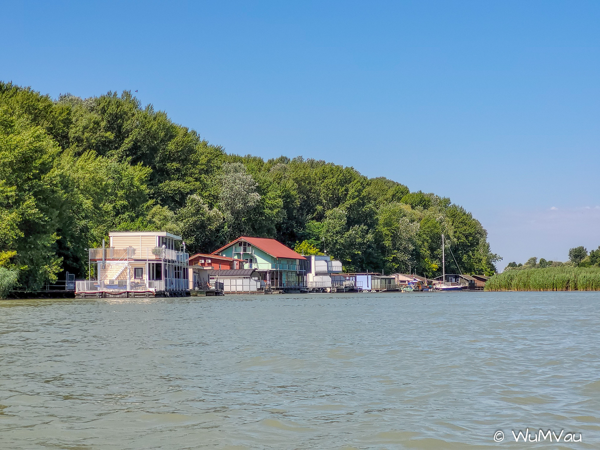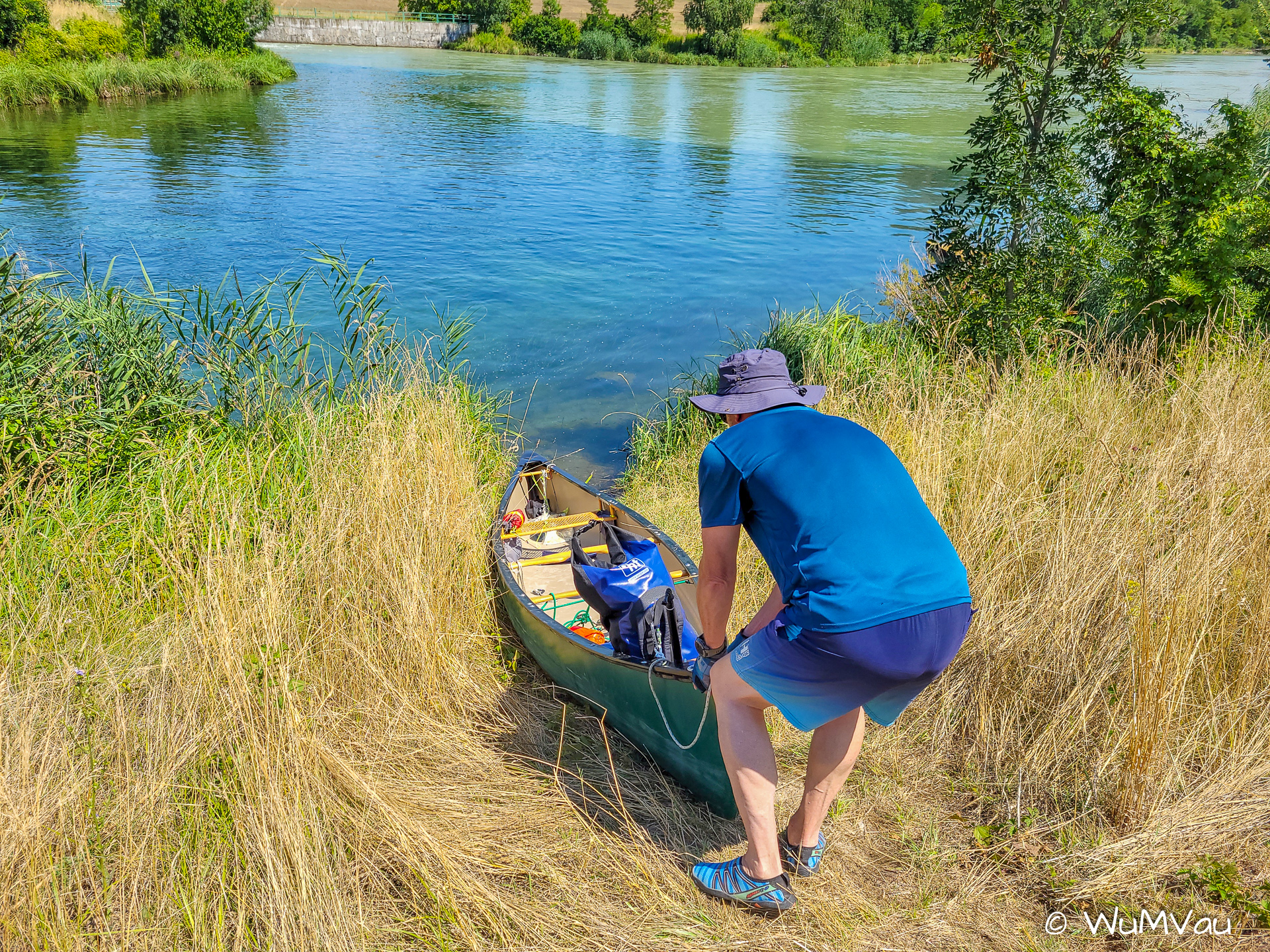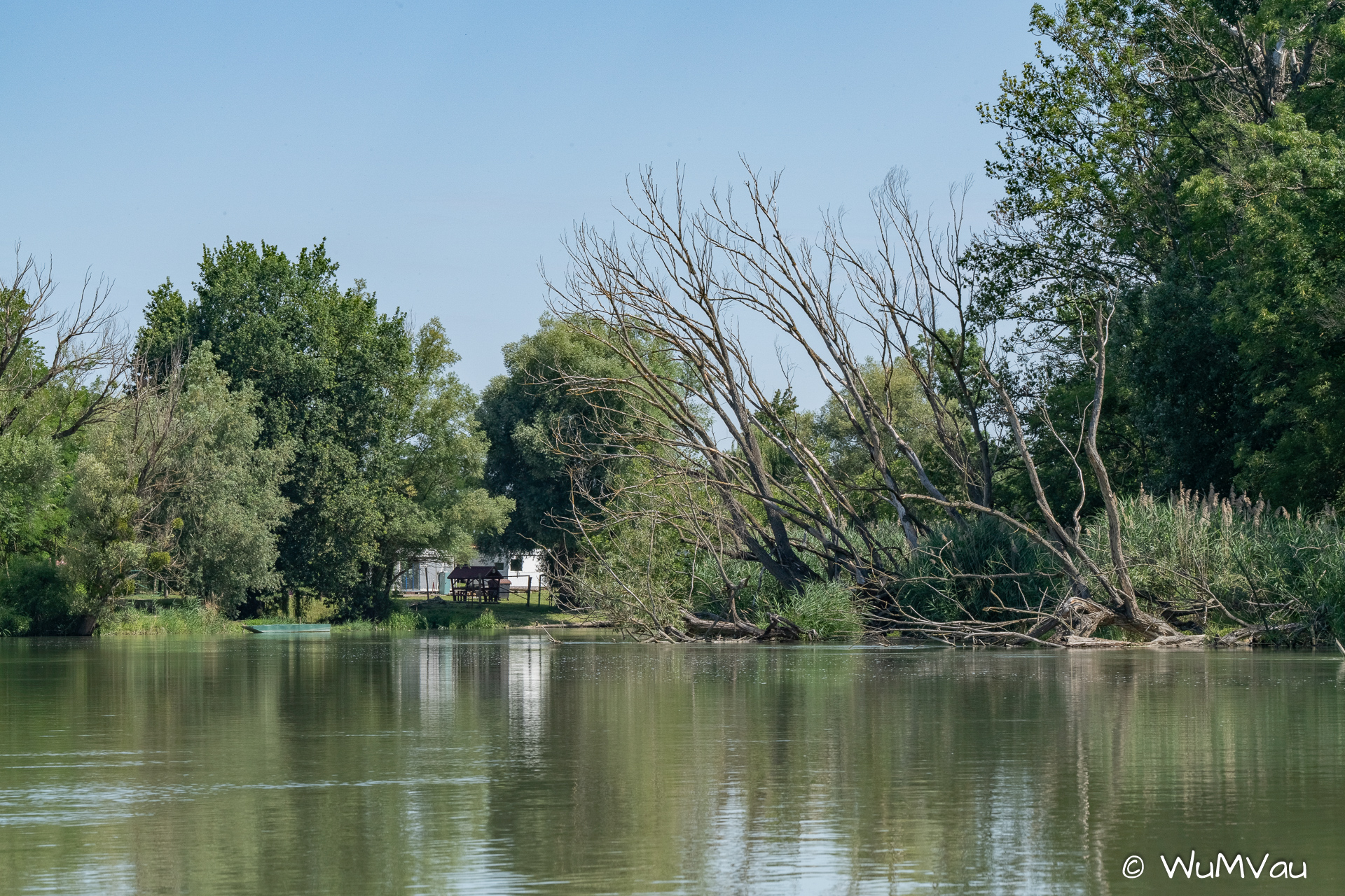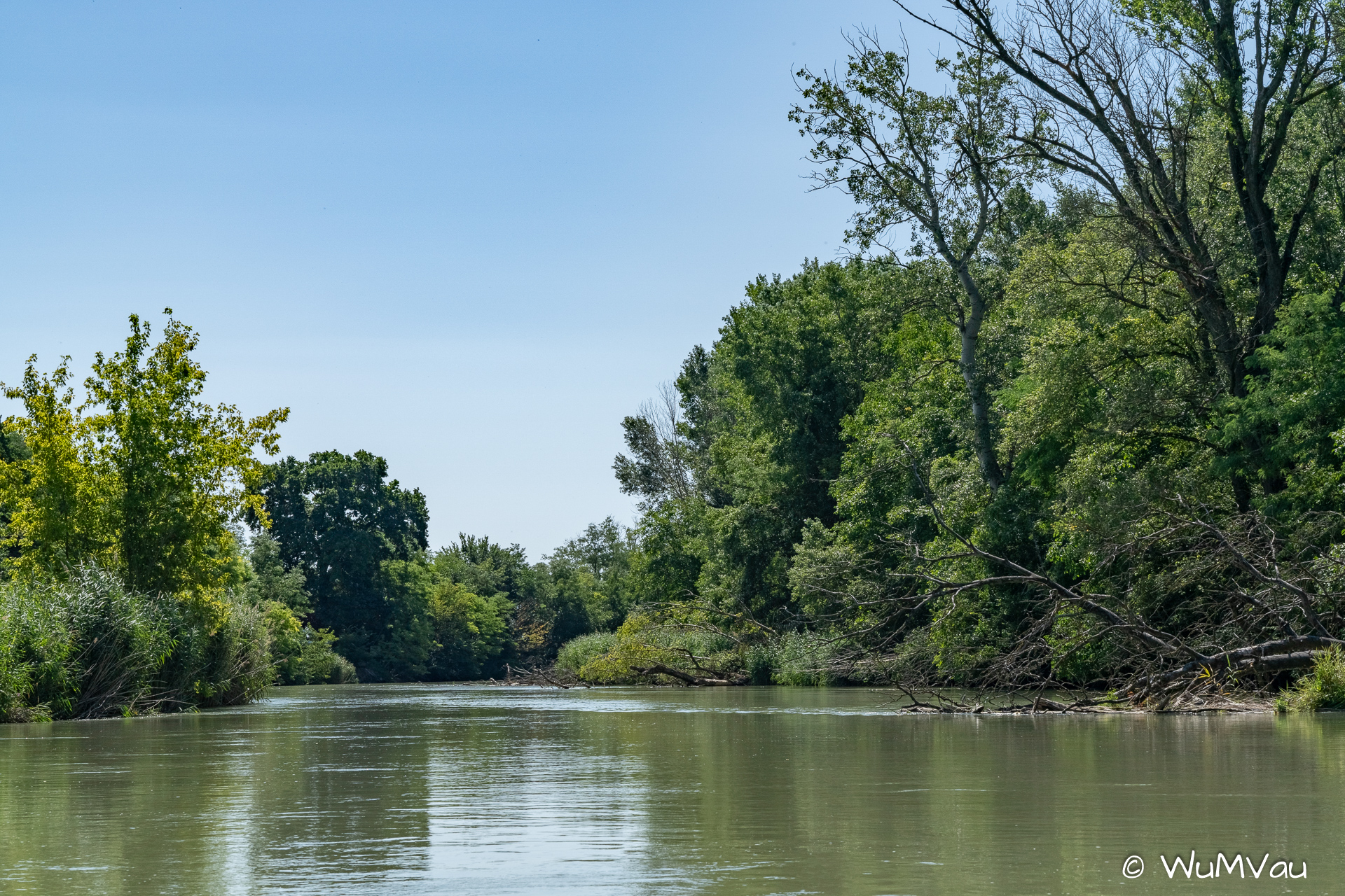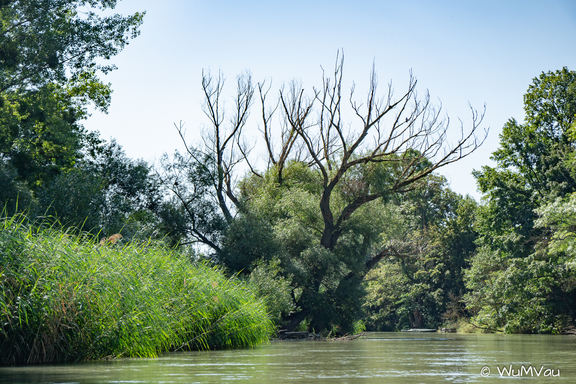 In der Früh scheint die Sonne und wir brechen bald auf. Da wir nahe einer langen Buhne unser Camp aufgeschlagen hatten, treideln wir ein Stück stromaufwärts, um sicher vorbei zu kommen. Wir haben starken Gegenwind, dank der Strömung kommen wir trotzdem gut voran und erreichen bald Bratislava. Kurz nach Bratislava macht sich der Staubereich des Kraftwerkes Gabcikovo bemerkbar. Bei Stromkilometer 1852 nahe des Wehrs Mosonske Rameno gehen wir an Land. Nun beginnt der bis jetzt härteste Teil unserer Reise. Bei 30 Grad ziehen wir unser Boot und die gesamte Ausrüstung bis zu einem Sperrwerk. Nach gut zwei Stunden sind wir dort und bringen unser Boot über einen steilen Abhang wieder ins Wasser. Wir haben die Mosoni Donau erreicht. Von diesem naturbelassenen Arm sind wir sofort fasziniert. Wir sehen viele Reiher, Kormorane und andere Vögel. Es liegen viele umgefallene Bäume im Wasser und wir müssen Slalom fahren um durchzukommen. Schließlich erreichen wir unser heutiges Tagesziel, den Campingplatz Rajka.