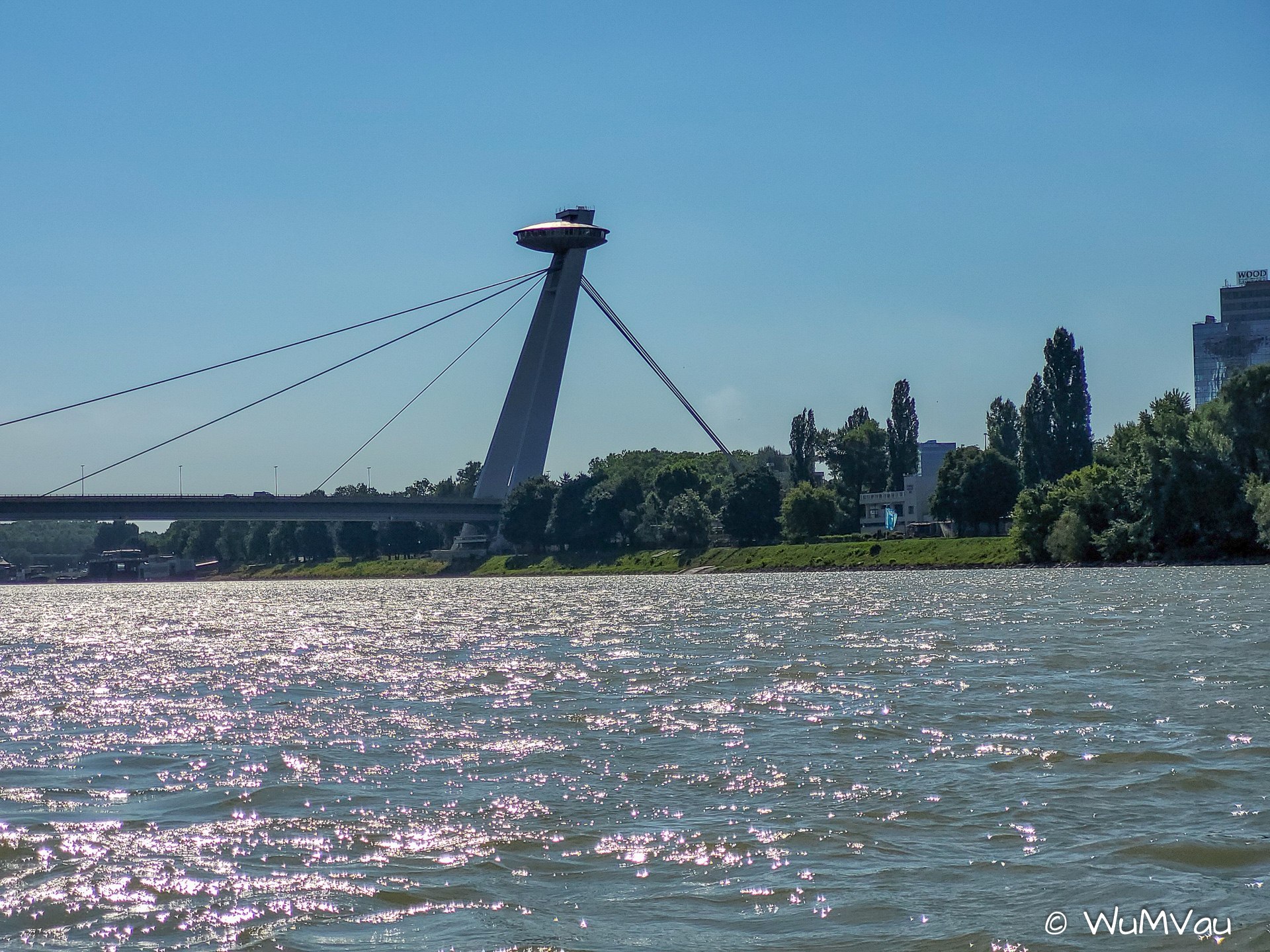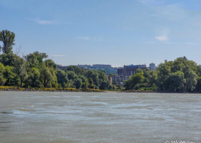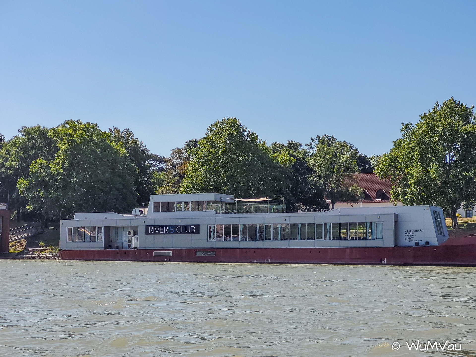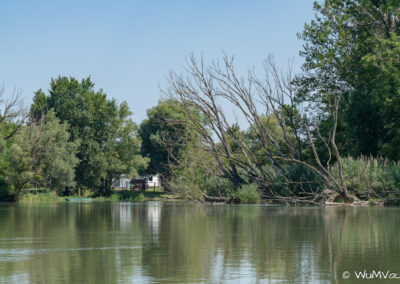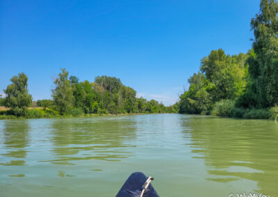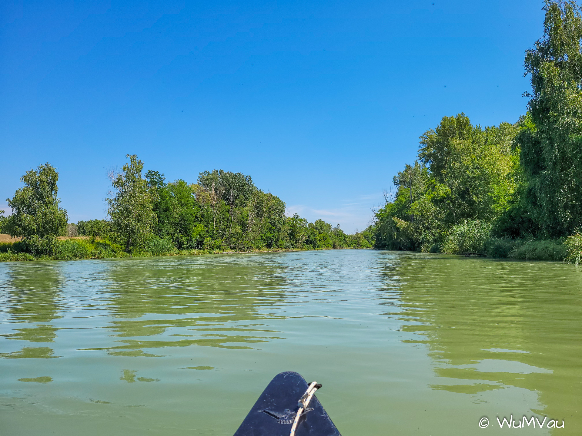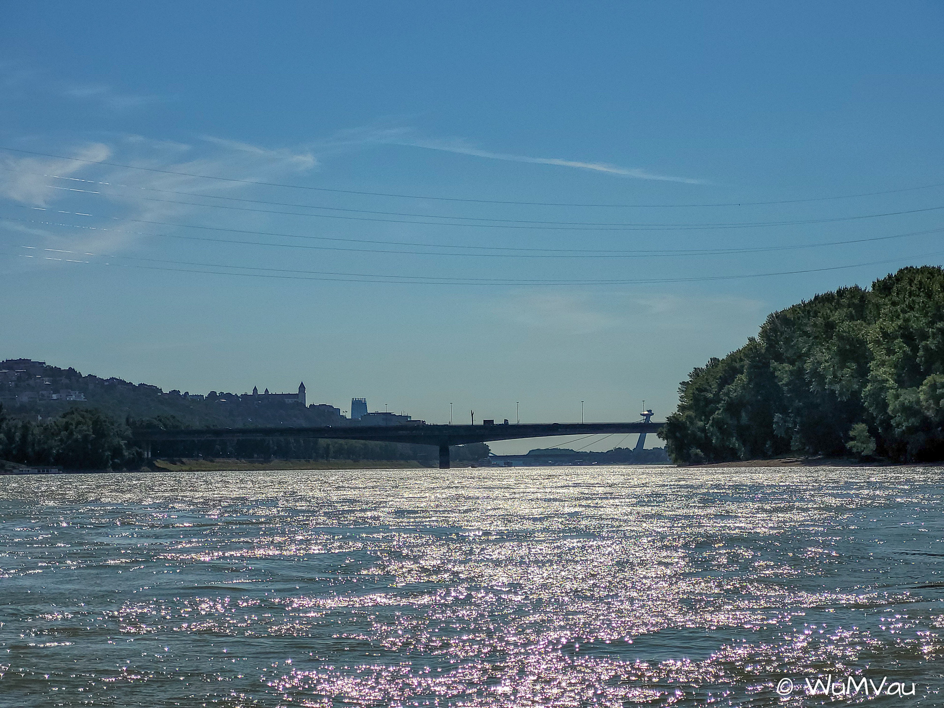 In der Früh scheint die Sonne und wir brechen bald auf. Da wir nahe einer langen Buhne unser Camp aufgeschlagen hatten, treideln wir ein Stück stromaufwärts, um sicher vorbei zu kommen. Wir haben starken Gegenwind, dank der Strömung kommen wir trotzdem gut voran und erreichen bald Bratislava. Kurz nach Bratislava macht sich der Staubereich des Kraftwerkes Gabcikovo bemerkbar. Bei Stromkilometer 1852 nahe des Wehrs Mosonske Rameno gehen wir an Land. Nun beginnt der bis jetzt härteste Teil unserer Reise. Bei 30 Grad ziehen wir unser Boot und die gesamte Ausrüstung bis zu einem Sperrwerk. Nach gut zwei Stunden sind wir dort und bringen unser Boot über einen steilen Abhang wieder ins Wasser. Wir haben die Mosoni Donau erreicht. Von diesem naturbelassenen Arm sind wir sofort fasziniert. Wir sehen viele Reiher, Kormorane und andere Vögel. Es liegen viele umgefallene Bäume im Wasser und wir müssen Slalom fahren um durchzukommen. Schließlich erreichen wir unser heutiges Tagesziel, den Campingplatz Rajka.