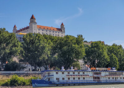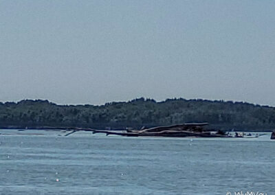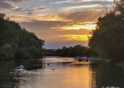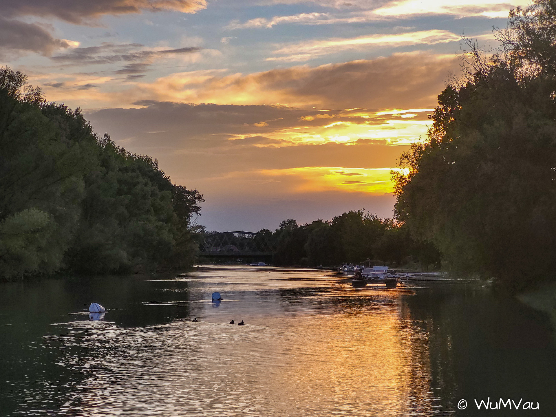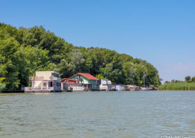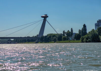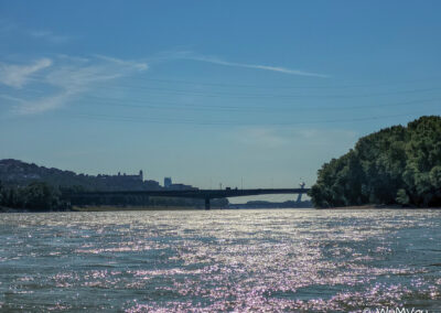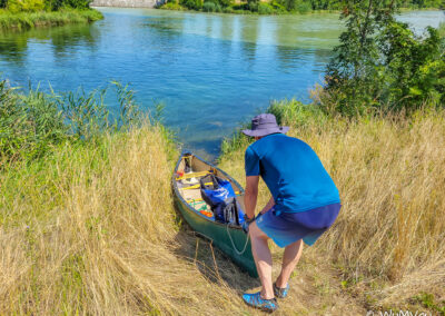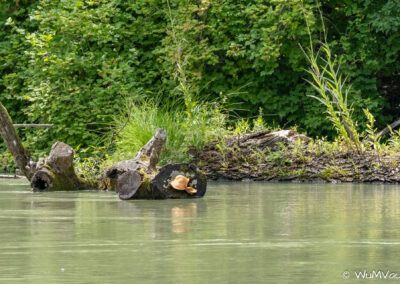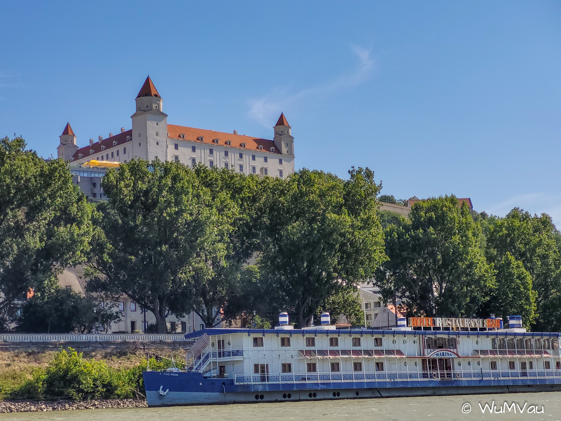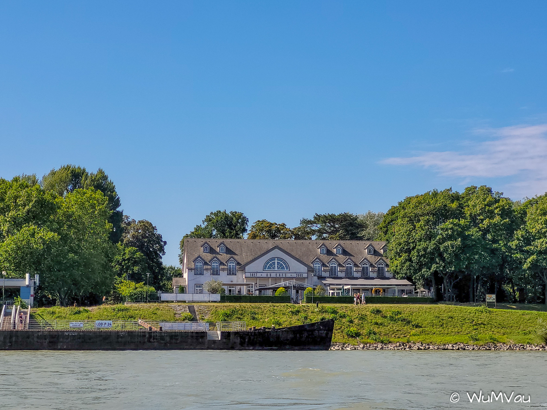 In der Früh scheint die Sonne und wir brechen bald auf. Da wir nahe einer langen Buhne unser Camp aufgeschlagen hatten, treideln wir ein Stück stromaufwärts, um sicher vorbei zu kommen. Wir haben starken Gegenwind, dank der Strömung kommen wir trotzdem gut voran und erreichen bald Bratislava. Kurz nach Bratislava macht sich der Staubereich des Kraftwerkes Gabcikovo bemerkbar. Bei Stromkilometer 1852 nahe des Wehrs Mosonske Rameno gehen wir an Land. Nun beginnt der bis jetzt härteste Teil unserer Reise. Bei 30 Grad ziehen wir unser Boot und die gesamte Ausrüstung bis zu einem Sperrwerk. Nach gut zwei Stunden sind wir dort und bringen unser Boot über einen steilen Abhang wieder ins Wasser. Wir haben die Mosoni Donau erreicht. Von diesem naturbelassenen Arm sind wir sofort fasziniert. Wir sehen viele Reiher, Kormorane und andere Vögel. Es liegen viele umgefallene Bäume im Wasser und wir müssen Slalom fahren um durchzukommen. Schließlich erreichen wir unser heutiges Tagesziel, den Campingplatz Rajka.