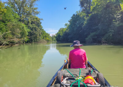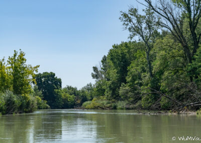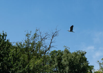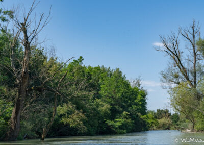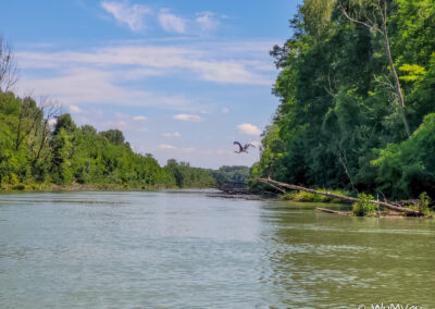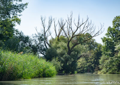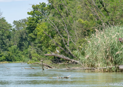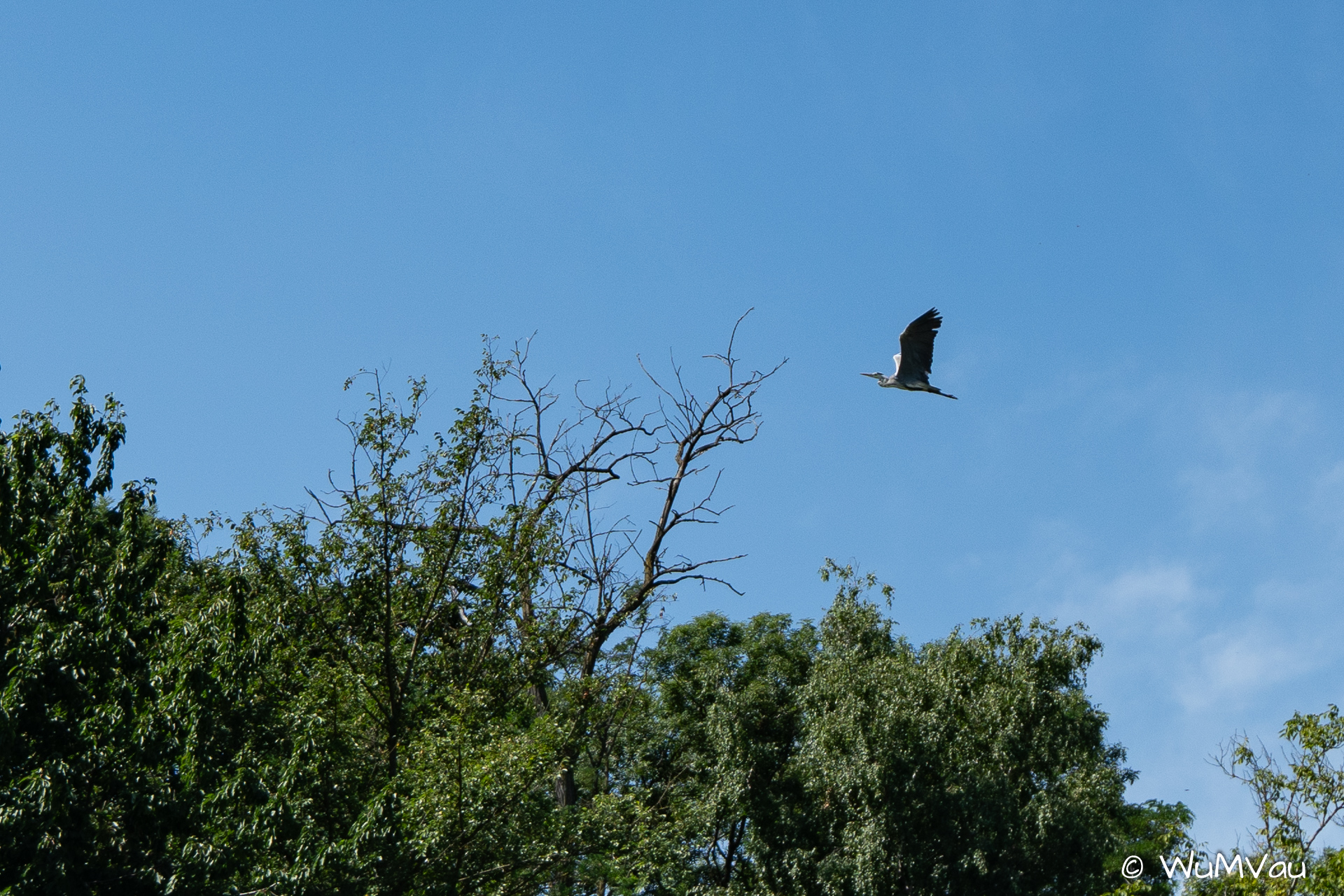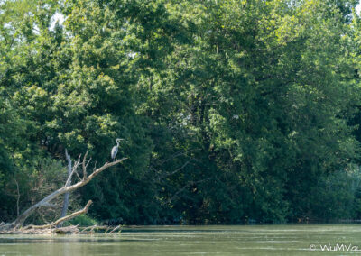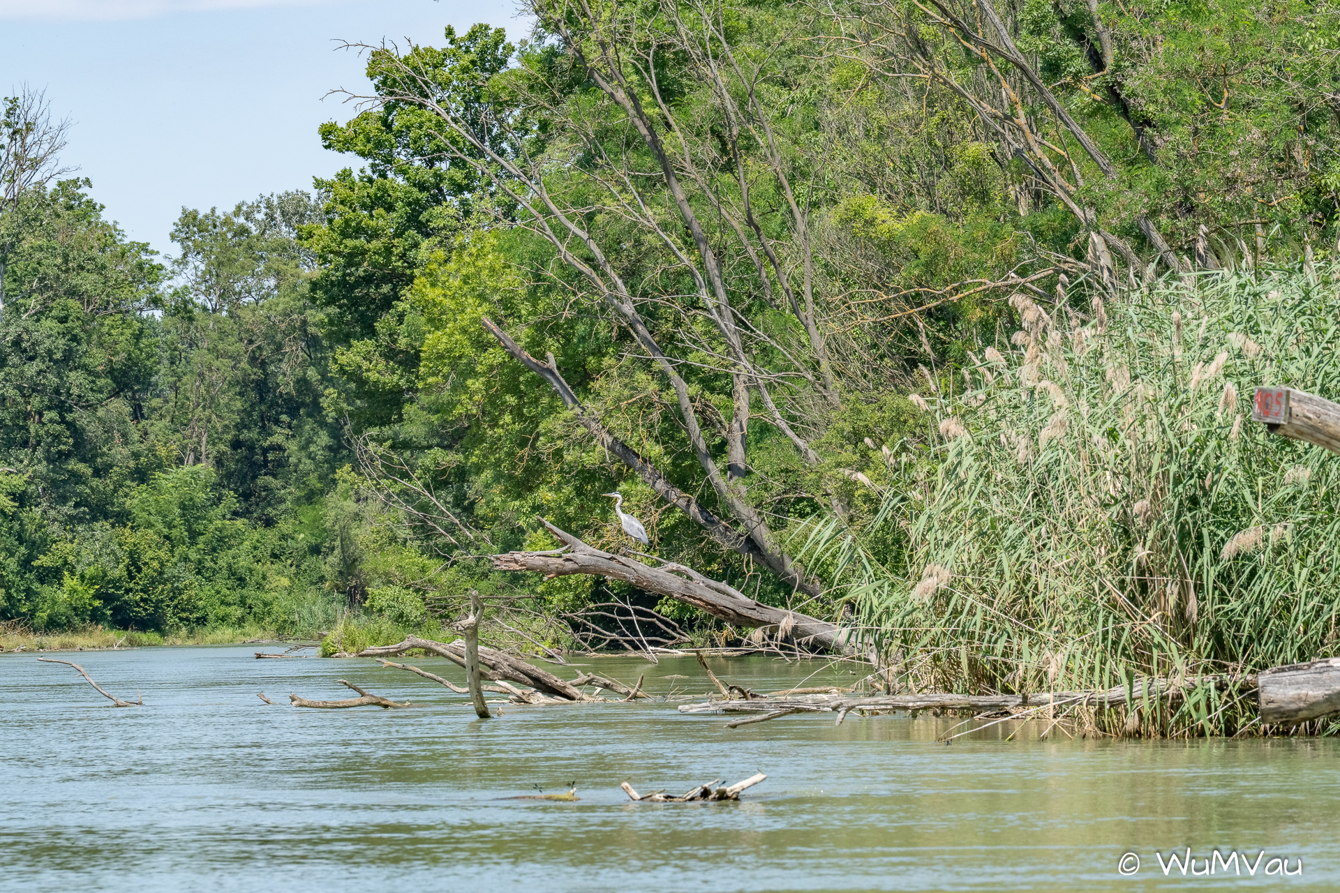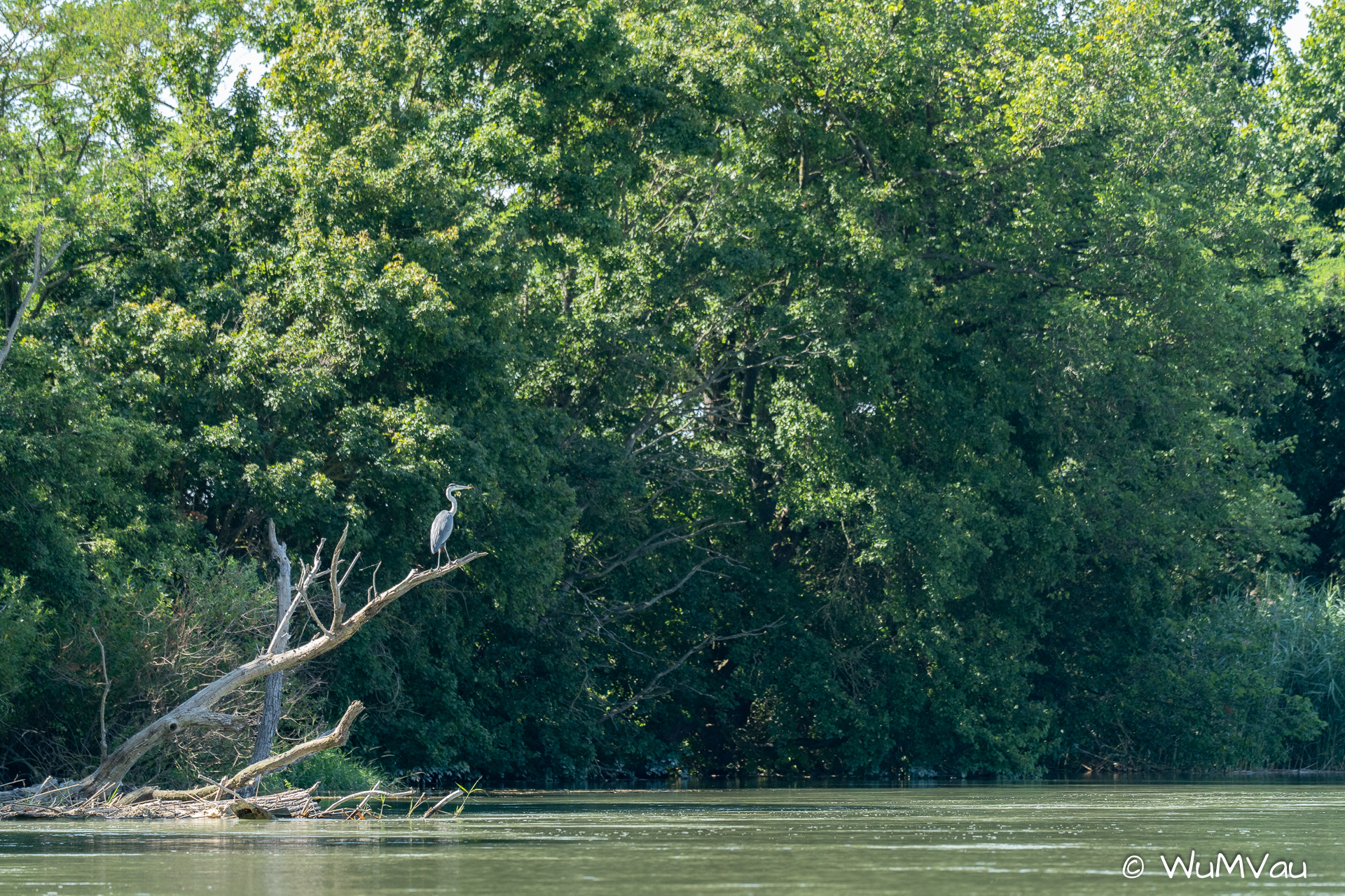 Wir starten heute bei strahlendem Sonnenschein und es wird schnell sehr heiß. Die Strömung ist anfangs noch sehr gut, wird aber immer schwächer. In der naturbelassenen Landschaft fühlen sich die Graureiher wohl. Sie sind aber sehr scheu, fotografieren ist schwierig. Immer wieder gibt es Verblockungen, die wir umfahren müssen. Viele Prachtlibellen schwirren umher und in den Schilfzonen quaken die Frösche. Stellenweise lassen wir uns treiben und genießen die Natur.